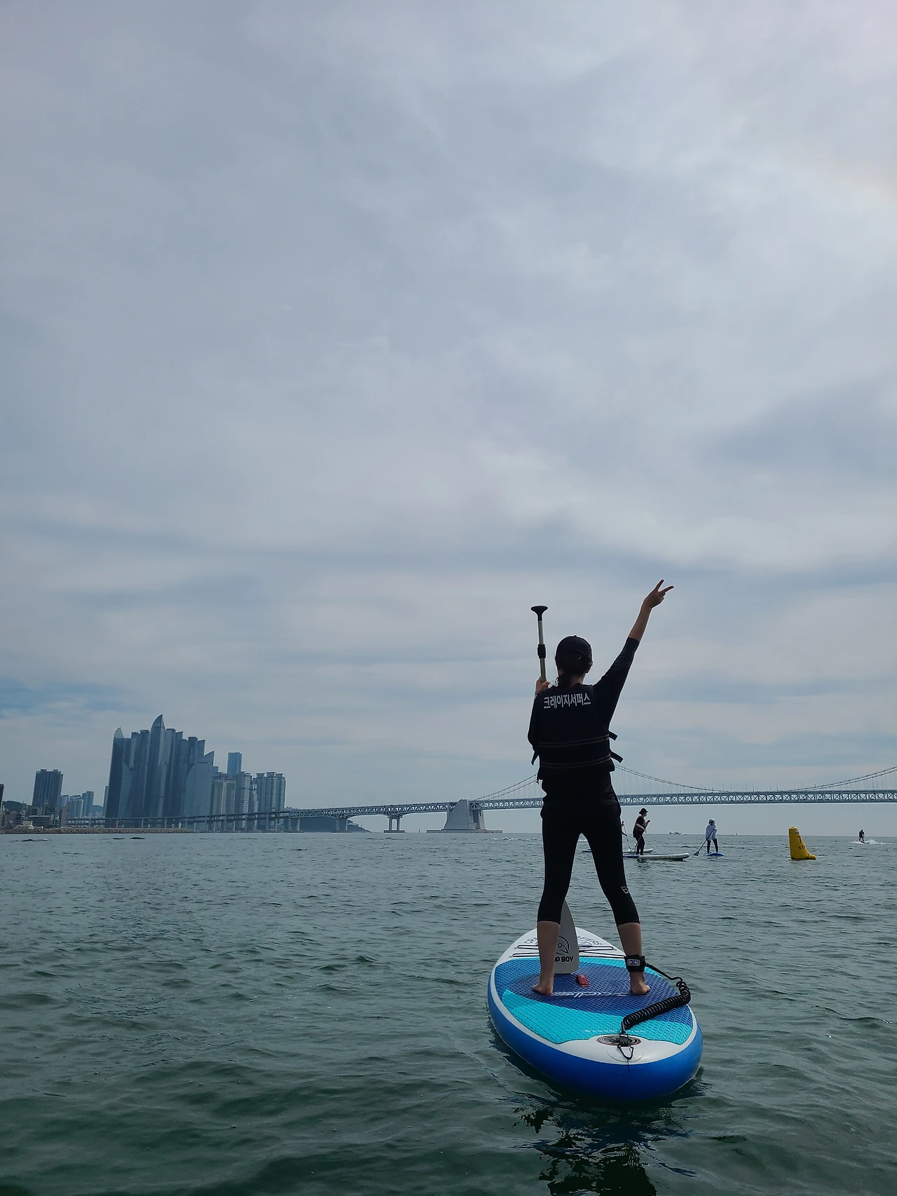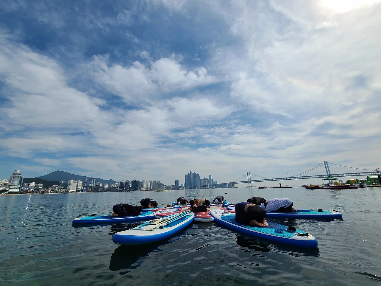 요가가 끝나고 자유 패들 시간. 광안 대교를 지상보다 가까운 바다 위 패들 위에서 바라보는 것만으로도 힐링이다. 유유자적 여유롭게 보드 위 누워도 있어보고, 일어서서 시원한 바람을 한껏 맞으며 힘껏 노를 저어 속도도 내본다.