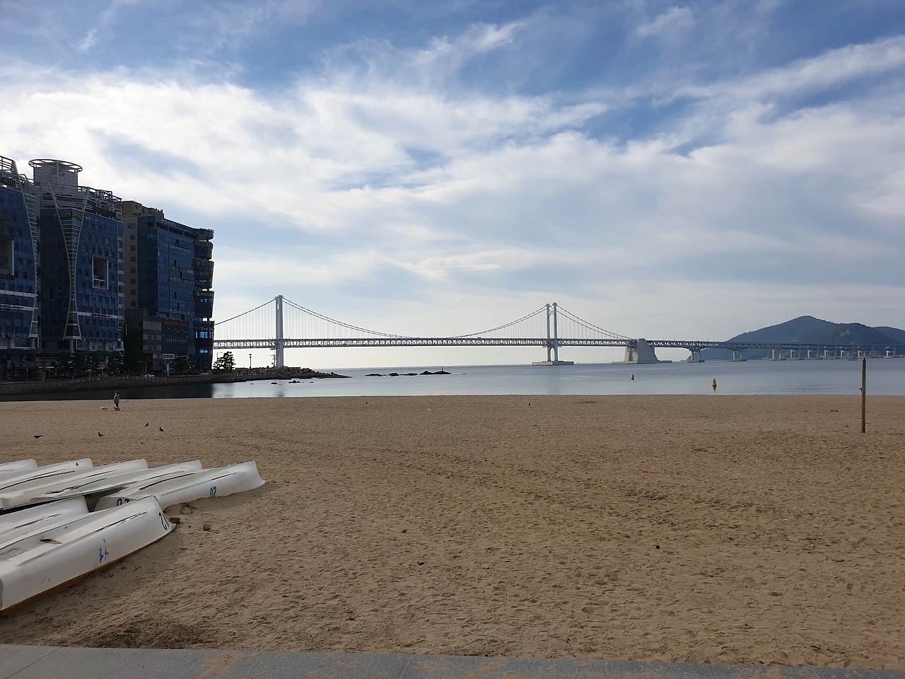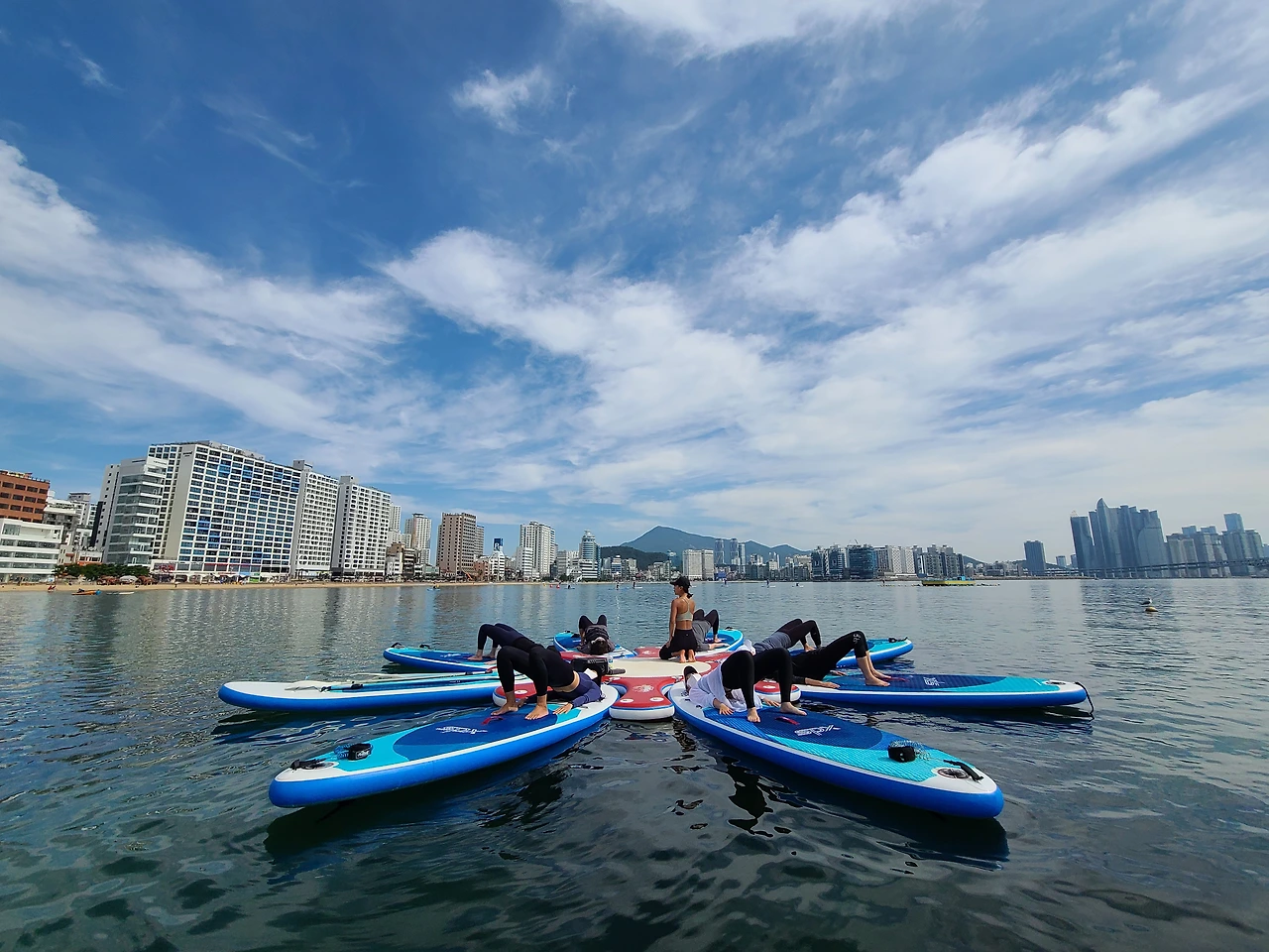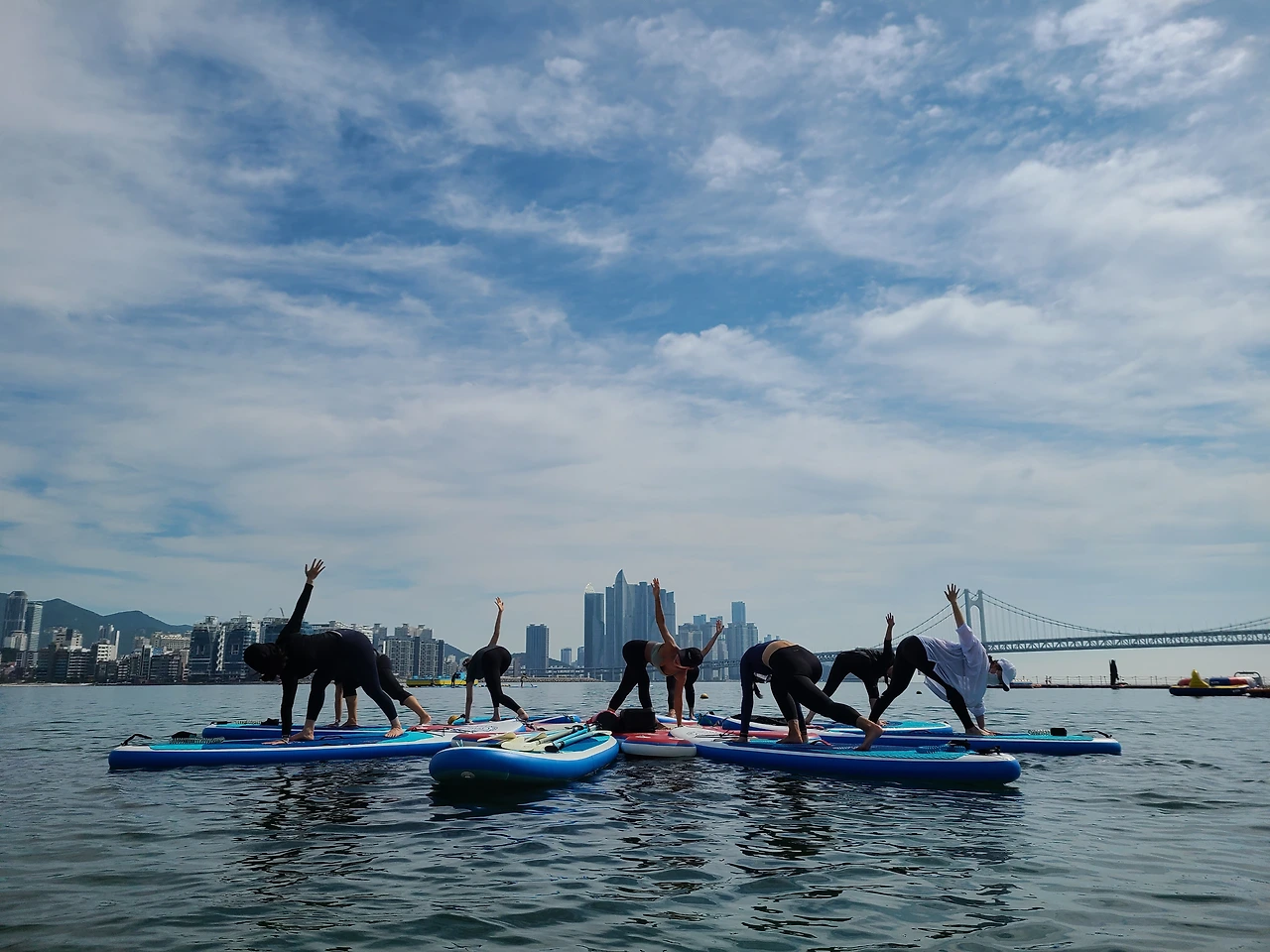 풍덩하고 물에 한번 들어갔다 나오니 바다 짠물에 코가 따갑긴 하지만, 9월임에도 불구하고 아직은 더운 날씨로 마침 땀이 나던 차에 시원했다. 땀에 젖은 몸을 물기로 적시니, 불어오는 바람결에도 그만 시원함이 묻어난다. 광안대교를 풀샷 배경으로 왼쪽 귀엔 파도 소리, 오른쪽 귀엔 요가 선생님이 틀어놓은 음악소리로 가득 채운다. 오랜만에 해보는 요가 동작에 찌뿌둥하던 몸이 제대로 기지개를 켠다. 쨍한 햇빛과 그림 같은 구름, 청량한 하늘빛에, 들이마시는 숨에 소금기 머금은 바다 짠내음이 몸속 깊숙이 들어와 마치 바다와 내가 하나가 된 듯하다가, 내시는 숨에 빠져나가는 썰물의 파도처럼 그동안 쌓인 스트레스가 모두 날아가는 느낌이다.