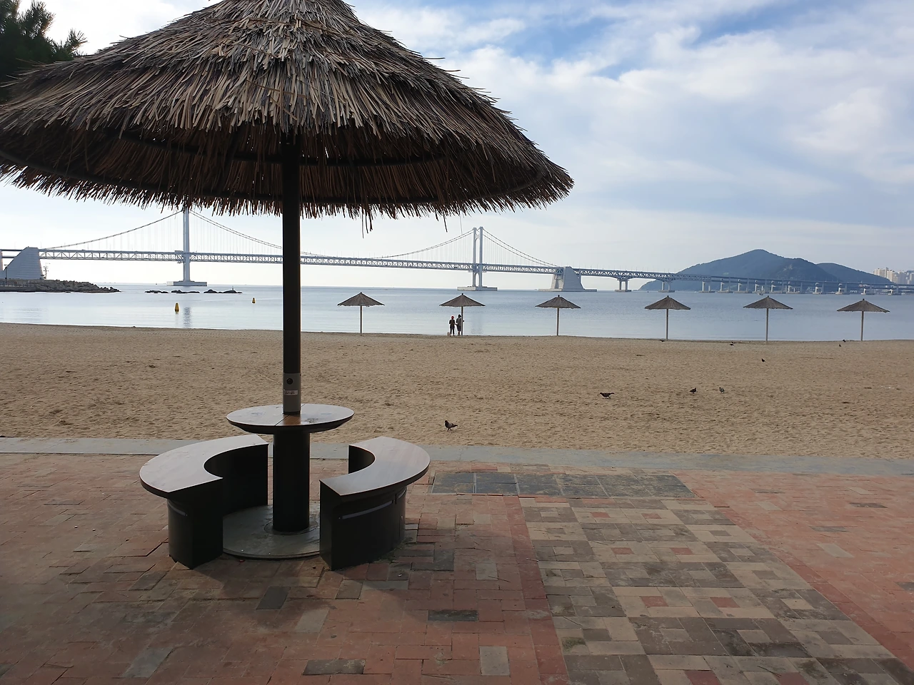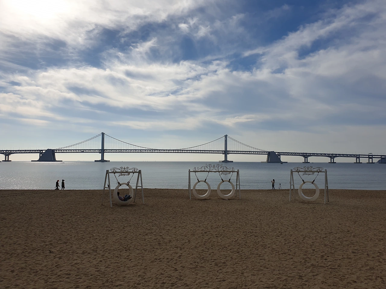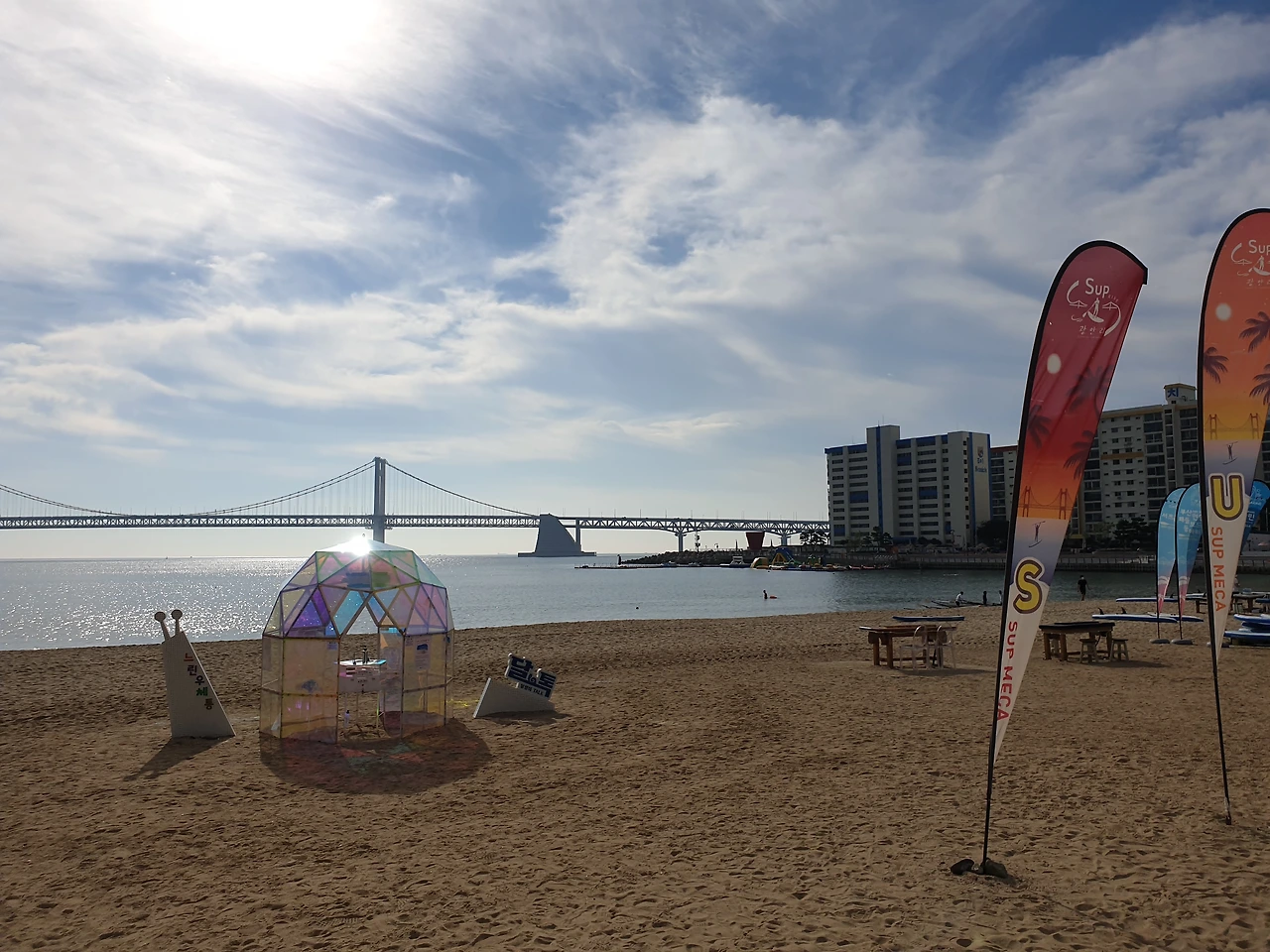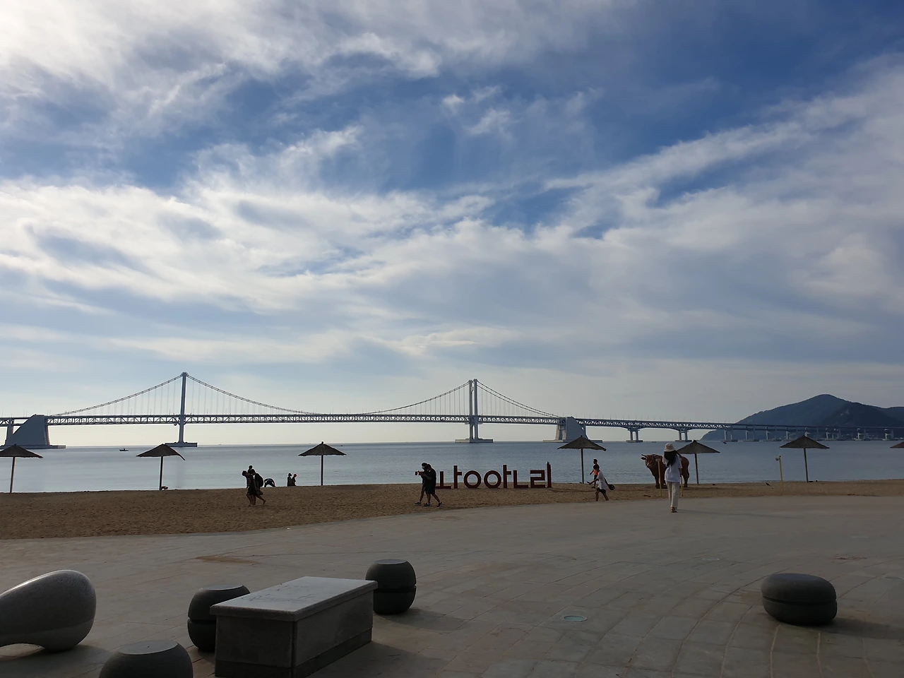 풍덩하고 물에 한번 들어갔다 나오니 바다 짠물에 코가 따갑긴 하지만, 9월임에도 불구하고 아직은 더운 날씨로 마침 땀이 나던 차에 시원했다. 땀에 젖은 몸을 물기로 적시니, 불어오는 바람결에도 그만 시원함이 묻어난다. 광안대교를 풀샷 배경으로 왼쪽 귀엔 파도 소리, 오른쪽 귀엔 요가 선생님이 틀어놓은 음악소리로 가득 채운다. 오랜만에 해보는 요가 동작에 찌뿌둥하던 몸이 제대로 기지개를 켠다. 쨍한 햇빛과 그림 같은 구름, 청량한 하늘빛에, 들이마시는 숨에 소금기 머금은 바다 짠내음이 몸속 깊숙이 들어와 마치 바다와 내가 하나가 된 듯하다가, 내시는 숨에 빠져나가는 썰물의 파도처럼 그동안 쌓인 스트레스가 모두 날아가는 느낌이다.