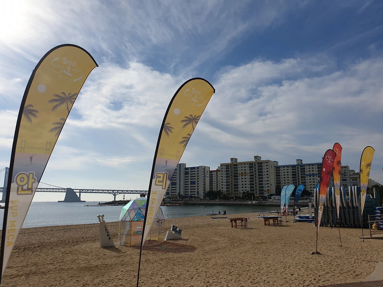 광안리에 사는 동생네 근처에 차를 대고 백사장을 따라 보드 숍을 향해 걸어간다. 걷다 보면 주말 이른 아침에도 조깅과 자전거, 산책을 위해 나온 편안한 복장의 사람들 사이로 선글라스와 헐벗은 복장의 관광객들로 짐작되는 행인들도 언뜻 보인다. 나의 사랑 광안리는 이렇듯 많은 사람들에게 아침부터 예쁨으로 열일 중이다. 열일로 치자면 워커홀릭에 가까운 그 풍경은 보드 예약시간이 촉박함에도 불구하고 나의 발길을 자꾸만 사로잡는다. 그저 예쁜 게 죄라면, 거의 무기징역 감인 광안리!