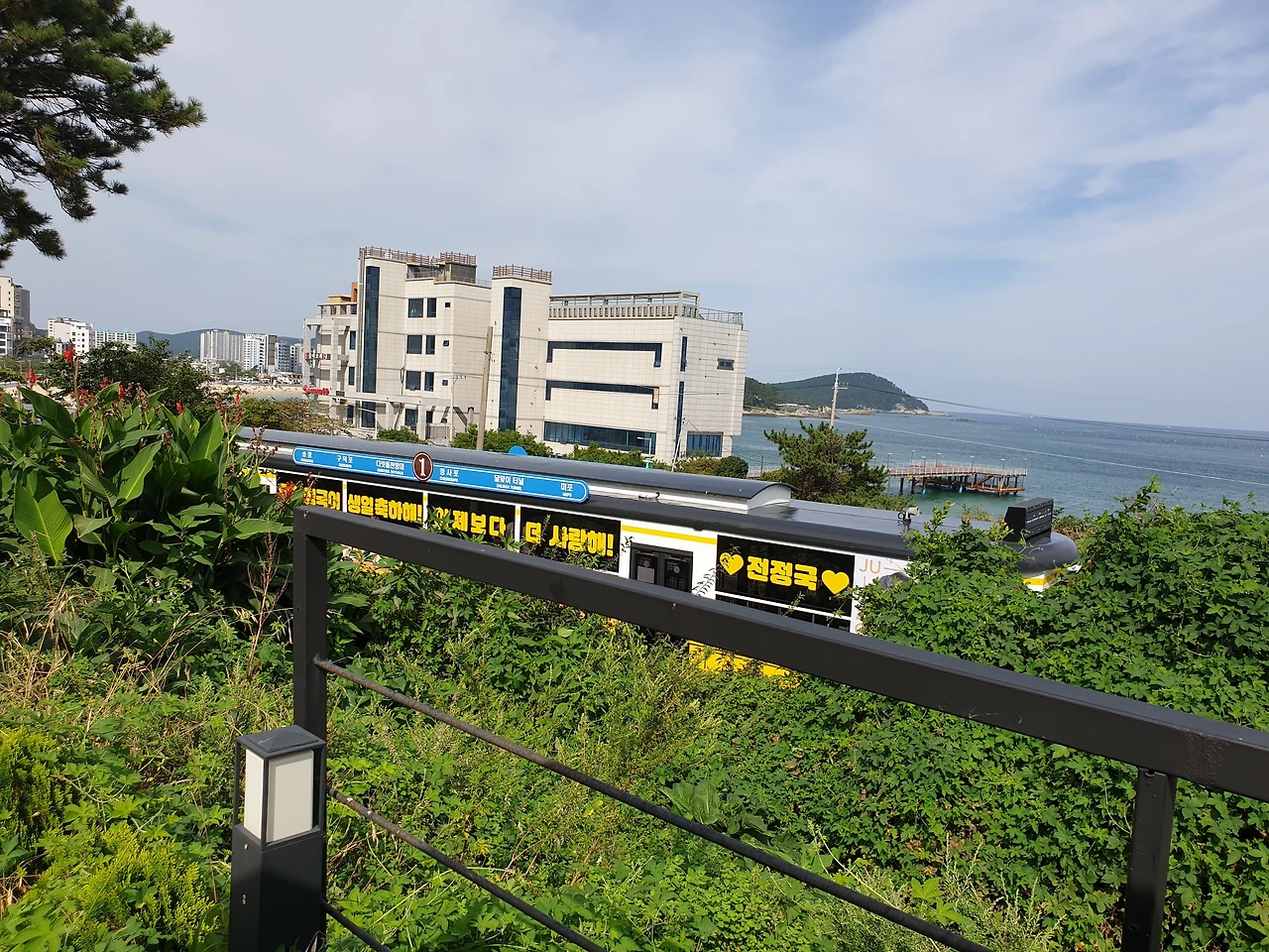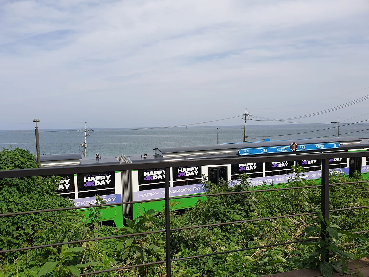 방탄소년단 정국이 생일이 오늘인가 보다. 펼쳐진 바다 뷰를 뚫고 지나다니는 색색깔 기차마다 오늘이 탄신일임을 알리는 생일 축하 메시지를 선물한 소녀들의 팬덤이 귀여워 미소 짓다 사진에 담았다.