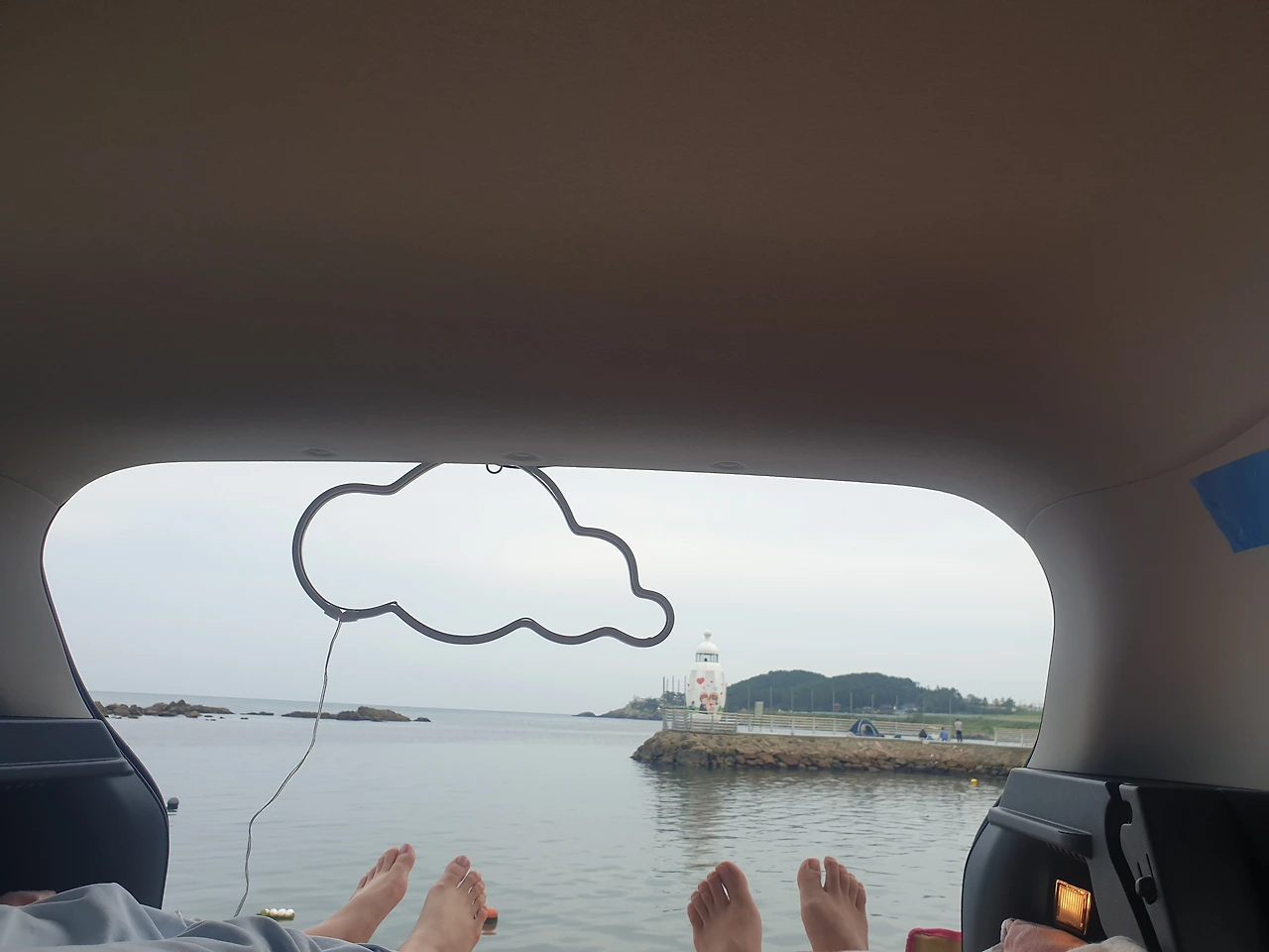 누워서 충분한 휴식 뒤, 노을을 볼 때까지 기다렸다 저녁을 먹자 했던 우리는 6시가 훌쩍 넘어도 전혀 붉어지지 않는 하늘에 그제야 여기가 해가 제일 먼저 뜨는 곳에 가까운 정동쪽 바다임을 눈치챈다. 붉은 노을 대신 검은 어둠 결에 밝아온 노란 트렁크 불이 눈에 들어오며, 바테리 방전 걱정에 차량 매뉴얼과 인터넷 폭풍 검색해본다. 마땅한 아이템을 미처 준비 못해 온 나는 차량 닫히는 부분에 무언가 끼워넣기를 시도해보다 혹여 차가 망가질까 걱정돼 그냥 포기하고, 저녁이나 먹으러 가기로 한다. 까짓것 방전되면 애니카 한번 부르지머.