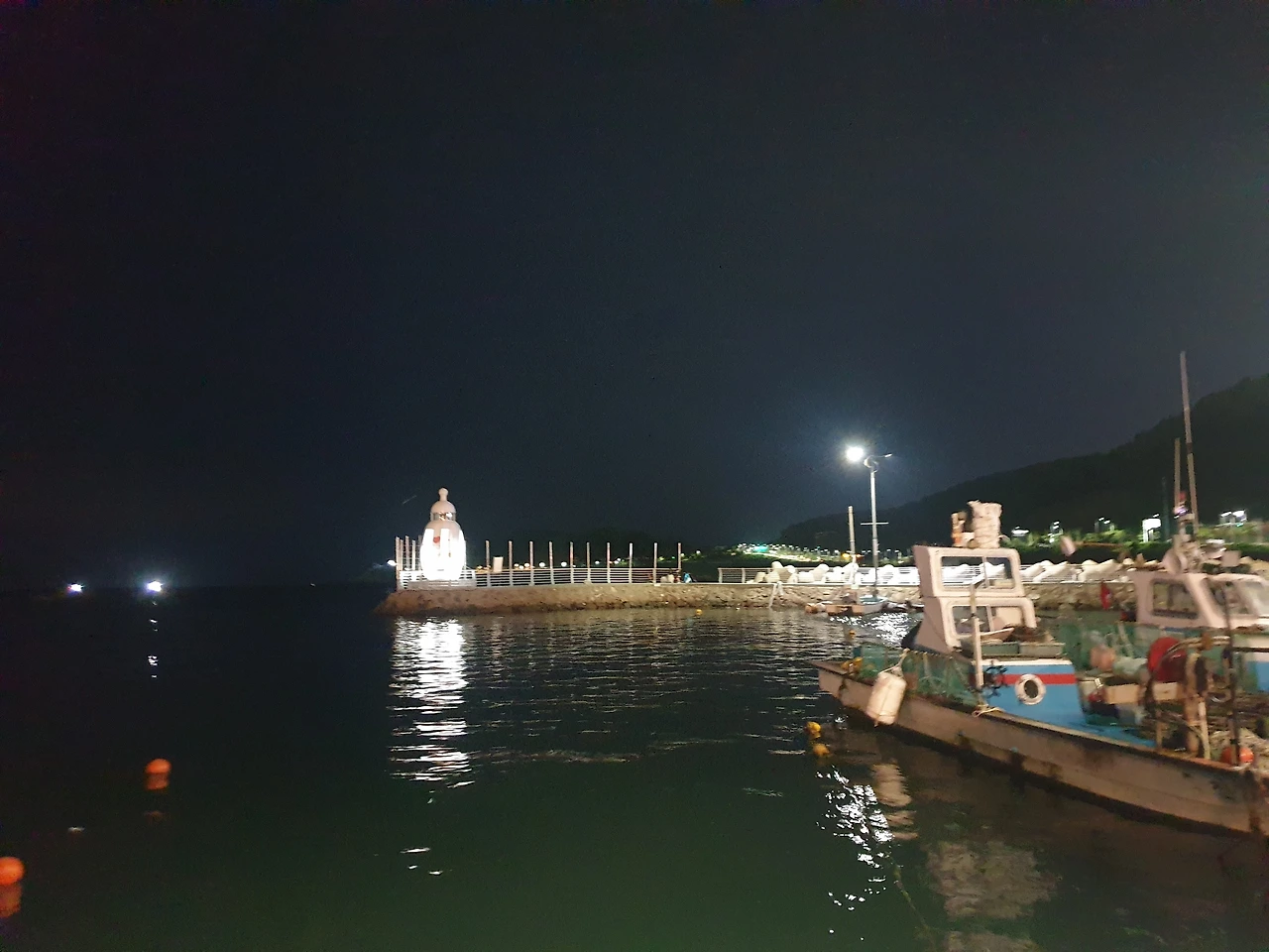 저녁 식사 후 핸드폰 바테리가 많이 남지 않은 나는, 음악 DJ 바통을 동생에게 넘겨줬다. 블루투스로 그녀가 선곡한 곡들, 특히 우리가 좋아하는 곡들이 조용한 바다 위로 퍼지며 마치 밤바다의 고요함이 서라운드 스피커가 된 것처럼 더 깊고 웅장하게 바다와 우리의 감성에 울려 퍼지기 시작한다. 의자에 기대어 앉은 채 적막한 암흑 속 불 켜진 등대로 밝혀진 바다 멍을 때리며, 꽃 차 한 잔과 그날의 등대 불빛 밤 분위기 한 모금으로 오랜 시간 차박에 메말랐던 목을 축인다.