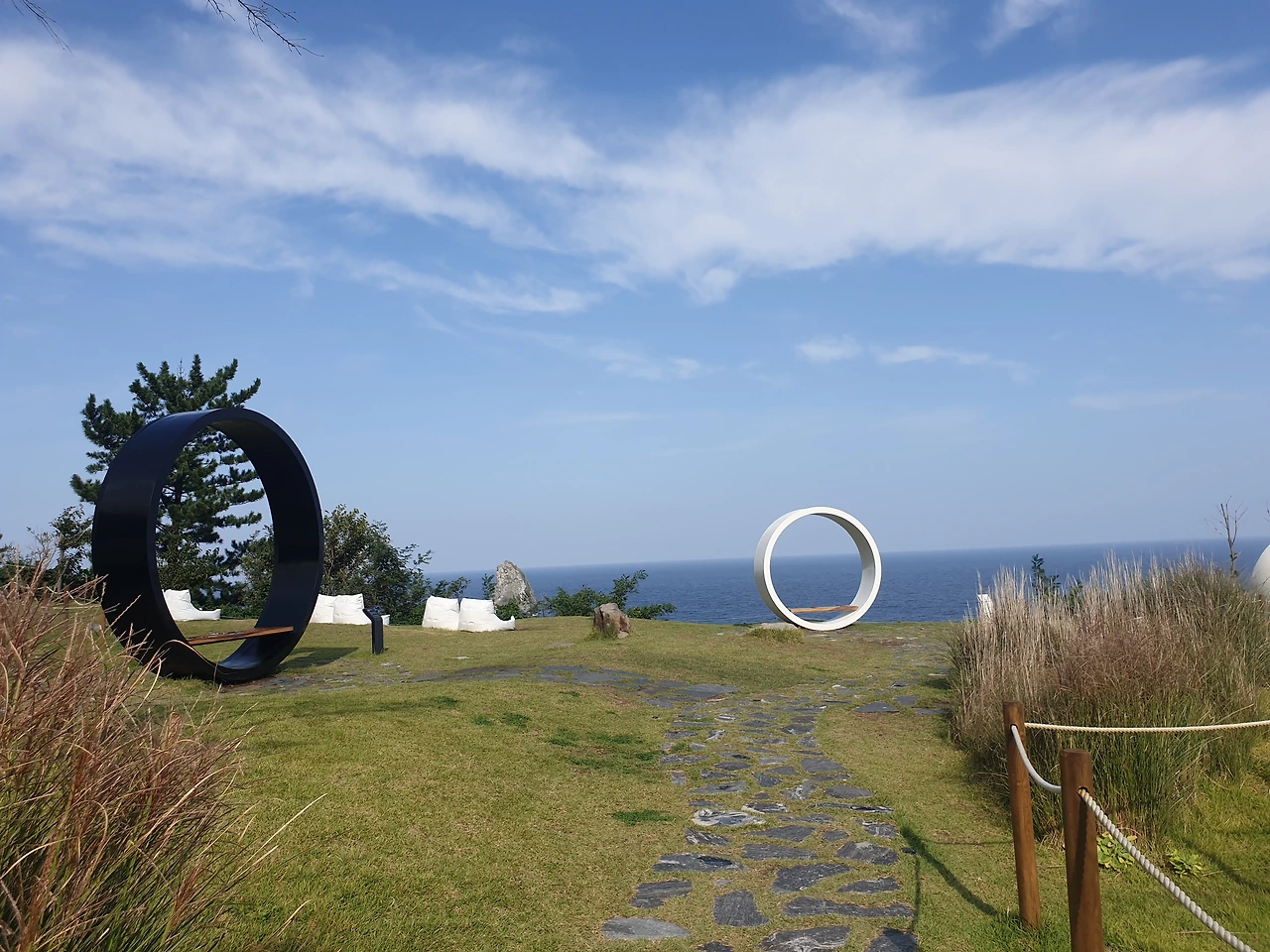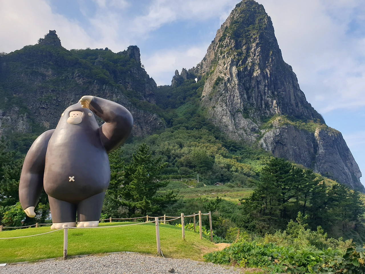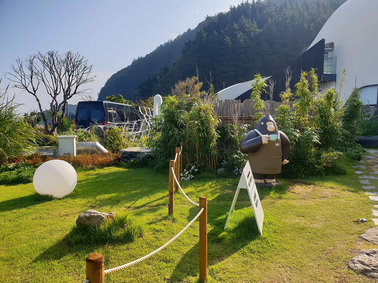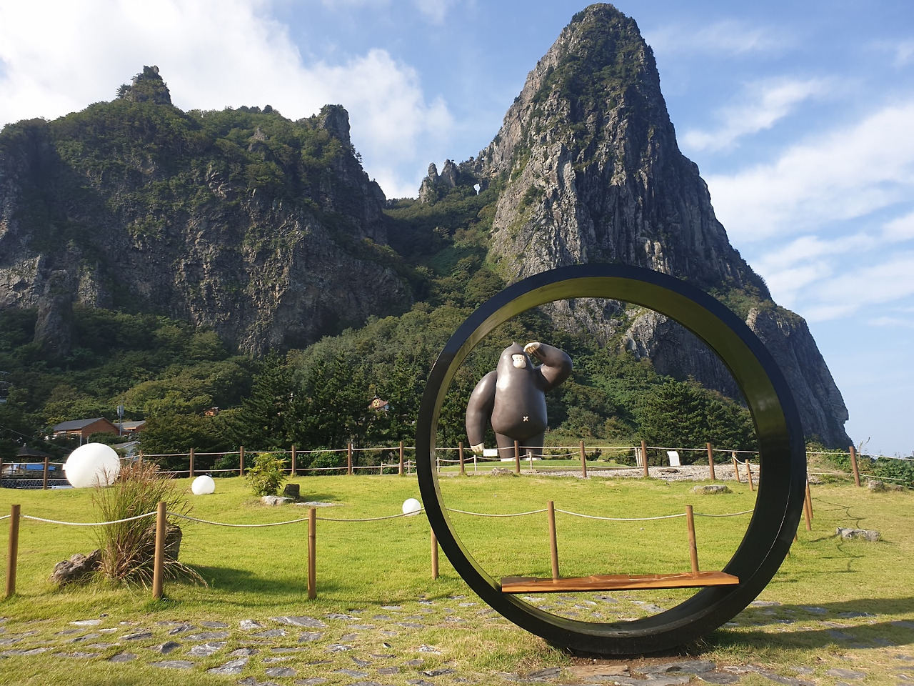 울릉도 '울'에 고릴라 '라'의 일명 카페 울라에서는 마치 제인이 타잔이 아닌 고릴라와 사랑에 빠질 것만 같은 사랑스러운 비주얼의 고릴라와 같은 포즈로 한컷 사진을 찍을 수 있다. 바로 옆은 건축상을 수상한 멋진 외관에 추산의 기를 받을 수 있다는 1박에 1천만 원 이상을 호가하는 코스모스 리조트가 자리 잡고 있다. '음'을 뜻하는 검은색 링과 '양'을 뜻하는 하얀색 링에서 음양의 조화를 이룰 사진도 찍고, 탁 트인 바다를 바라보고 있는 추산의 멋스러움을 즐기다 보니, 어느새 멀리서부터 사람들이 여럿 몰려오는 게 보여 번잡함을 피해 자리를 이동한다.