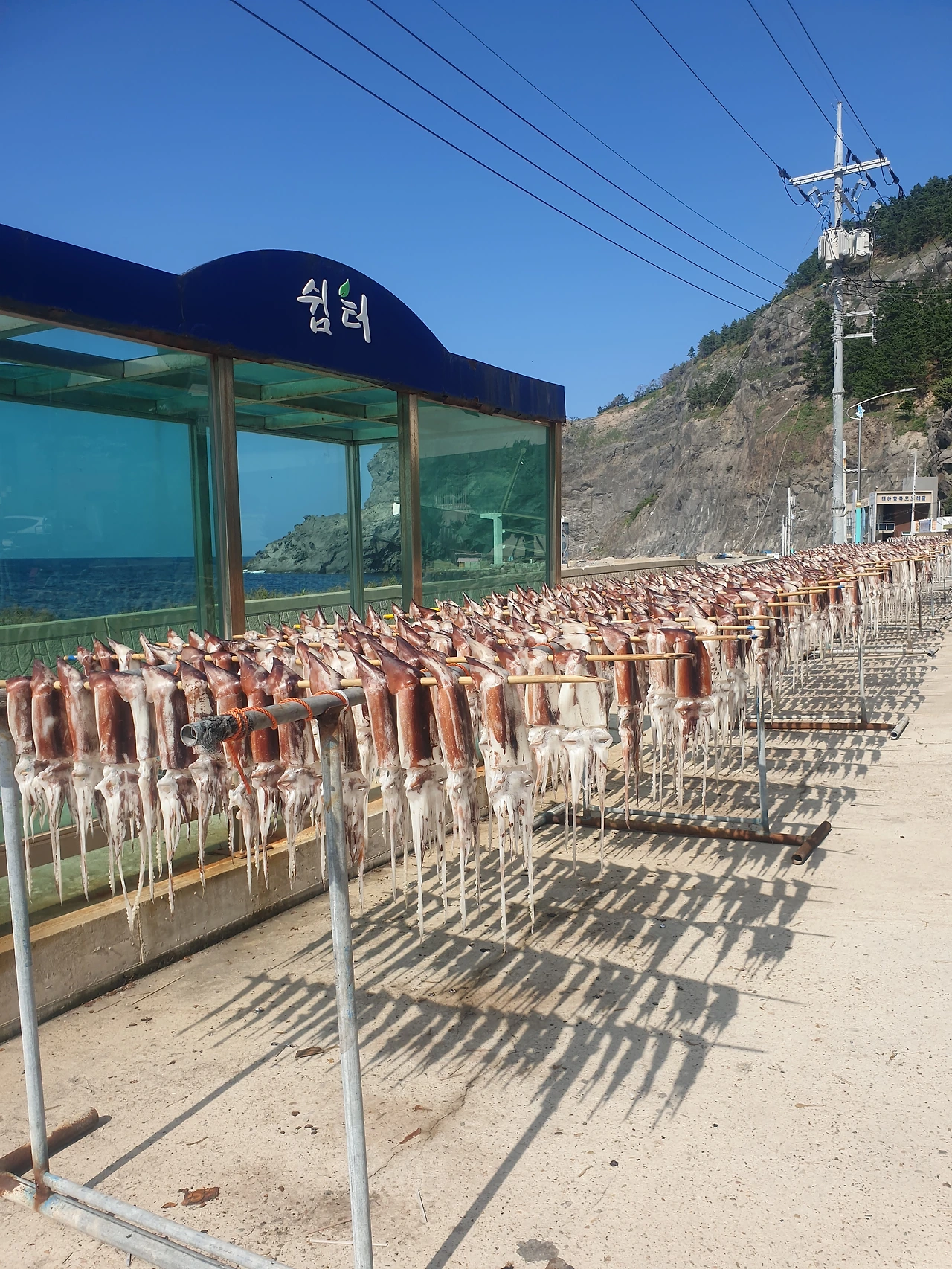 계속 바라보다 보면 파란 물빛깔에 동화되어 스머프가 될 것 만 같았던 신비한 바닷속 구경을 실컷 마친 우리는 렌터카 업체에서 알려주신 추천지 중 하나인 태하항이 마침 숙소 근처에 있어 지난밤 숙취에서 미처 깨어나지 못한 일행 한 명을 마저 싣고 독도행 배편을 타기 위해 지나면서 가보기로 했다. 어디로 가야할지 몰라 지나가는 주민께 물었더니, 모노레일은 현재 운행 중단되었으나 그 옆길로 오르면 우리나라 10대 비경을 맛볼 수 있다는 얘기를 전해 듣고 사전에 미처 이런 정보를 접하지 못한 우리는 울릉 8경을 말씀하시는 건가 고개를 갸웃하며 알려주신 방향으로 향해본다. 사실 이런 한적한 풍경의 평범한 어촌 마을에서 우리나라 10대 비경이라니 쉽게 상상하기 어려웠다. 지나가는 길 울릉도에는 오징어가 무척 유명하다는 것을 이 동네가 온몸으로 표현하고 있는 듯한 귀여운 정경도 맛볼 수 있다.