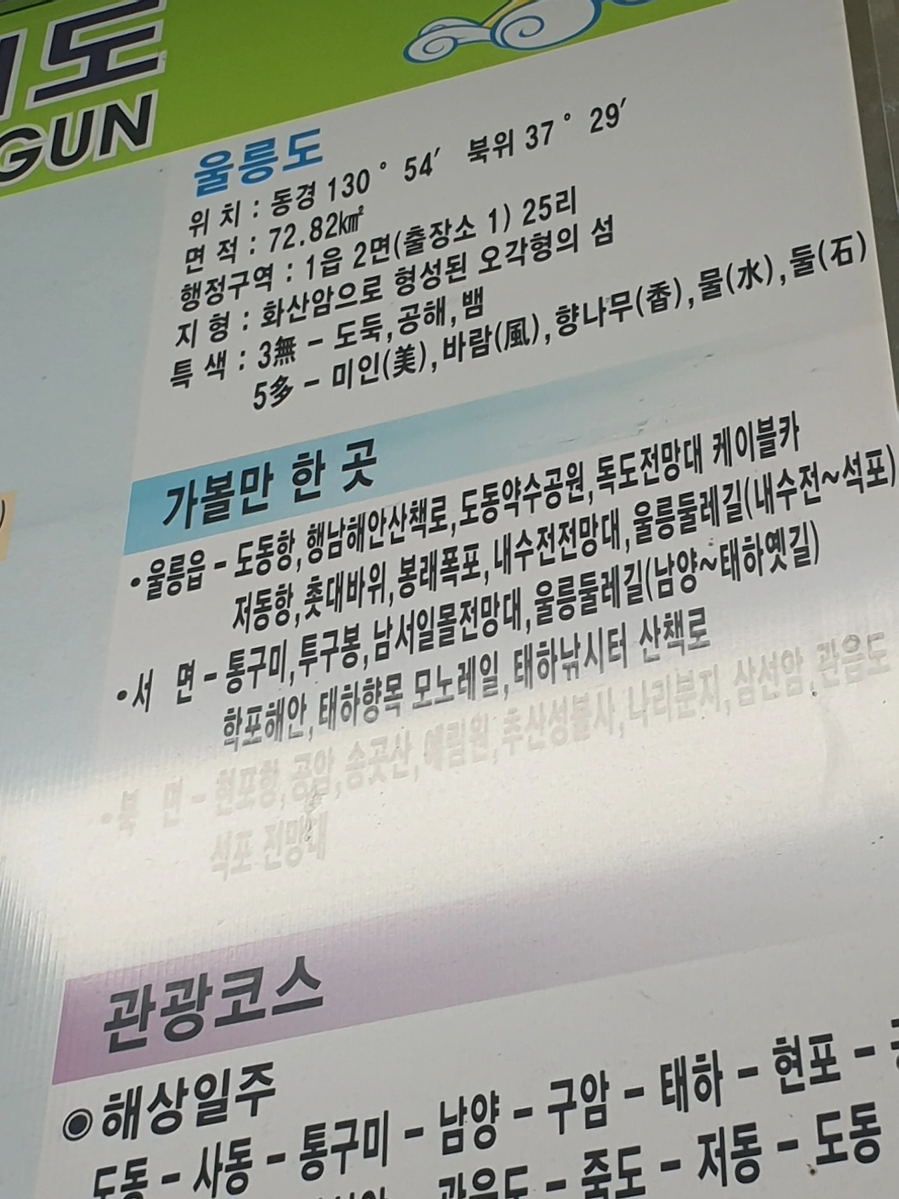 관광안내지도에도 쓰여있듯, 한번쯤 들어보았을 법한 울릉도 특색으로 3무와 5다가 있다.