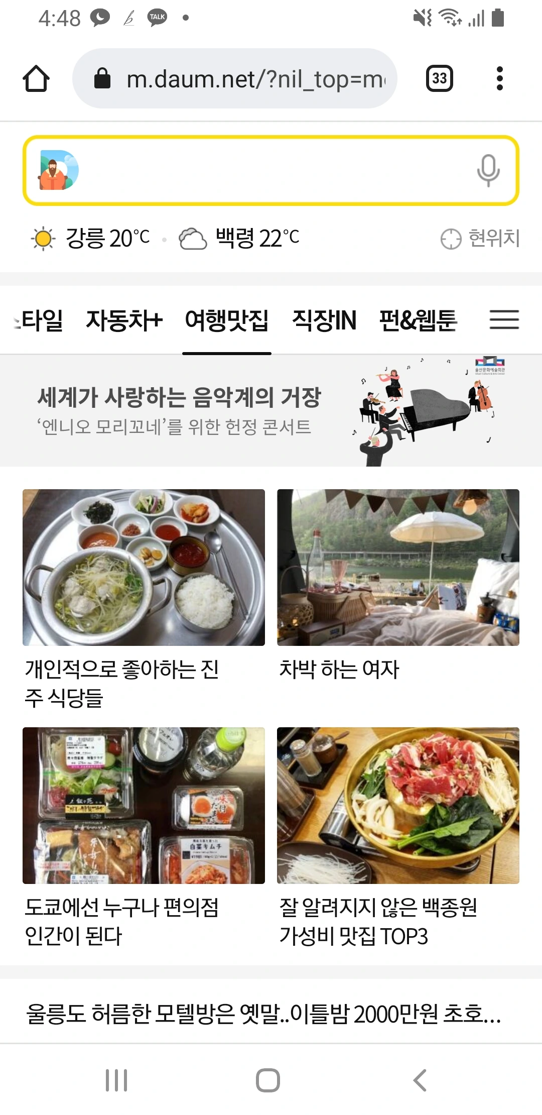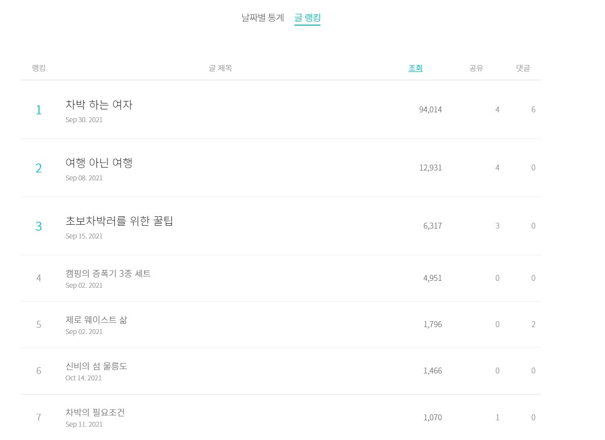 다음 포탈에 차박 하는 여자가 또 노출된 것이다. 그렇지만 이번은 조회수 1000 정도만 넘겼던 기존 포탈 노출과 차원이 달랐다. 지금까지 누적 조회수 무려 9만이라는 놀라운 신기록과 배로 늘어난 구독자, 그리고 그 후에도 한동안 여행 맛집 베스트 2위 글로 남아있었다.