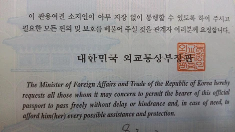 이 관용여권 소지인이 아무 지장 없이 통행할 수 있도록 하여 주시고 필요한 모든 편의 및 보호를 베풀어 주실 것을 관계자 여러분께 요청합니다.