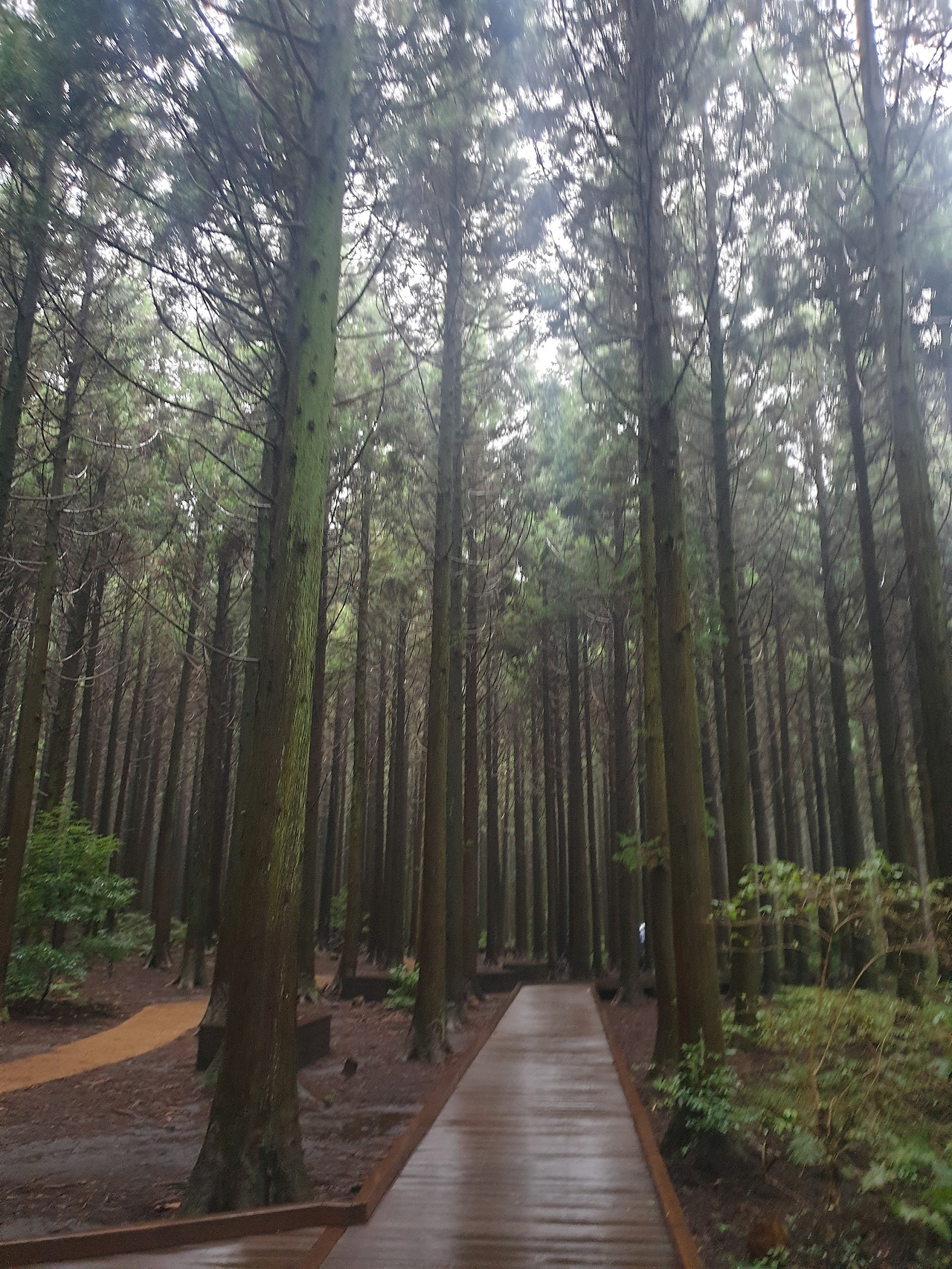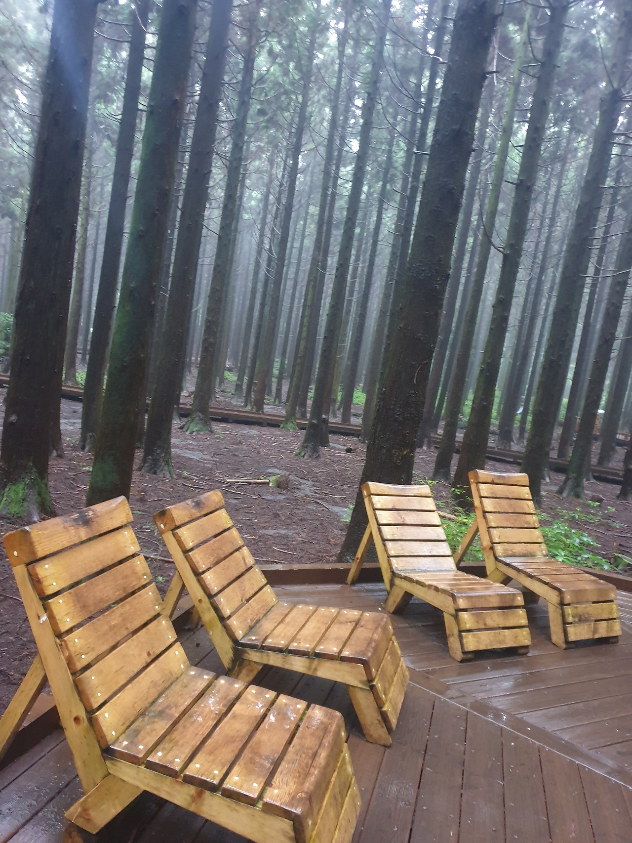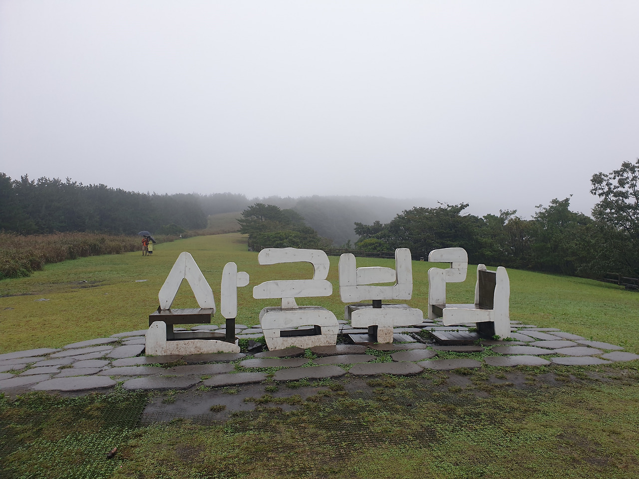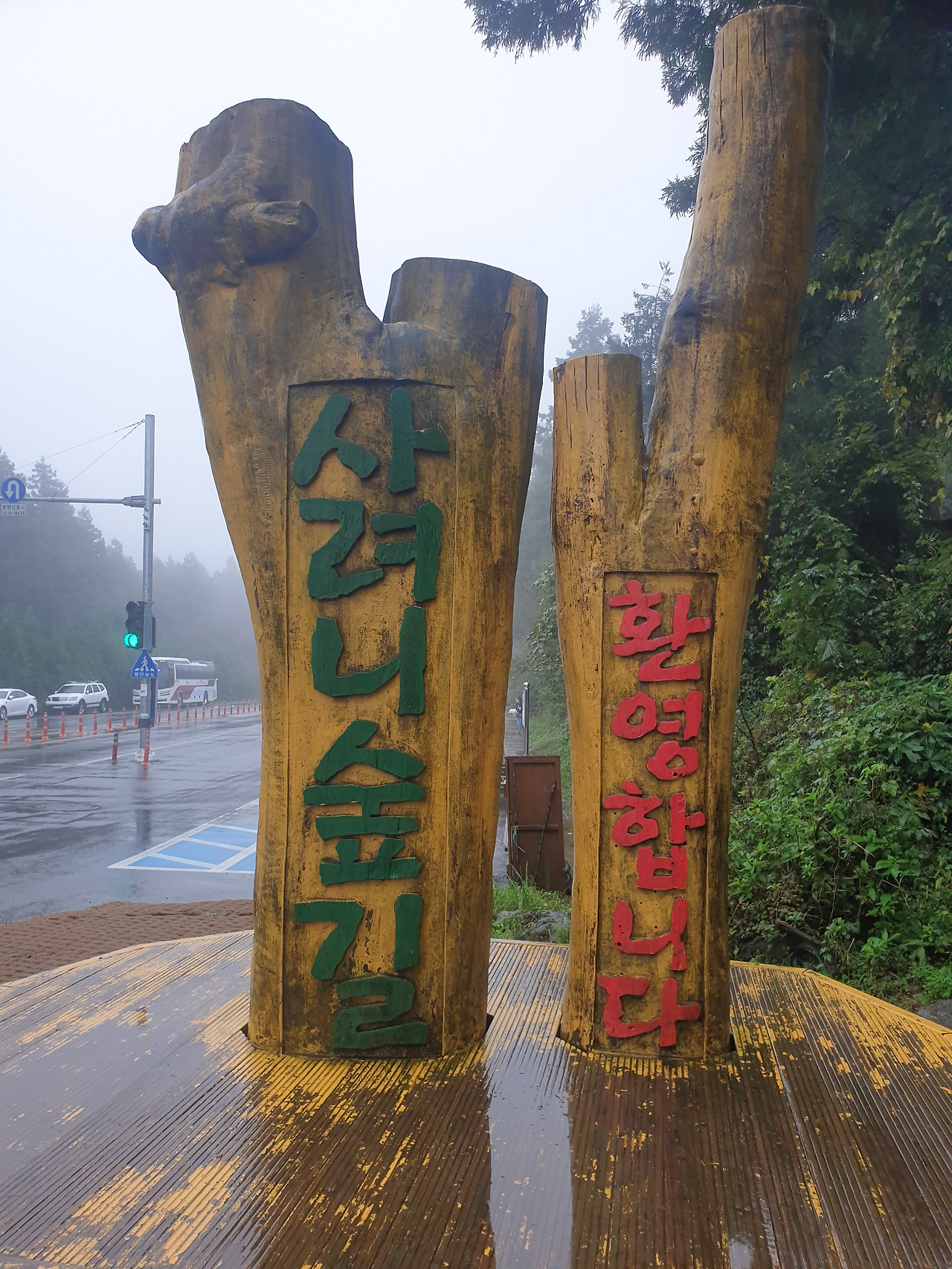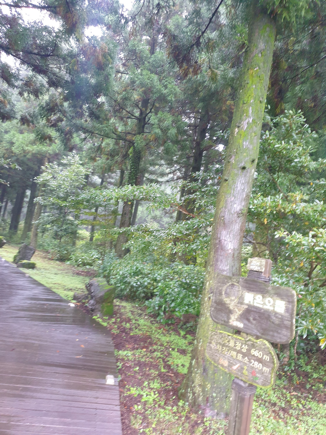그런데 휴양림에서의 1박 2일, 이틀 내내 비가 와서 안개 자욱한 운치 있는 산책길을 사람들이 많은 번잡스러움과 무더운 햇볕을 피해 걸을 수 있게 되었다. 아마 비가 오지 않았더라면 숲길보다 더 화려한 바다와 꽃에 발길이 쏠려 엄마에게 필요한 피톤치드의 맑은 공기를 충분히 마쉬지 못했을지도...또, 이 날 비가 아니라 다른 바다를 보러 간 날 비가 왔더라면 모든 일정이 망가져 버렸을 수도 있다. 다행히 비가 오는 날 만난 숲길과 오름은 숲의 고유의 빛깔을 더 짙게 만들고, 뽀얀 안개빛이 더해져 맑은 날보다 더 운치가 있었다. 또, 일정 중 침대가 아닌 유일하게 뜨끈한 바닥이었던 휴양림은 비가 와서 쌀랑해진 날씨에 여행의 노곤함과 차가운 몸을 녹이기에 안성 맞춤이었다.