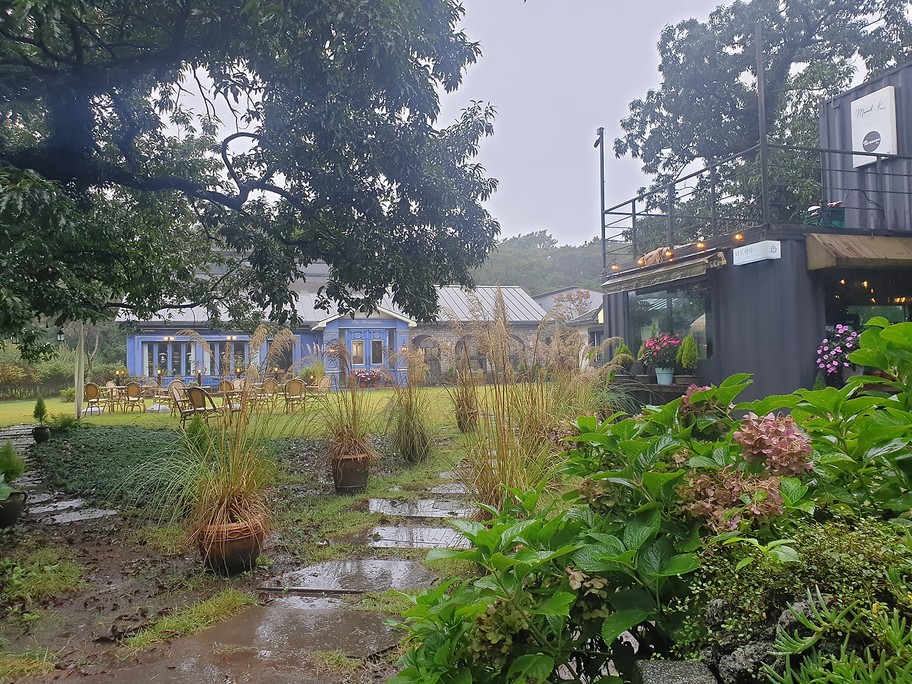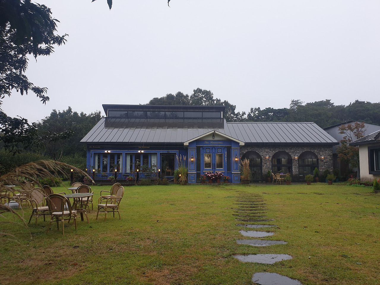 더 로맨틱 카페는 문이 닫혀 있어 들어가지는 못했지만, 유럽 감성의 파란 외관이 예뻤다. 근처에는 메밀꽃이 한창이다.
