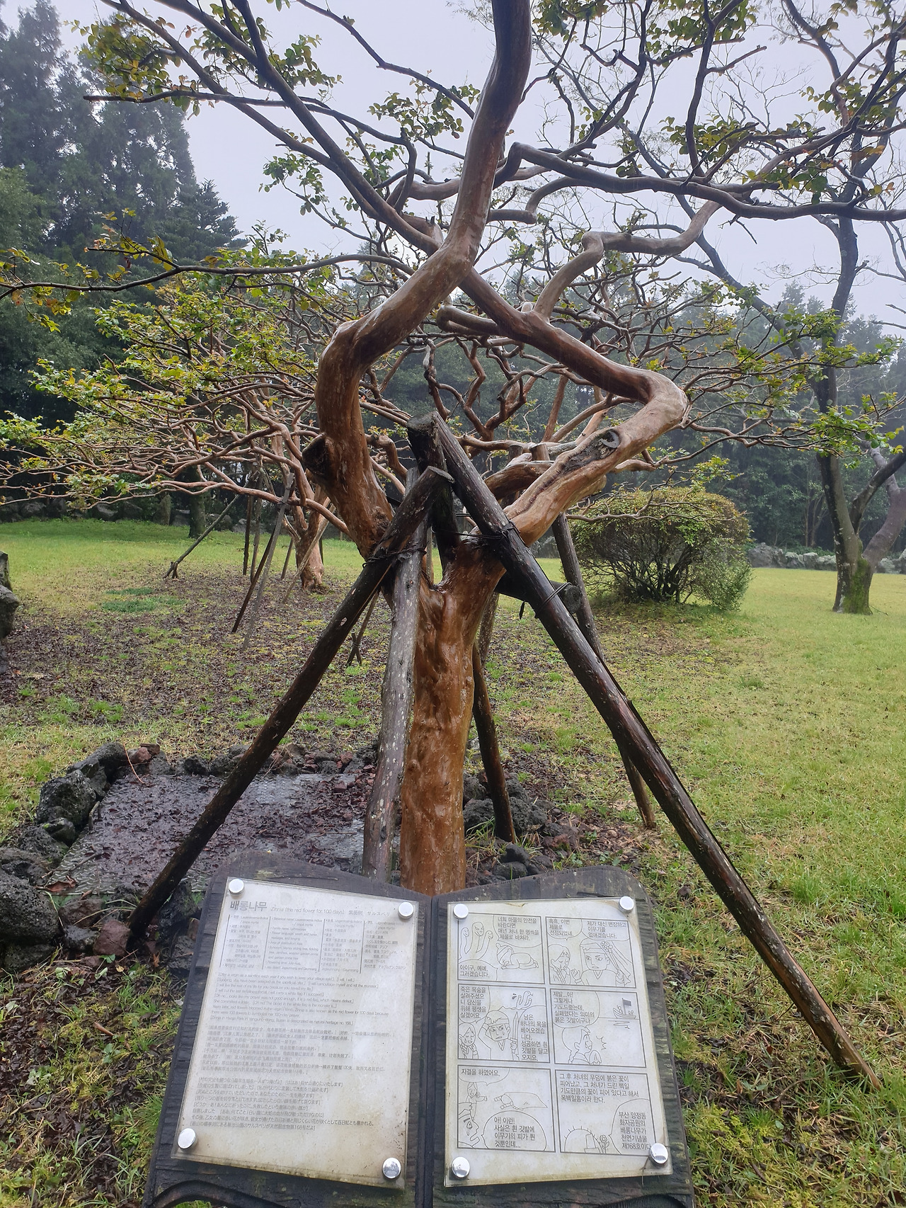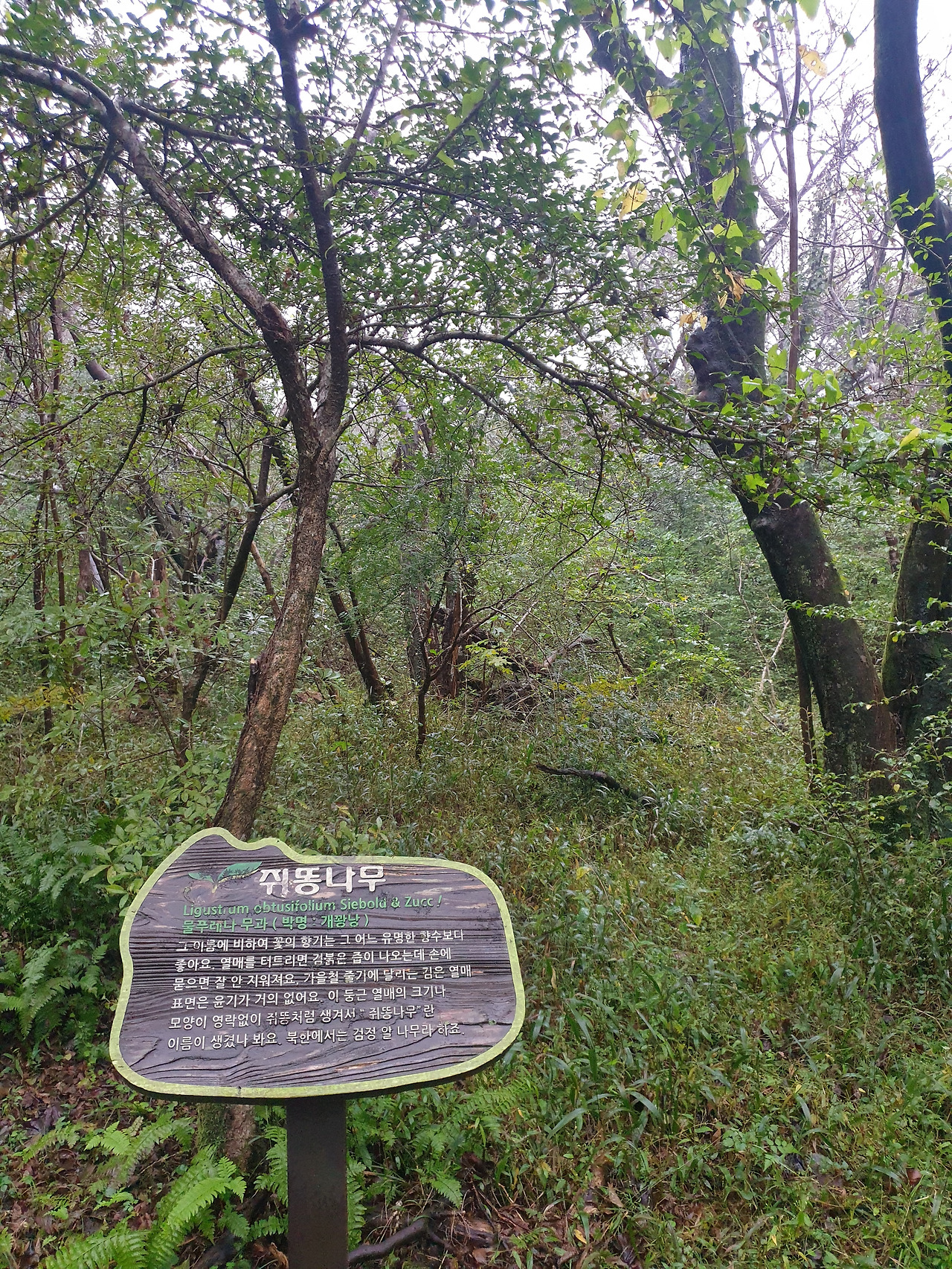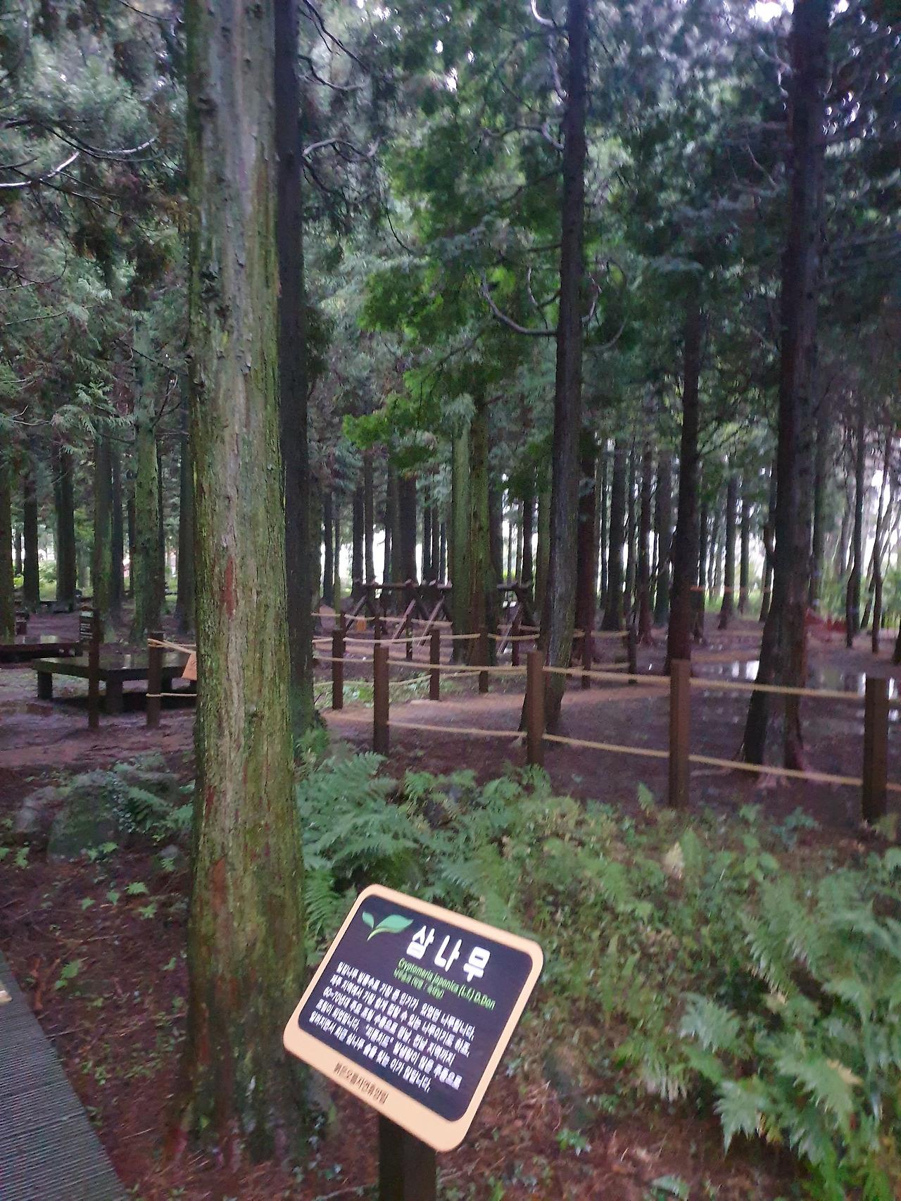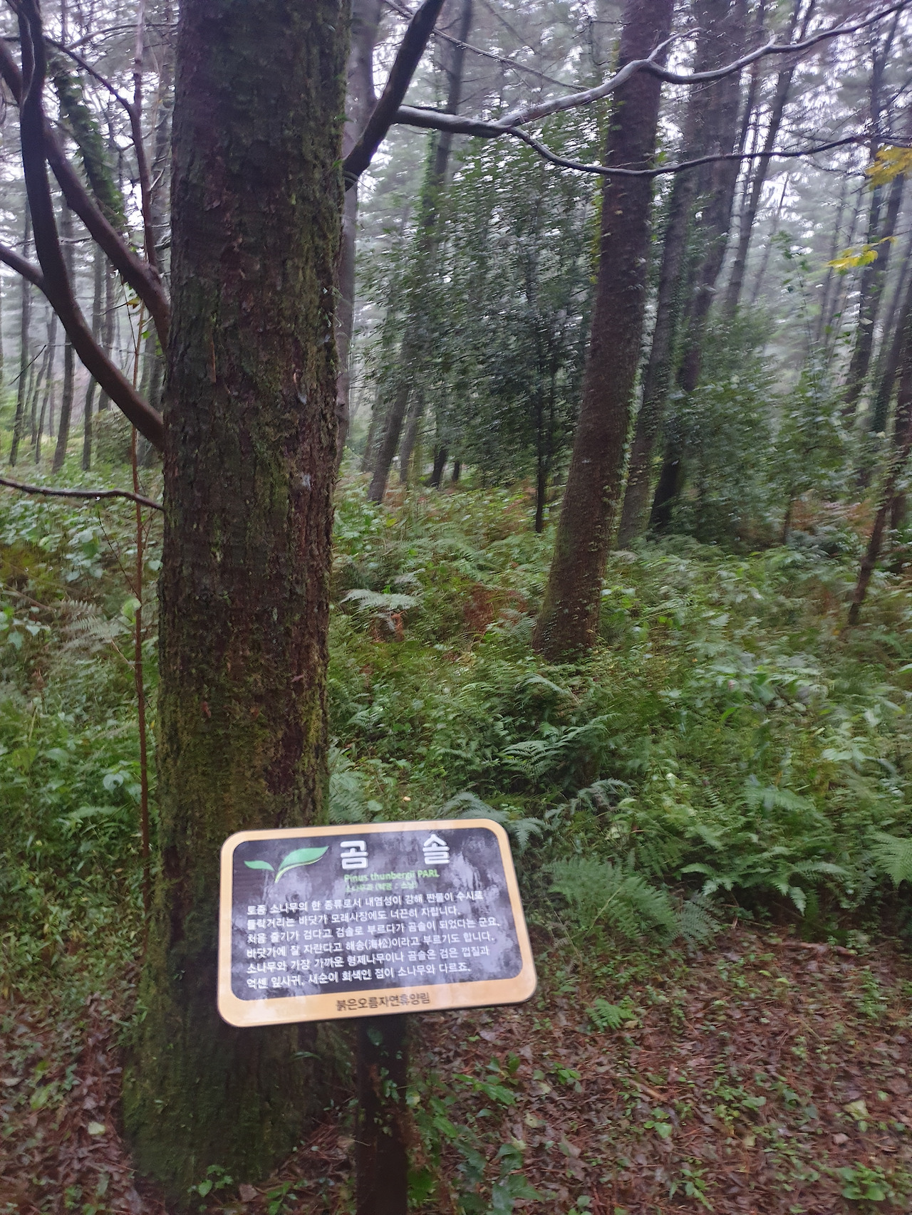 사고 후 빨리 걷기 힘들어 아직 안단테(Andante, 느린 걸음의 속도로)인 나의 걸음걸이 속도에 비한다면 모데라토(Moderato, 보통의 빠르기로)의 걸음걸이인 엄마는 이미 저만큼 앞서 걷고 계신다. 숲길을 따라 종류별 나무마다 이름표를 붙여 두었는데, "비목"이란 나무의 이름표를 지나자 엄마가 낮은 톤으로 노래를 흥얼거리신다 갑자기 웬 노래냐 물으니, 비목을 보니 '비목'이란 노래가 생각 나서라 얘기하며 계속 흥얼거리신다. 비옷을 입고 먼발치에서 앞서 가는 행색에, 점차 어두워지는 주변 숲길과 어디선가 들려오는 낮은 노랫소리까지 오버랩되자, 갑자기 영화 곡성이 떠올라 머리가 쭈삣 서는 느낌이라 순간 말리고 싶었으나, 차마 오랜만에 찾아온 엄마의 흥을 깨뜨릴 수는 없었다.