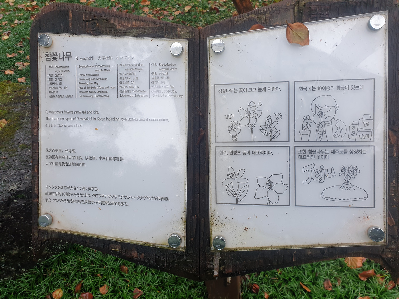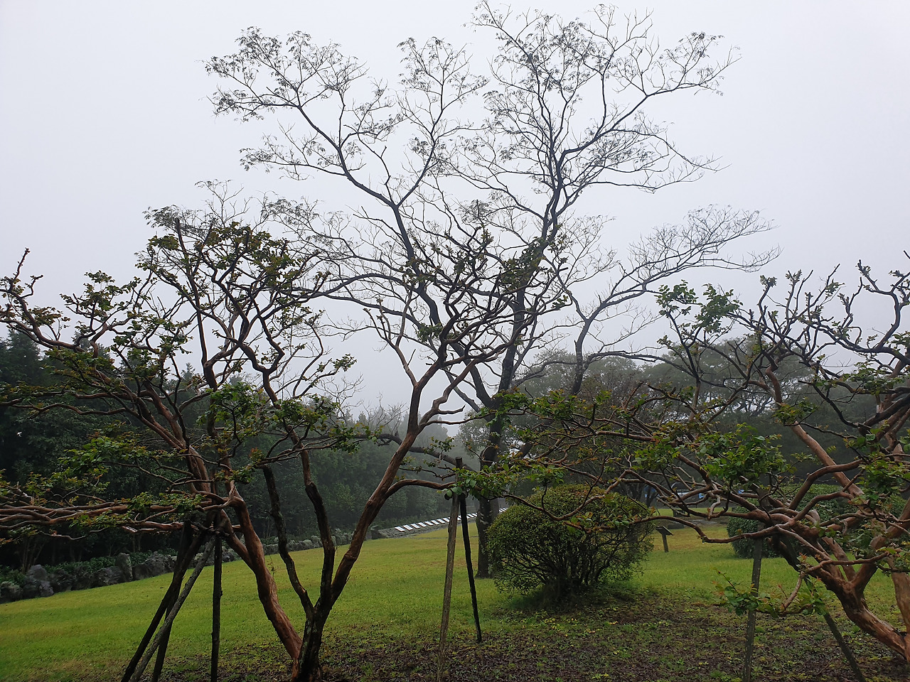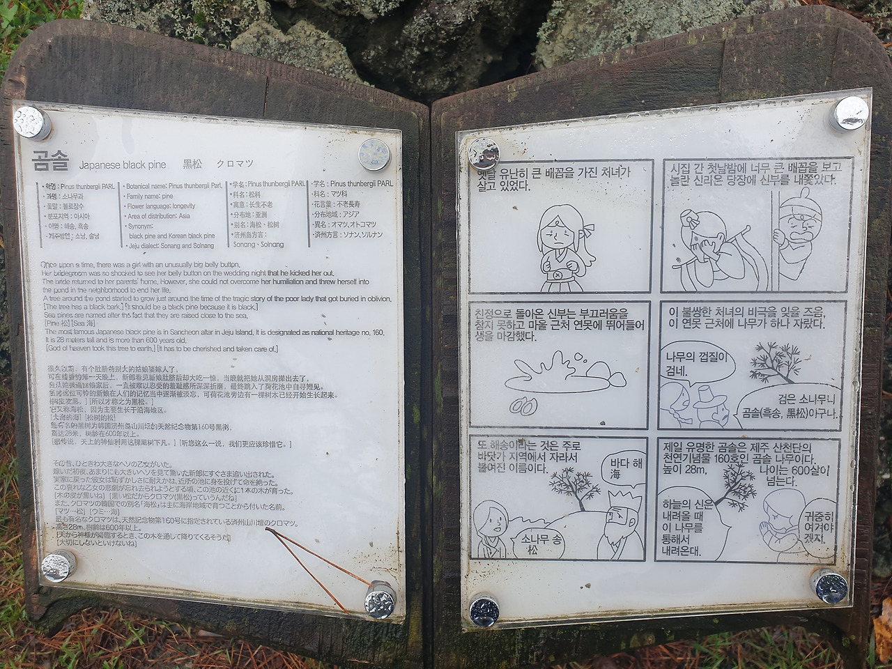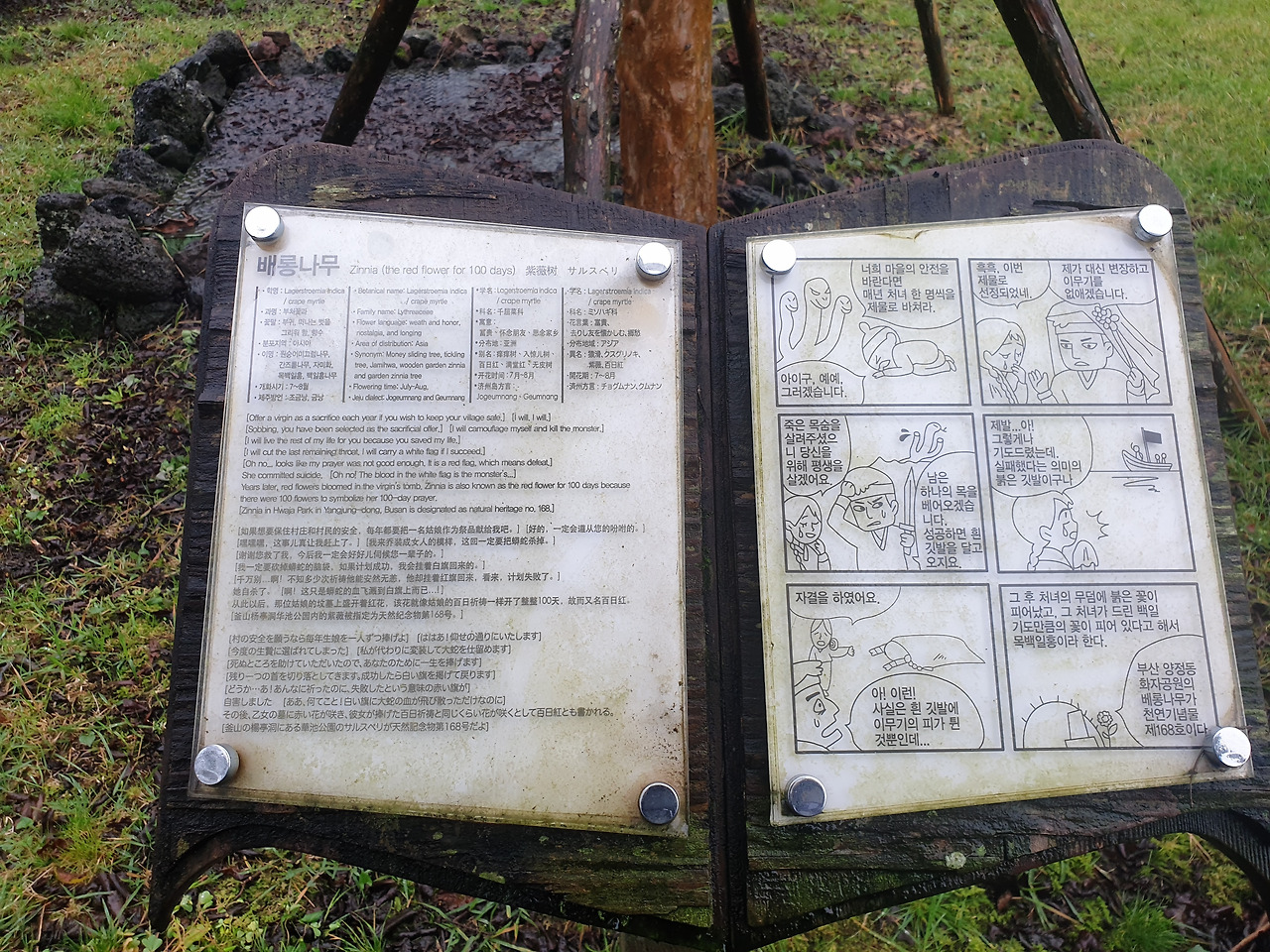 사고 후 빨리 걷기 힘들어 아직 안단테(Andante, 느린 걸음의 속도로)인 나의 걸음걸이 속도에 비한다면 모데라토(Moderato, 보통의 빠르기로)의 걸음걸이인 엄마는 이미 저만큼 앞서 걷고 계신다. 숲길을 따라 종류별 나무마다 이름표를 붙여 두었는데, "비목"이란 나무의 이름표를 지나자 엄마가 낮은 톤으로 노래를 흥얼거리신다 갑자기 웬 노래냐 물으니, 비목을 보니 '비목'이란 노래가 생각 나서라 얘기하며 계속 흥얼거리신다. 비옷을 입고 먼발치에서 앞서 가는 행색에, 점차 어두워지는 주변 숲길과 어디선가 들려오는 낮은 노랫소리까지 오버랩되자, 갑자기 영화 곡성이 떠올라 머리가 쭈삣 서는 느낌이라 순간 말리고 싶었으나, 차마 오랜만에 찾아온 엄마의 흥을 깨뜨릴 수는 없었다.