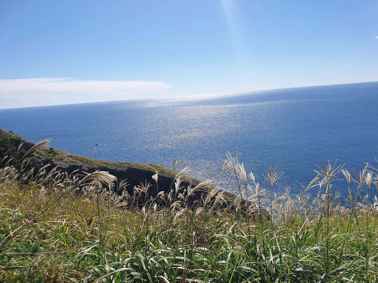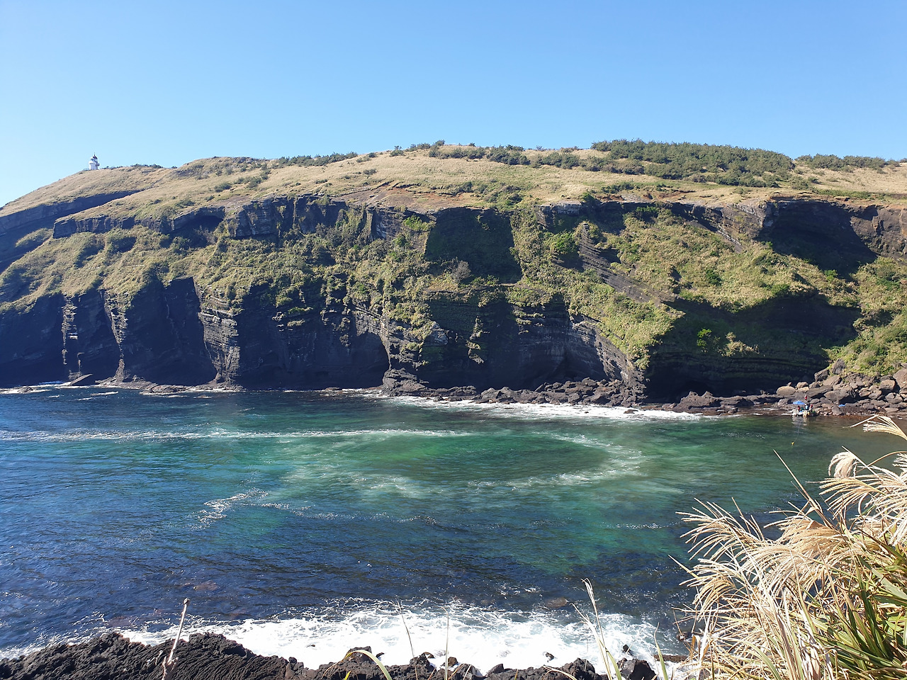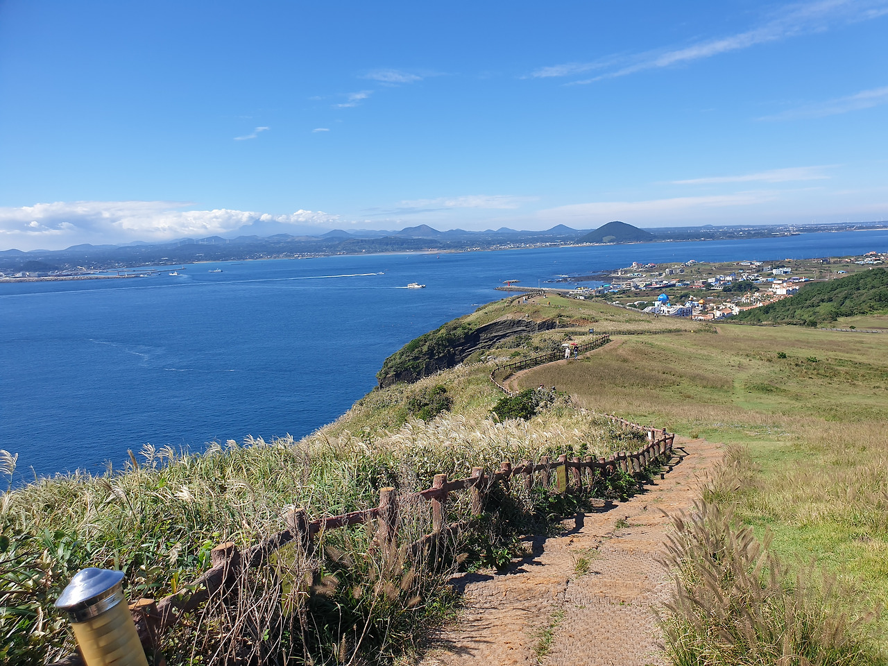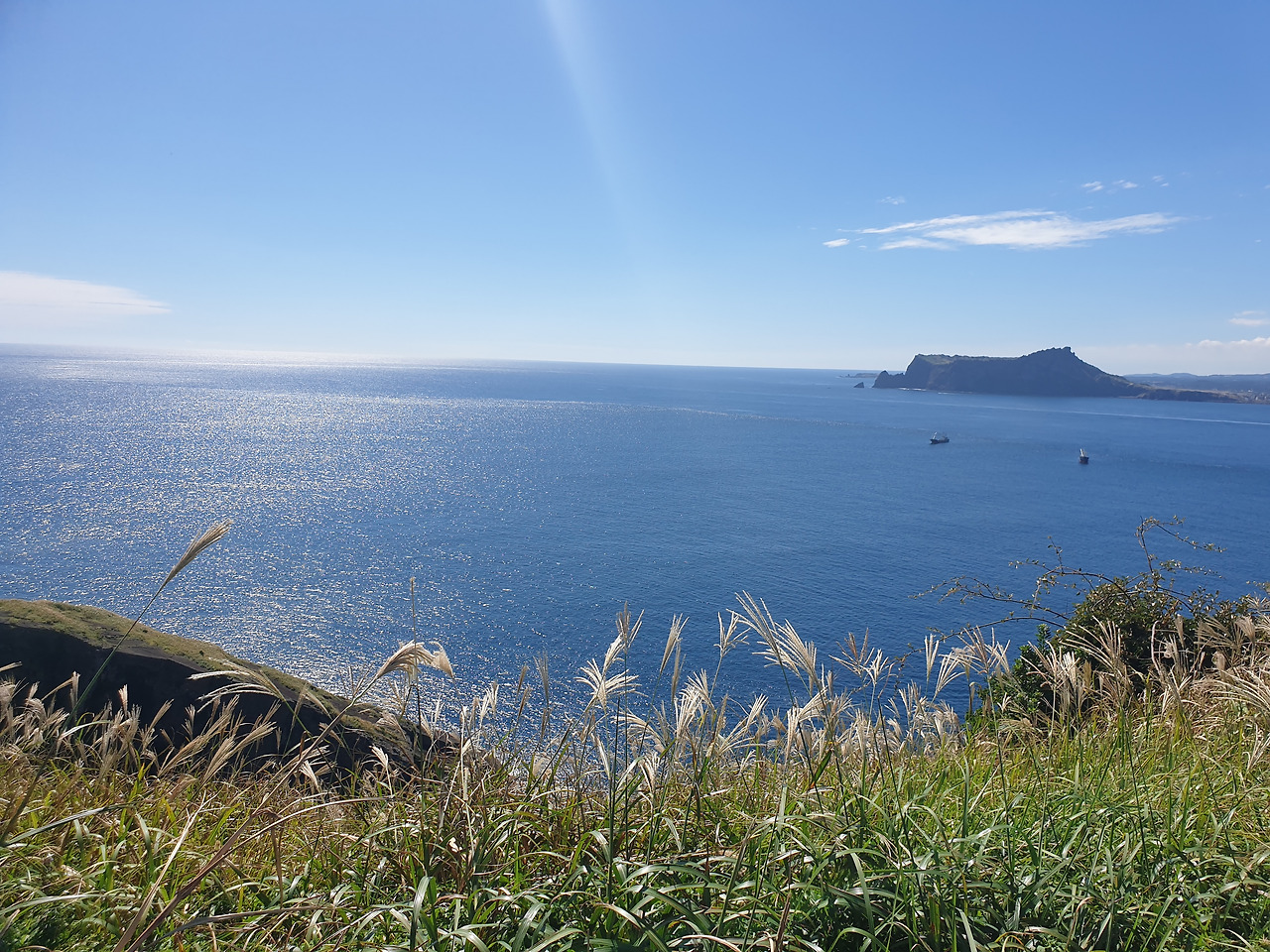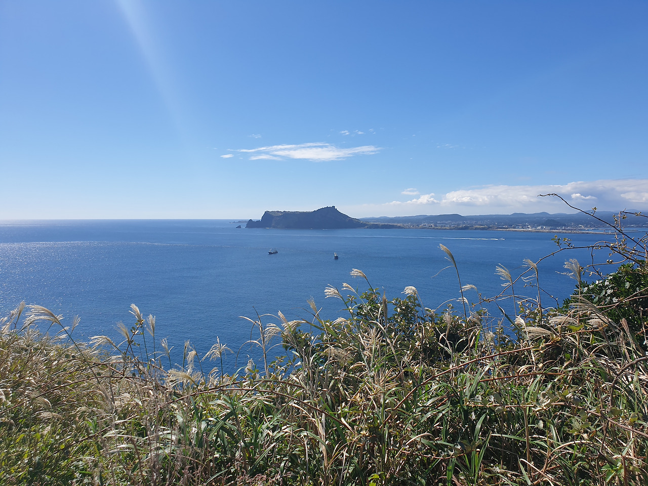 한참 펼쳐진 길을 따라 오르다 보면, 검붉은 암석, 푸른 바다, 아이보리빛 갈대와 초록빛 초원... 펼쳐진 절경이 아름답고, 깨끗한 공기에 기분이 상쾌하다. 나는 마지막 날, 폐에 우도의 맑은 공기라도 잔뜩 담아가기라도 하려는 듯 깊은 숨을 들이쉰다.