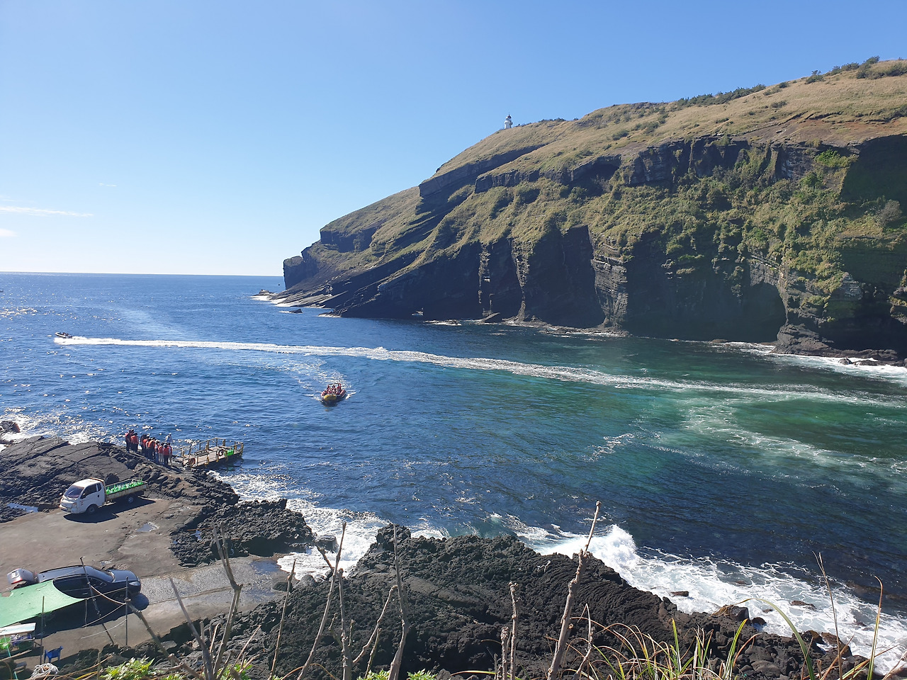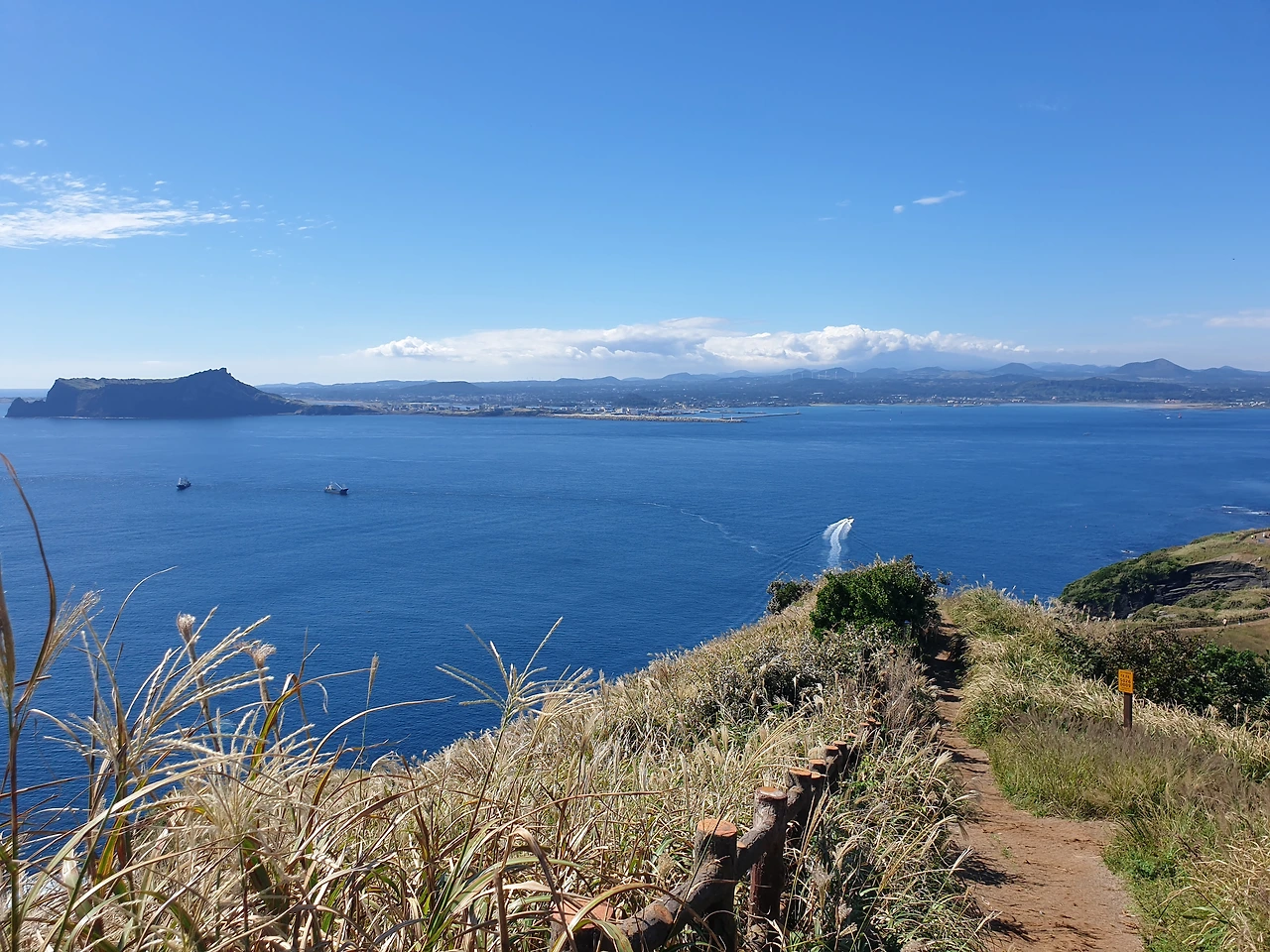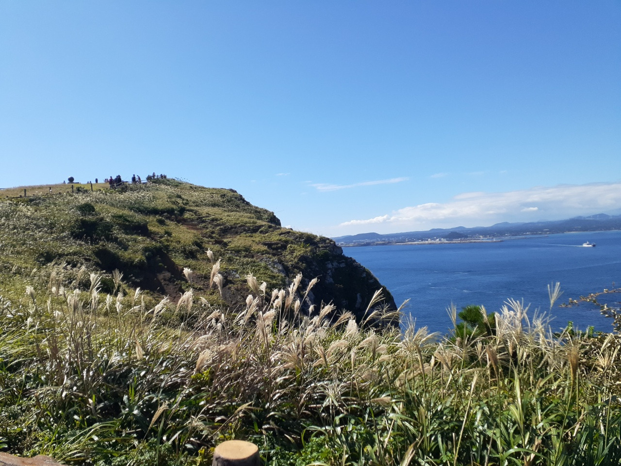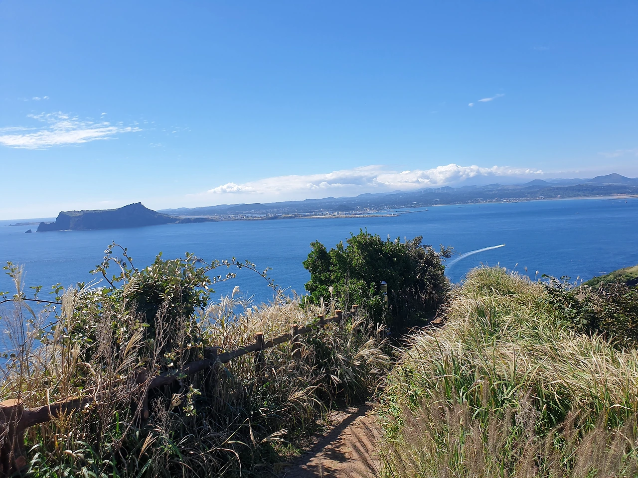 한참 펼쳐진 길을 따라 오르다 보면, 검붉은 암석, 푸른 바다, 아이보리빛 갈대와 초록빛 초원... 펼쳐진 절경이 아름답고, 깨끗한 공기에 기분이 상쾌하다. 나는 마지막 날, 폐에 우도의 맑은 공기라도 잔뜩 담아가기라도 하려는 듯 깊은 숨을 들이쉰다.