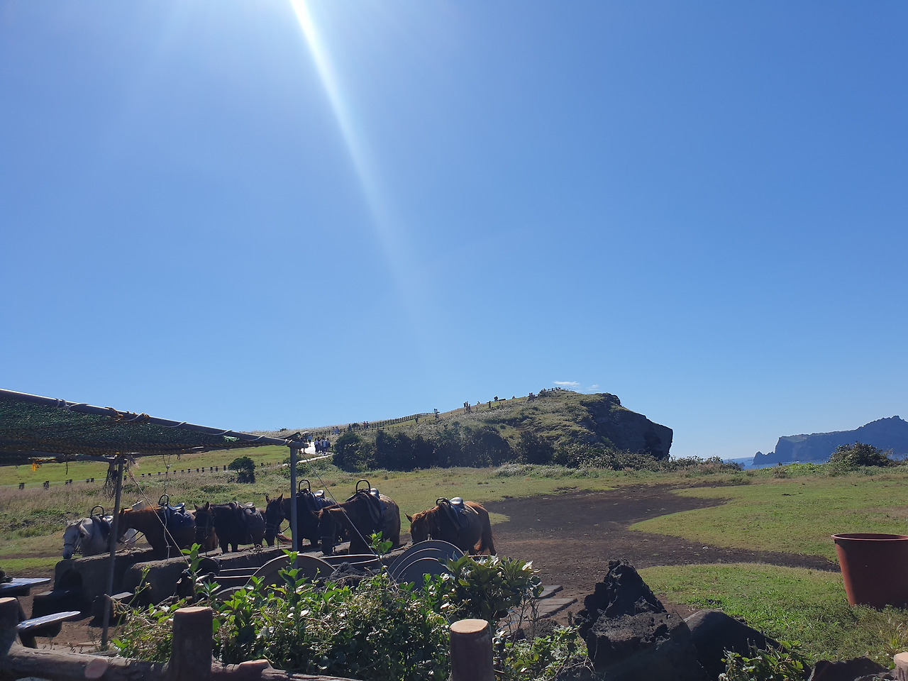 그리고 손님이 매번 바뀔 때마다 이 호탕한 목소리로 뮤지컬 대사와도 같은 이 멘트를 외치는데, 이 길을 따라 오르며 이런 대화들을 도돌이표처럼 계속 듣게 된다. 그러나 자칫 호탕한 이 풍경에 사로잡혀, 오르면서 한눈팔다 밟을 수 있는 말똥 주의! 말을 타고 오르면 다리가 좀 더 편할 것 같고, 제주도에서 유명한 말도 타보아 제주도의 감성을 제대로 느낄 수 있을 듯해 좋아 보였다.