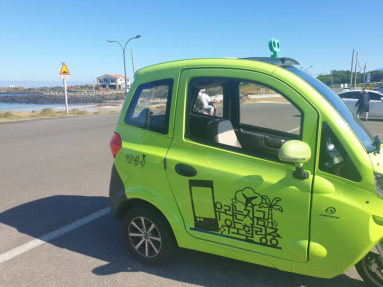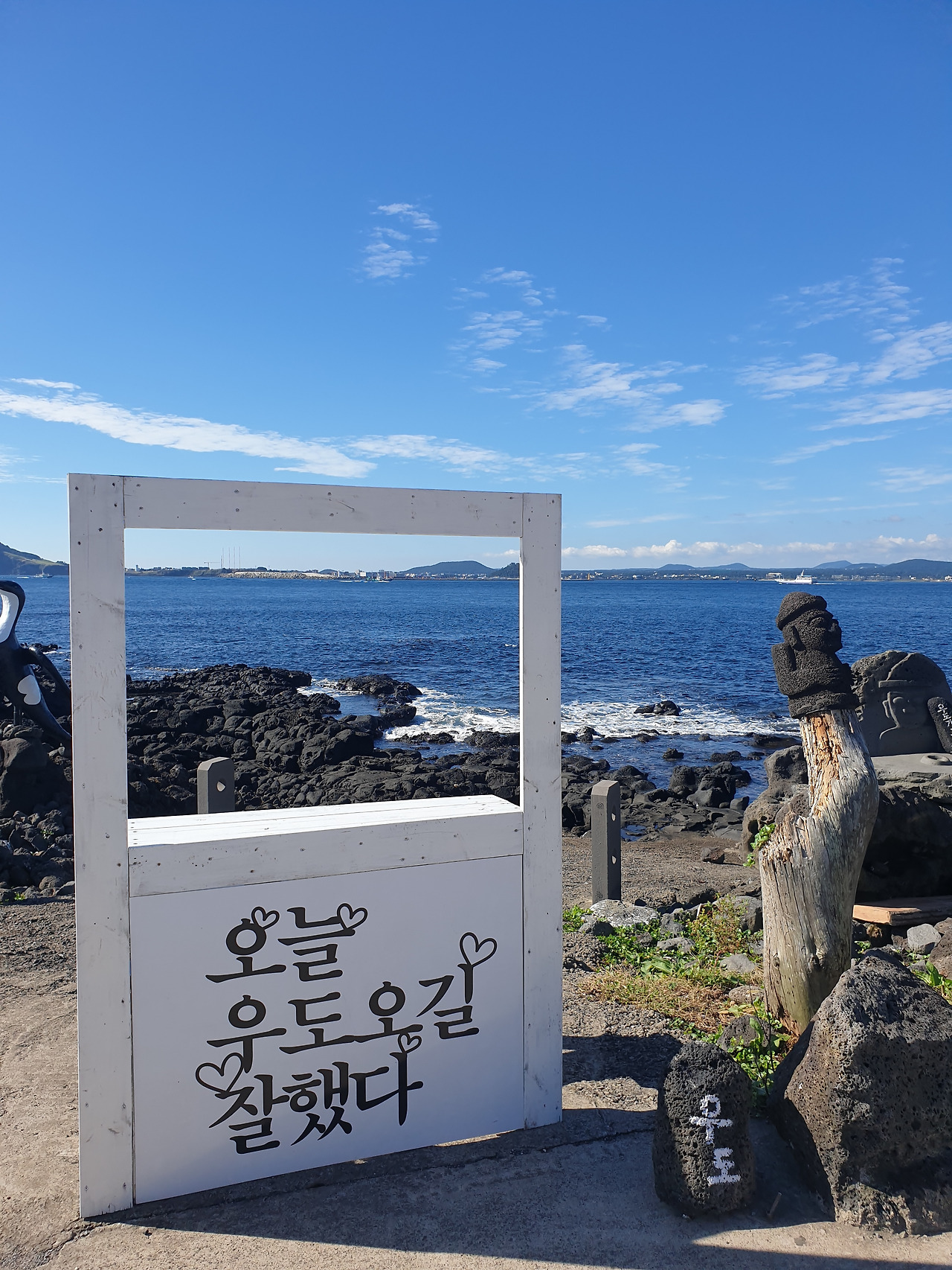지나가는 길 보고 차를 세운, 정말 내 마음을 콕 집어 대신 표현한 듯한 '오늘 우도 오길 잘했다.'라 쓰인 포토존과 전기 오토바이의 '우리는 지금 우도 힐링 중'이란 문구.