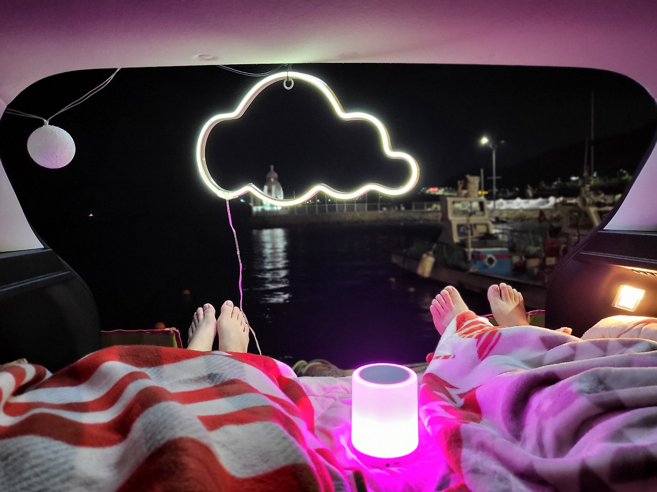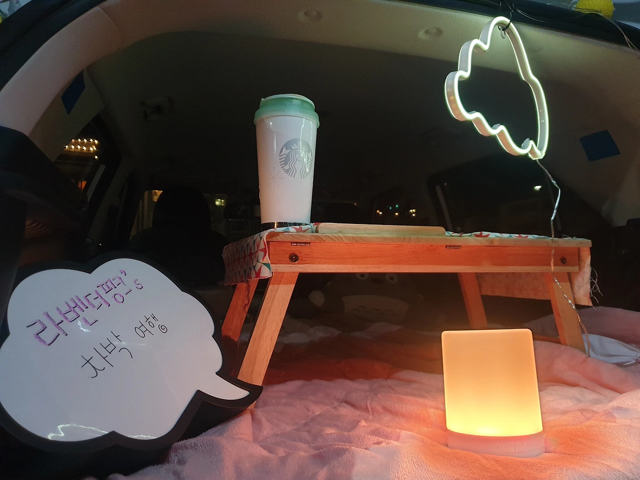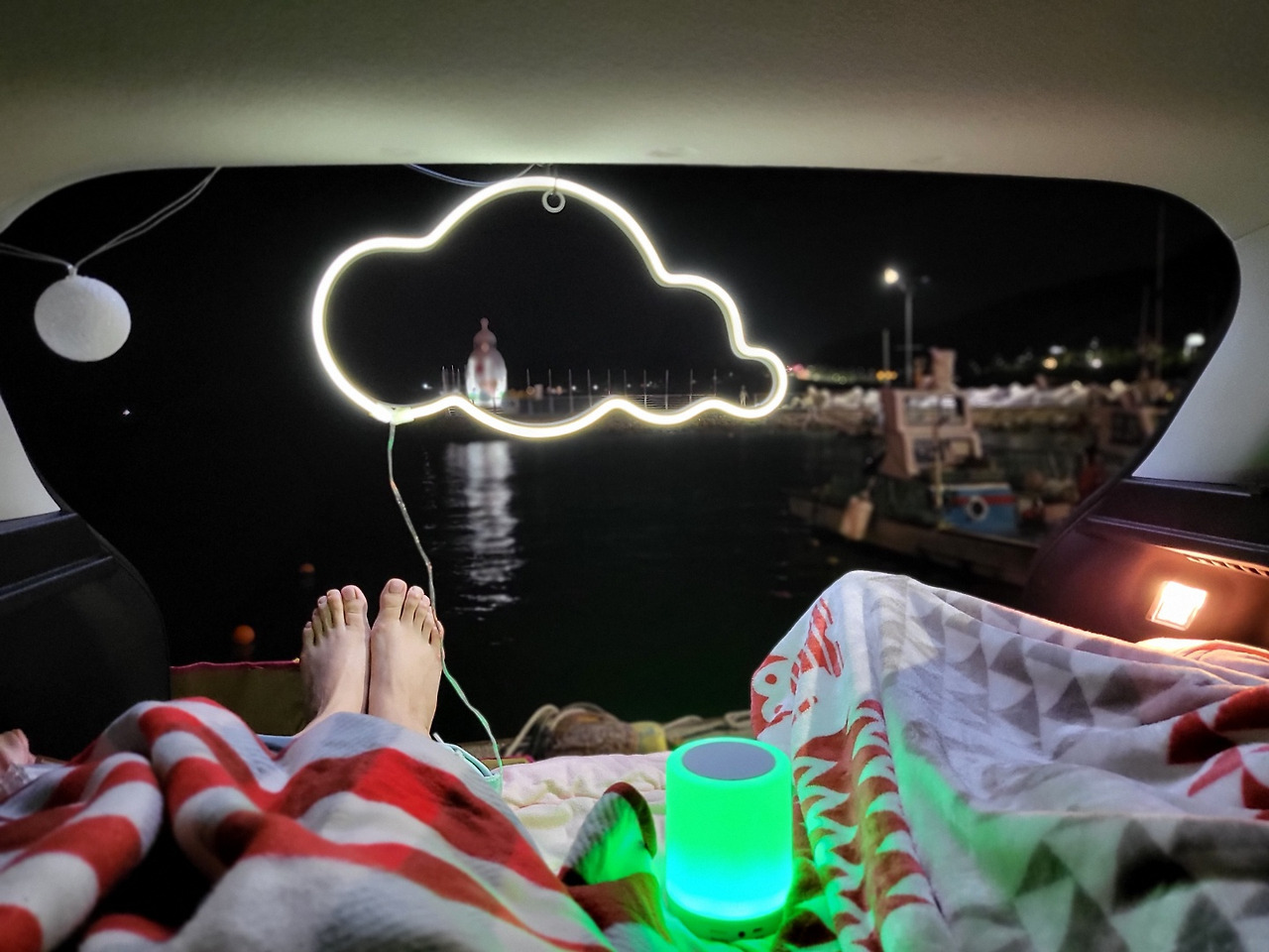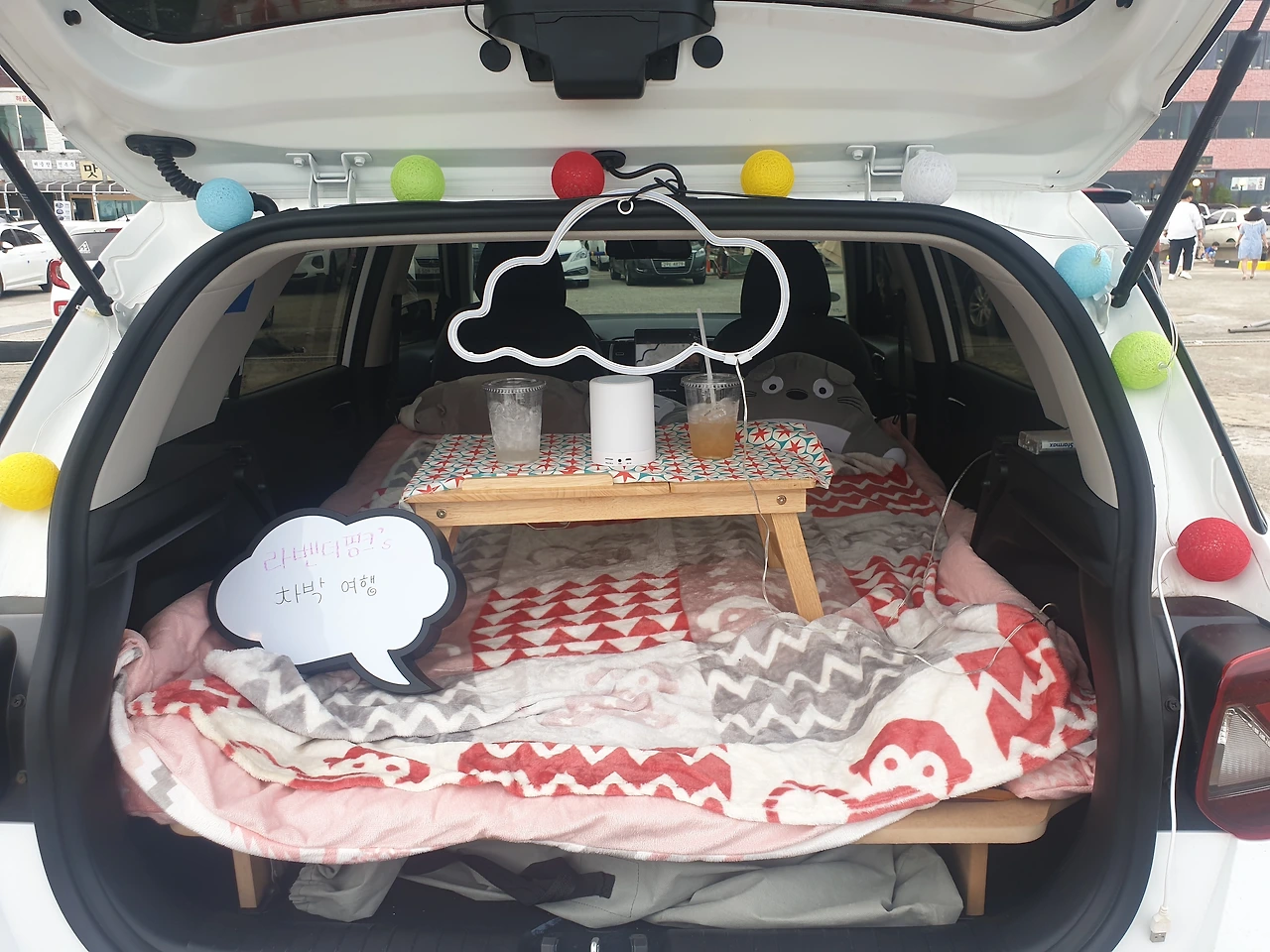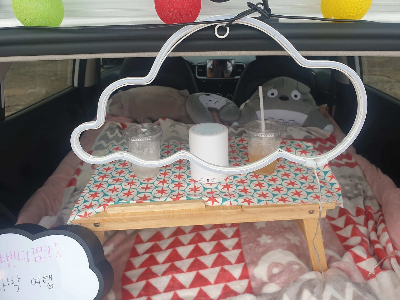 7. 테이프이나 고리, 끈 혹은 테이프: 장식물들을 걸만한 곳이 있는지 사전에 확인해 보고 필요하면 챙겨두면 좋다. 나는 막상 구름 조명을 걸려고 보니 차량 부분에 걸만한 고리가 없어 급한 데로 충전기 줄로 묶어 매달았다.