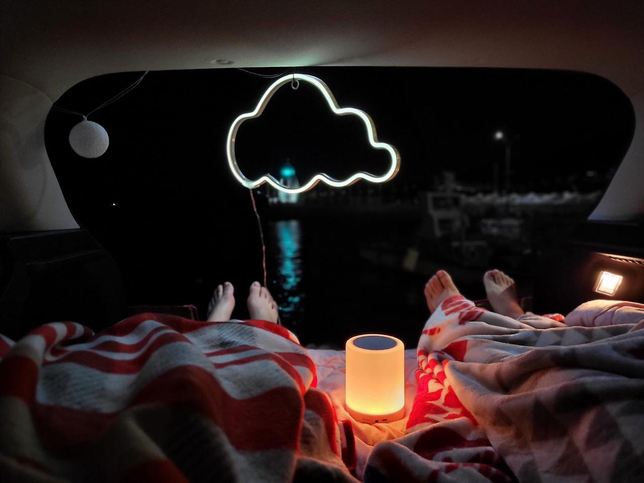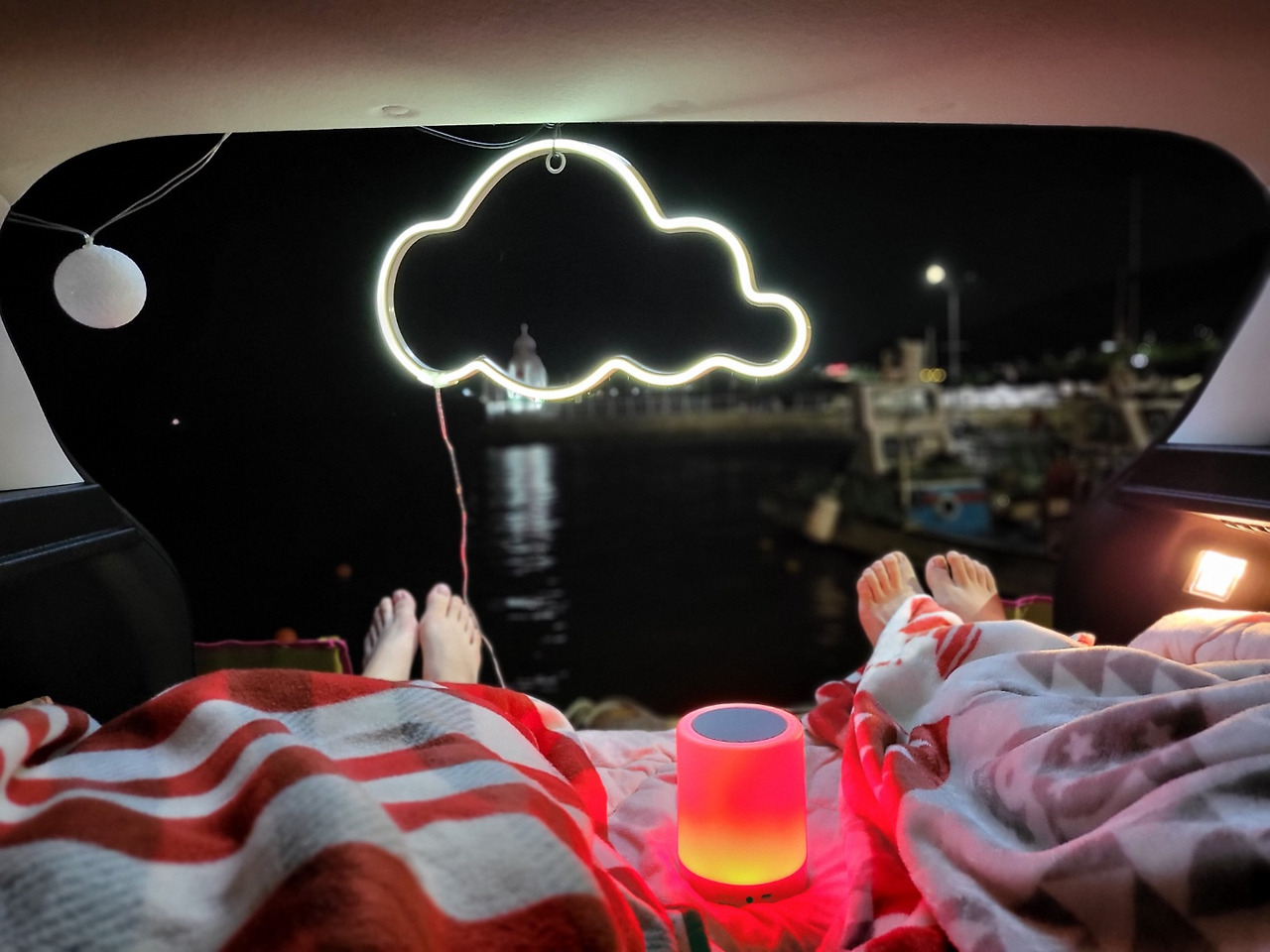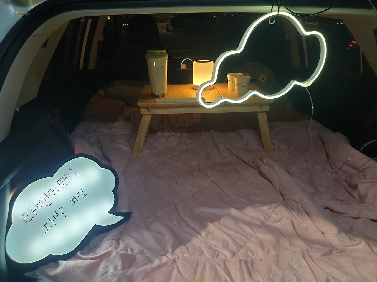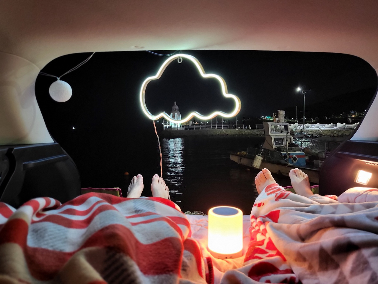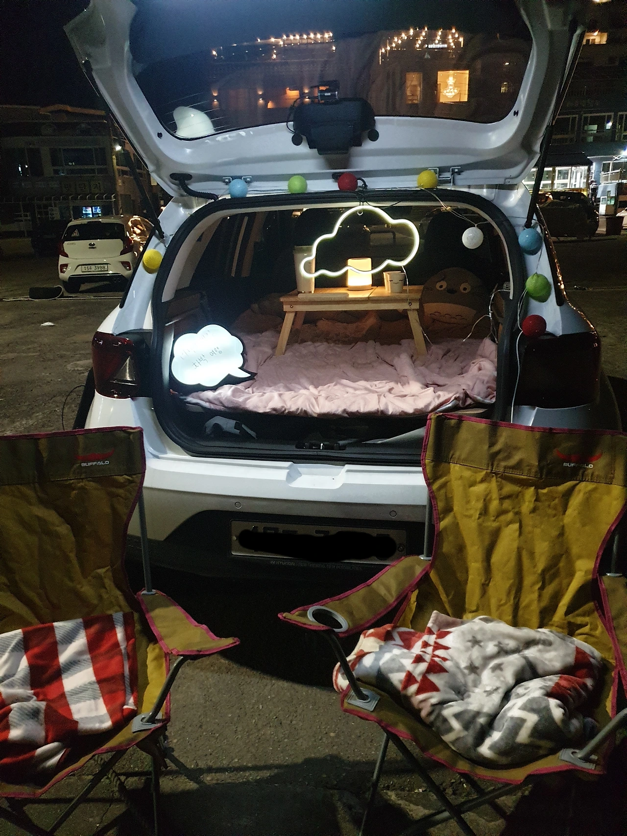7. 테이프이나 고리, 끈 혹은 테이프: 장식물들을 걸만한 곳이 있는지 사전에 확인해 보고 필요하면 챙겨두면 좋다. 나는 막상 구름 조명을 걸려고 보니 차량 부분에 걸만한 고리가 없어 급한 데로 충전기 줄로 묶어 매달았다.