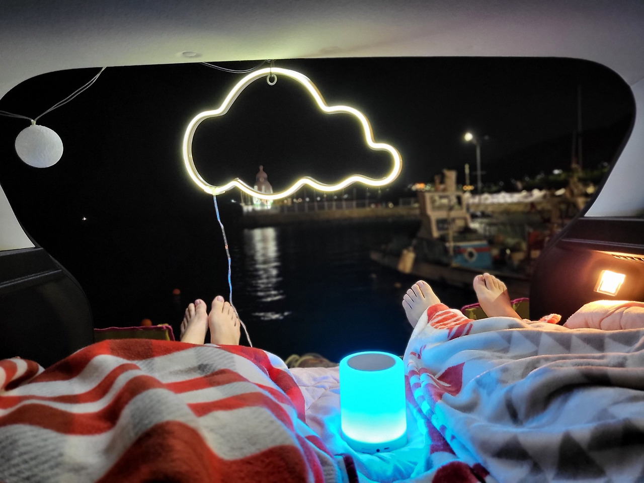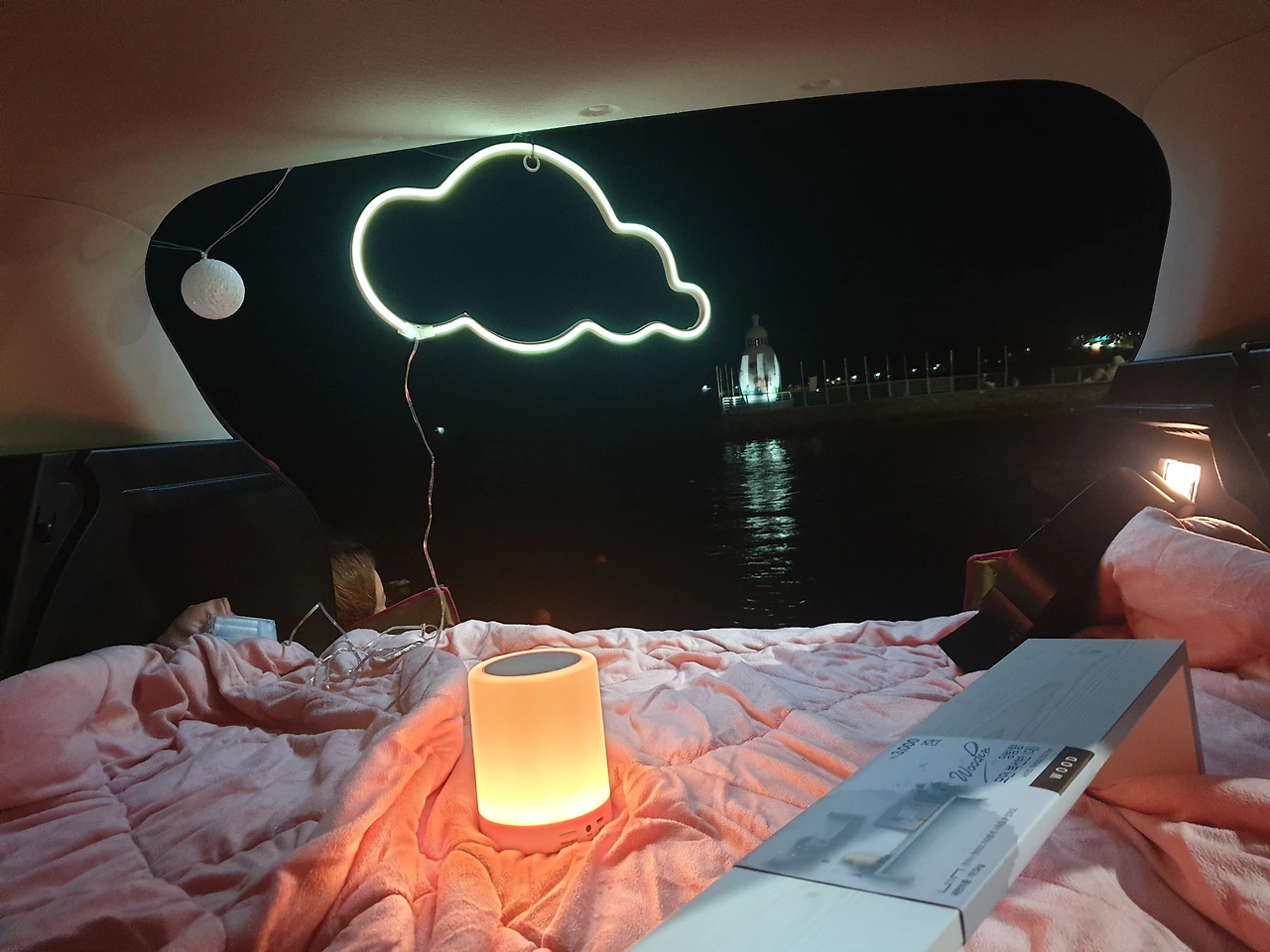 4. 구름 조명: 감성 아이템. 하나만 걸어도 차박 느낌이 물씬 묻어 나온다. 원래 베란다에 걸어둔 아이템인데, 막상 켜본 적은 거의 없어 몇 년 전 넣어둔 건전지가 아직 작동했다. 구름 조명은 기존 차박 사진에서 보지 못했던 신선한 느낌이 있고, 밤이 되면 빛을 발하는 최강 아이템이었다. 말풍선 구름 조명은 베란다에 하나, 옷방에 하나 인테리어 용으로 나두었던 건데, 베란다에 둔 것은 그만 칠판 색이 햇빛에 누렇게 변해버려 옷방에 있던 조명 하나만 들고 왔다. 손글씨를 마음대로 썼다 지웠다 할 수 있고, 밤에는 불이 들어와 이제야 좀 제자리를 찾은 듯한 아이템.