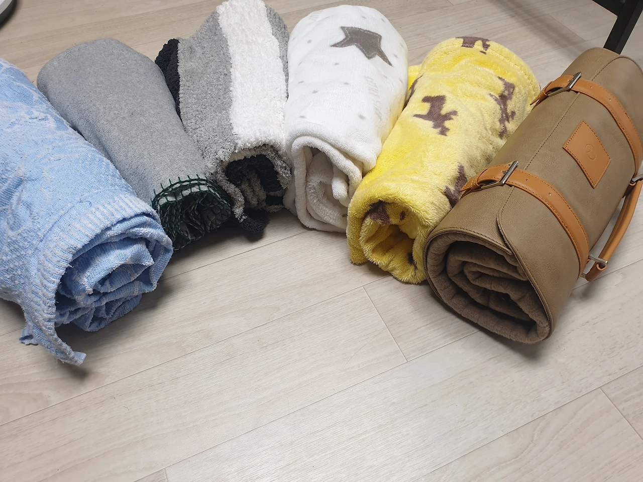 8. 담요와 쿠션: 쿠션을 놔두면 귀엽기도 한 장식용이고, 누울 때면 베개 대용으로 사용했다. 낮에는 더웠지만, 밤이 되자 제법 쌀쌀해져 요즈음과 같은 계절에 담요는 필수. 추위를 많이 타는 나는 집에 무릎담요만 8개가량 있었는데, 일단 제일 큰 아이들로만 골라 3개 데려왔다.
