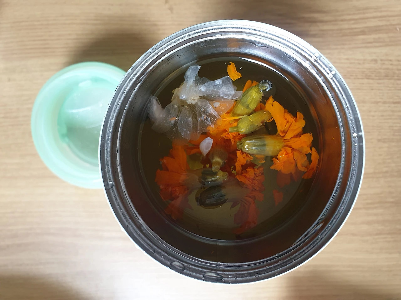 5. 집에서 텀블러에 들고 온 꽃 차 한잔: 눈에 좋을 메리골드와 노화방지에 좋을 구절초, 염증에 좋은 당아욱 차를 섞어 만든 저녁 후 입가심으로 그만이었던 꽃 차.