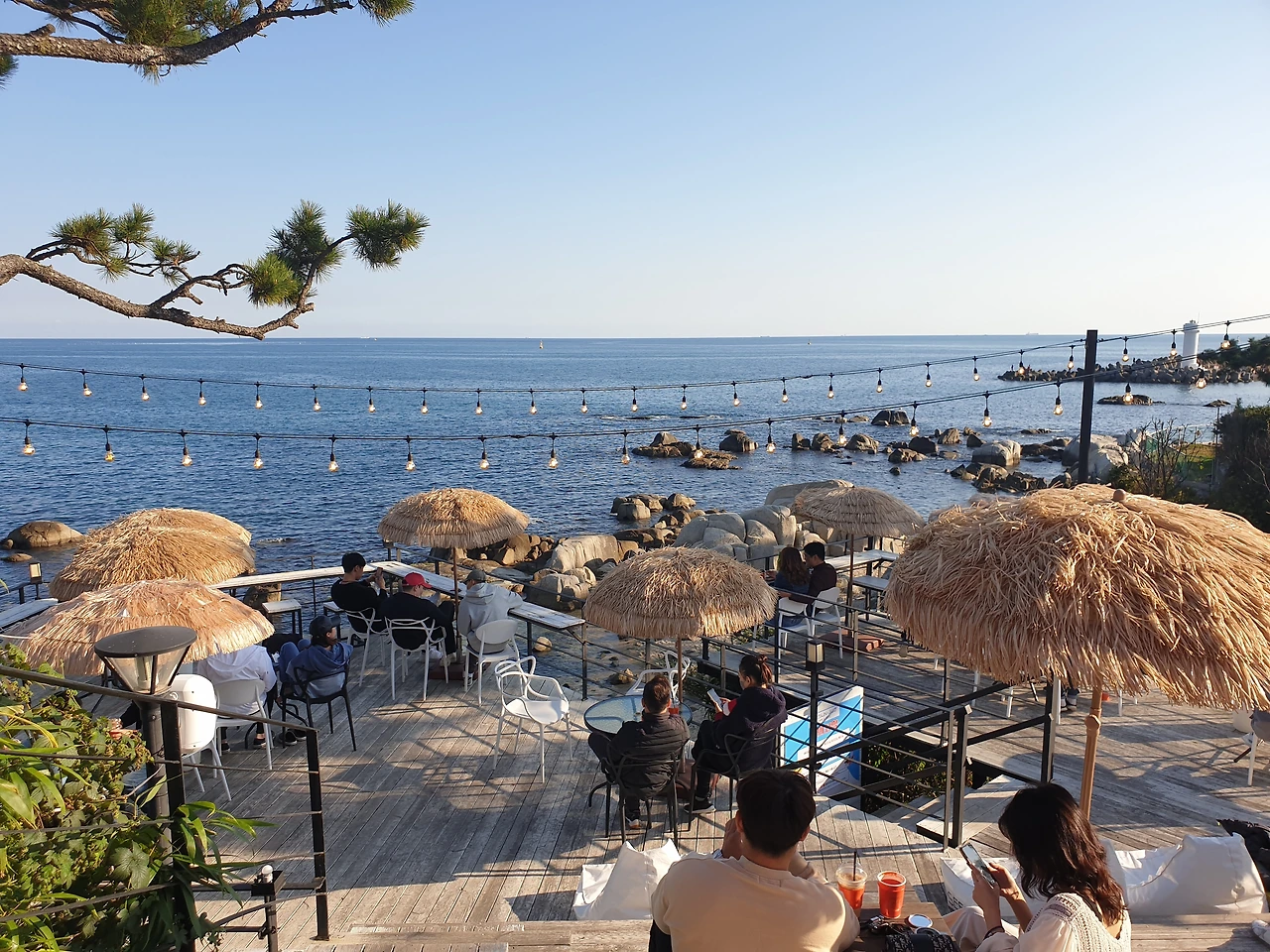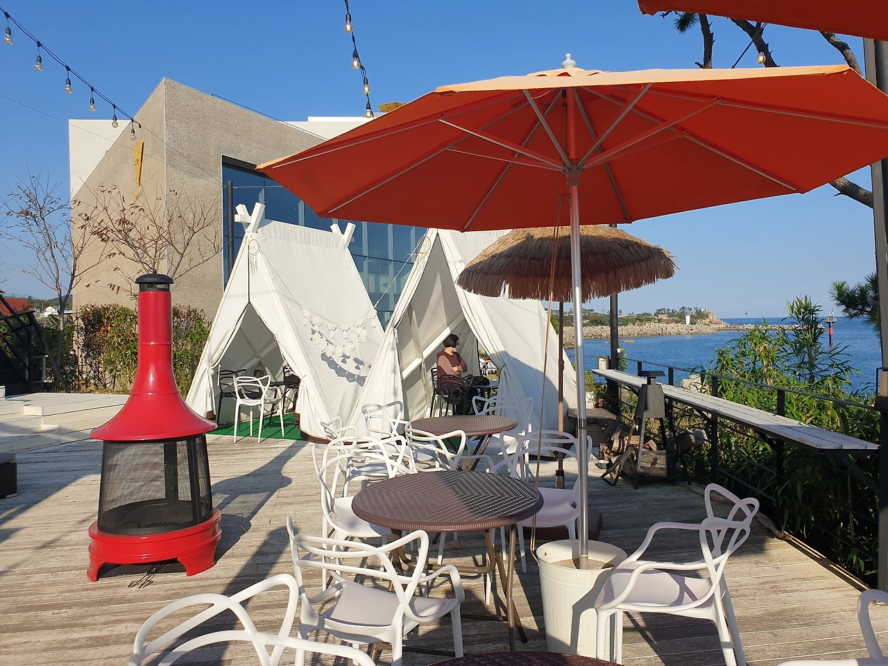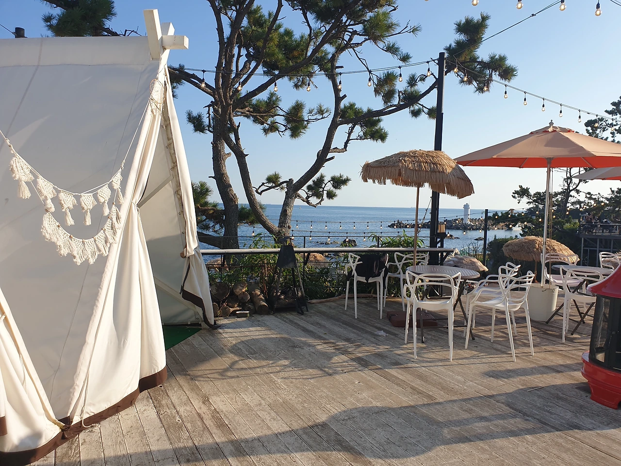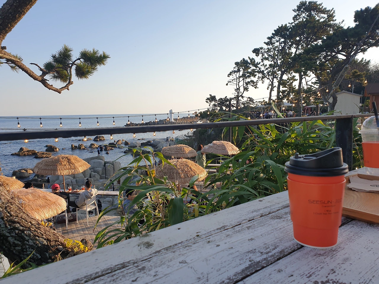 5. 울산 시선 310: 흰색 천막과 군데군데 장작불, 화로, 그네, 특히 동남아 감성까지 자극하는 파라솔이 특색있는 카페. 코앞에서 들려오는 바다소리와 바다내음, 계단만 내려가면 맞볼수 있는 해변 모래사장과 바다로 가족단위 손님도 꽤 많이 보입니다. 라면과 브런치, 양갈비구이와 맥주 등 커피 외에도 함께 즐길 수 있는 다양한 메뉴가 있습니다.