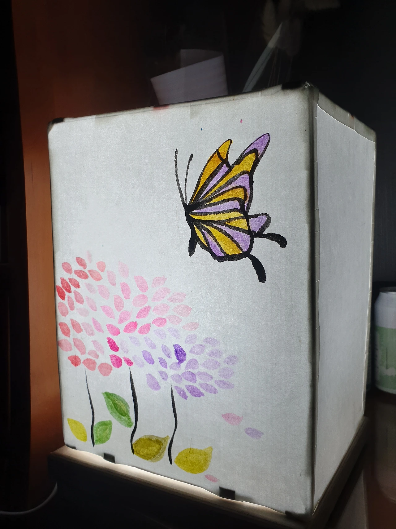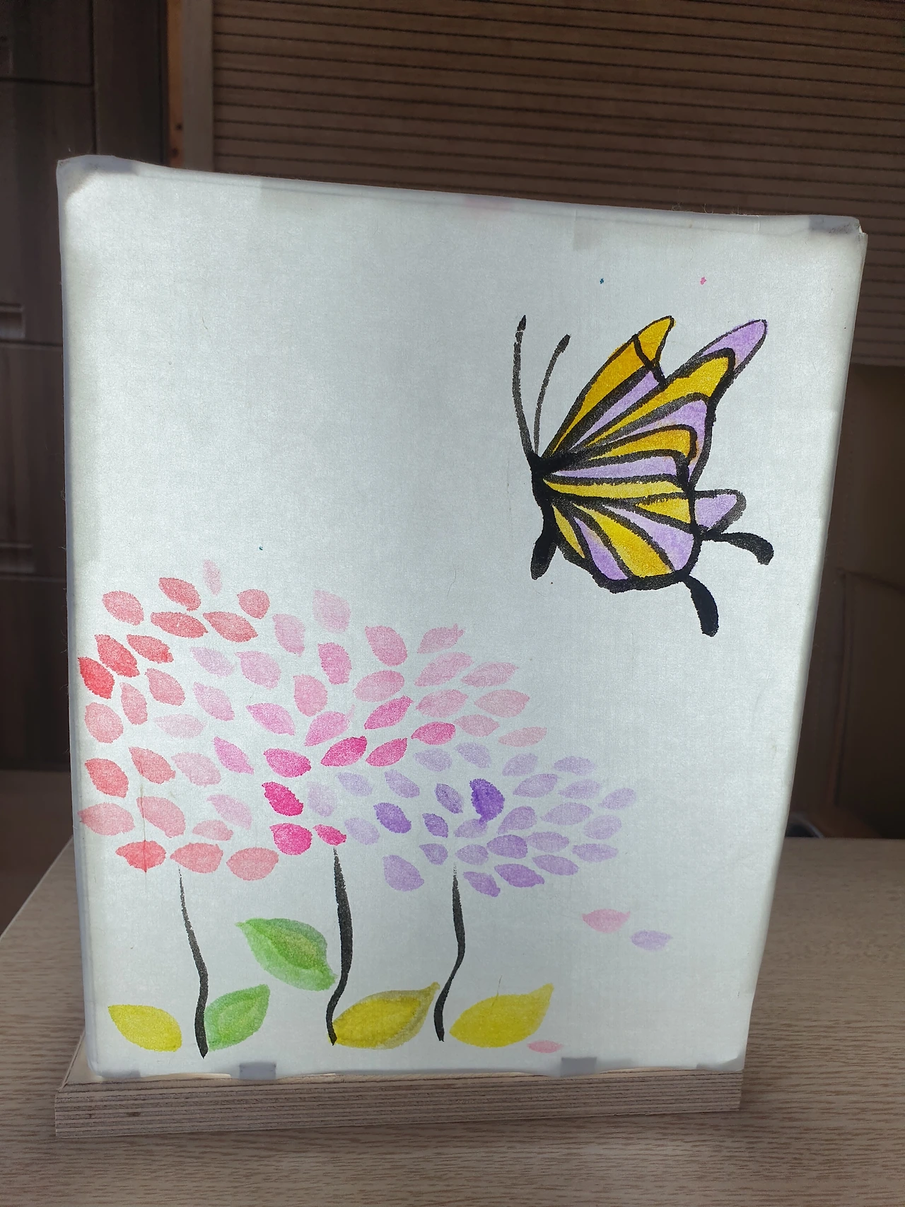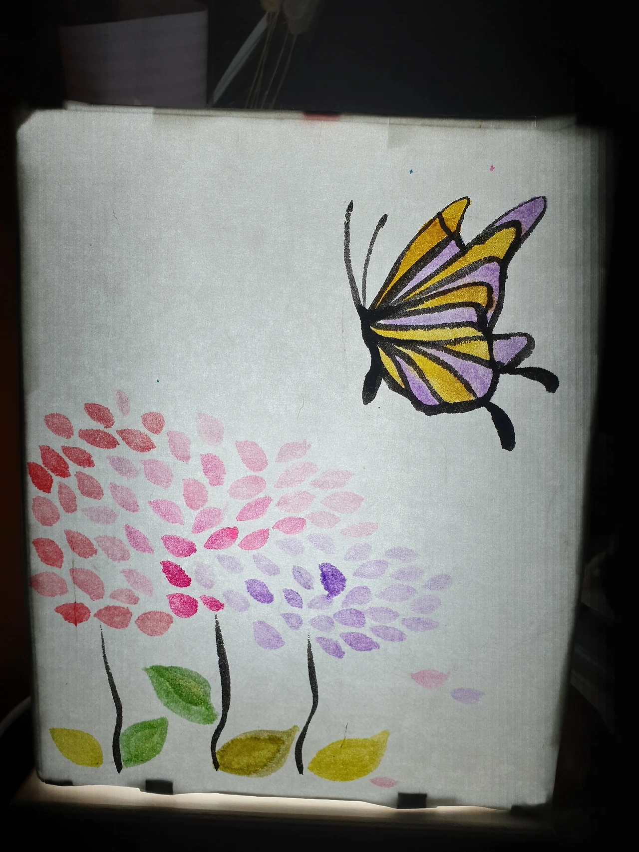 그렇게 그 순간 내 마음이 그림으로 박제되었다.그래서인지 등불에 전등을 밝히자, 내 마음도 덩달아 함께 밝아지는 듯했다. 집에서 나의 시선이 잘 머무는 티브이 옆에 놓아두니 어지럽게 휘몰아치는 듯한 내 머릿속과 새까맣게 타들어 가는 듯한 내마음속에서 흩날리는 어둠 뒤 숨겨진 곱고 밝은 빛깔이 잠잠해진 폭풍우 뒤 가만히 고개를 드러내듯, 나의 눈길이 그리고 시선이 머물 때마다 내 머릿속에서 점차 어둠이 고요히 가라앉으며 그 뒤로 감춰둔 흐릿한 실루엣이 점점 선명하게 밝아온다.요즘 여러 가지 일들로 머리가 아파 머릿속이 마냥 암흑일 줄 알았는데 내 머릿속 한편에는 지난 휴직 기간 실컷 봐온 예쁜 꽃들과 나비가 아직 날아다니고 있었음을 그림으로 꺼내 박제시켜놓고서야그 존재를알 수 있었다.그림을 보다 보면 머리 아픈 일은 희미해지고 나의 기억 한편의 좋은 추억이 점점 더 크게 자라나는 느낌이라 어떨 때는 그림 멍을 때리며 가만히 들여다보고 있기도 한다.마치 내 마음에서 오직 좋은 단편만을 가만히 꺼내놓고 들여다보는 기분이랄까. 이래서 그림을 그리며 힐링을 하나보다.