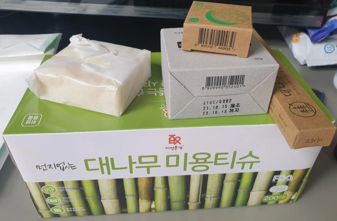 설거지 비누와 세탁비누, 대나무 미용티슈와 대나무 칫솔, 그리고 전시회에 같이 갔던 동생이 당시 관심을 가졌던 고체 치약.