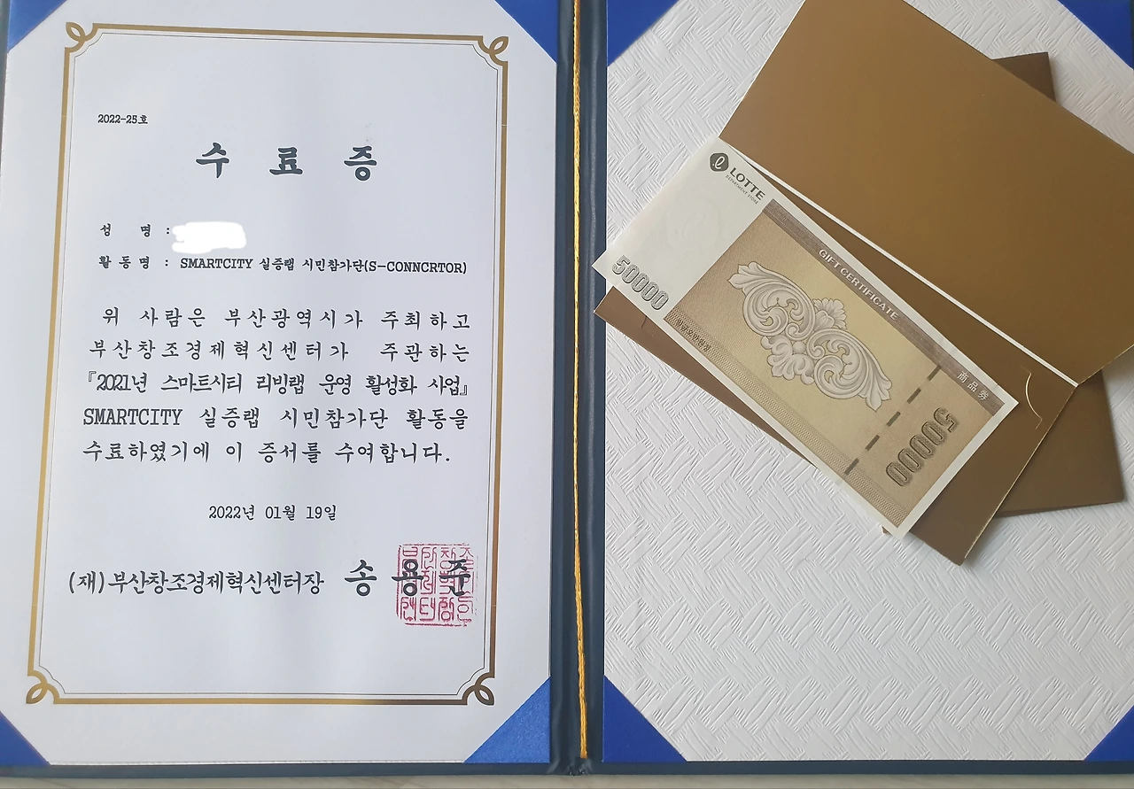 지난해 참가한 시민 참가단에서 우수시민 참가단으로 선정되어 상품권과 함께 수료증을 보내주셨네요. 원래 코로나만 아니었다면, 우수시민 참가단으로 선발된 2 사람만 대표로 직접 참가해 수료증을 수령한다고 하는데, 코로나로 부득이하게 우편으로 받아보게 되었습니다.
