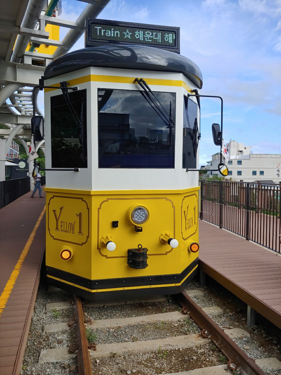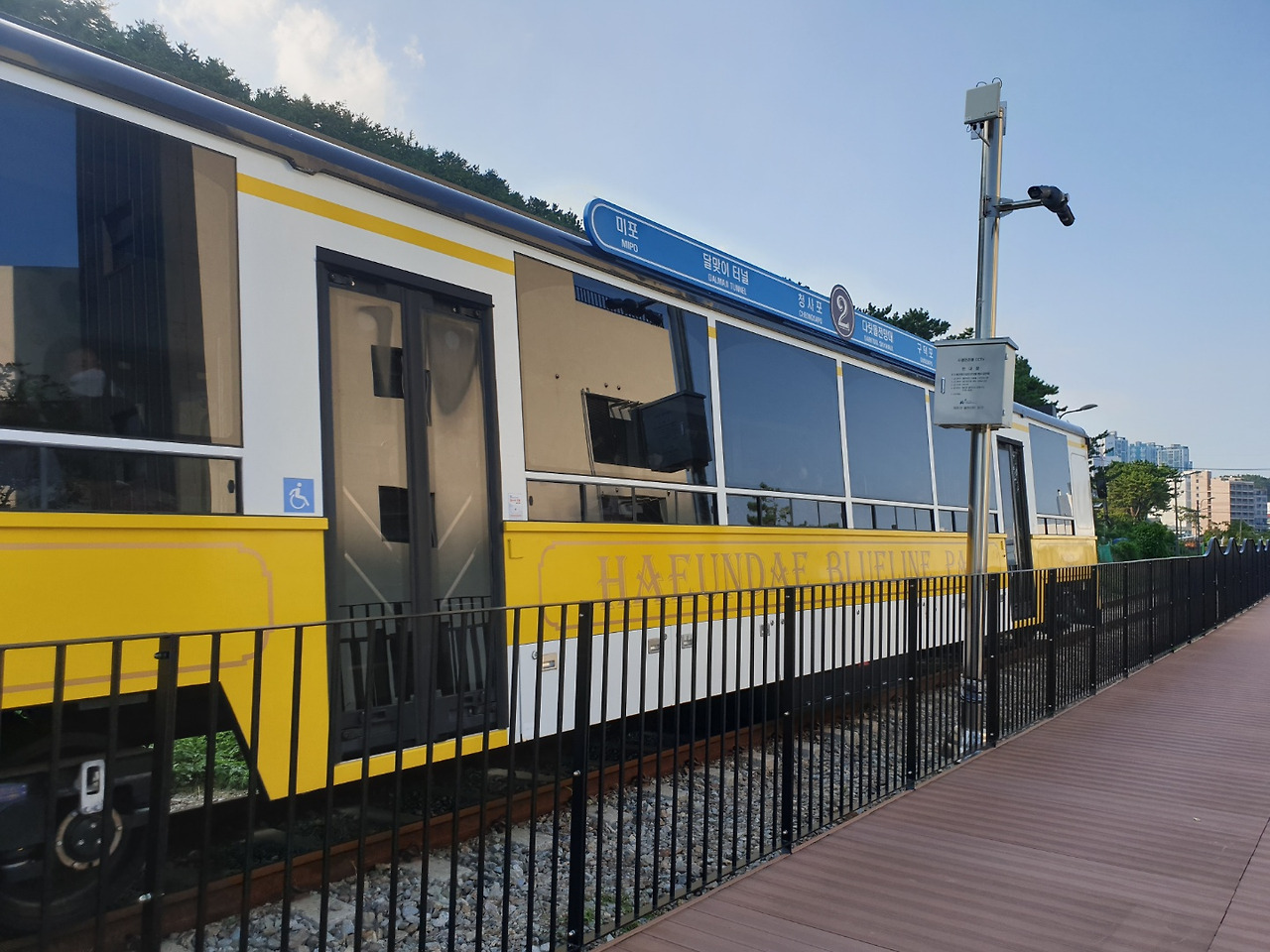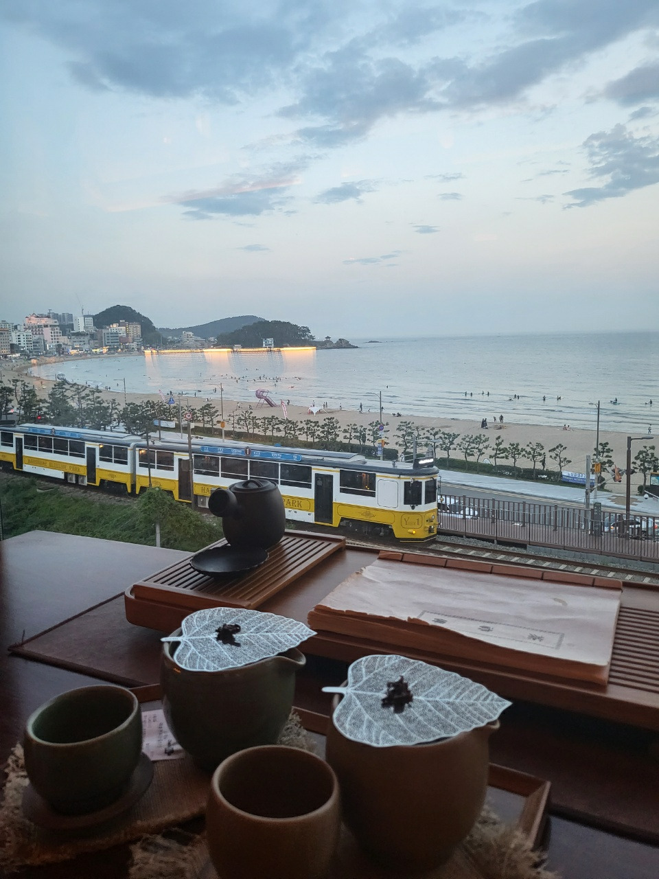 블루라인 열차가 오가는 철길이 생긴 이후, 한국적이면서도 일본 느낌도 나는 송정 카페 안 열차풍경 및 송정의 야경, 그리고 머스켓 홍차와 체리홍차 한 모금 입에 머금으면 입안 가득 퍼지는 샤인 머스켓의 향기와 마음까지 차분해지는 잔잔한 음악, 자리에 앉으면 물 반 하늘 반 한눈에 들어올 적당한 각도의 바다 뷰 카페의 정갈한 분위기에 홍차잎이 우러들 듯 가만히 젖어드는 카페. 송정과 청사포 바다라인을 따라 어디를 가더라도 따라다니는 노란빛 열차가 시야에 들어올 때마다 마치 일본에 온 듯한 착각을 준다.