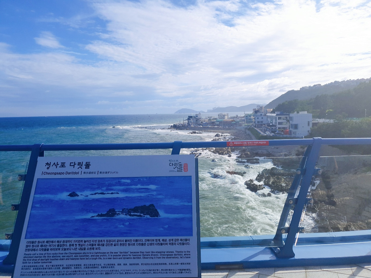 일본 느낌 나기도 하는 블루라인 열차와 스카이 캡슐, 열차 안 풍경, 구덕포와 다리돌 전망대 전경 부산 미포에서 블루라인을 타고 구덕포에서 내려 다릿돌 전망대를 구경하고 청사포까지 걸으면서 바다 풍경을 한껏 즐긴 후 허기가 질 즈음 청사포에서 바닷소리와 함께 조개구이를 구워 먹으면 꿀맛이다.