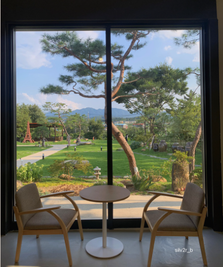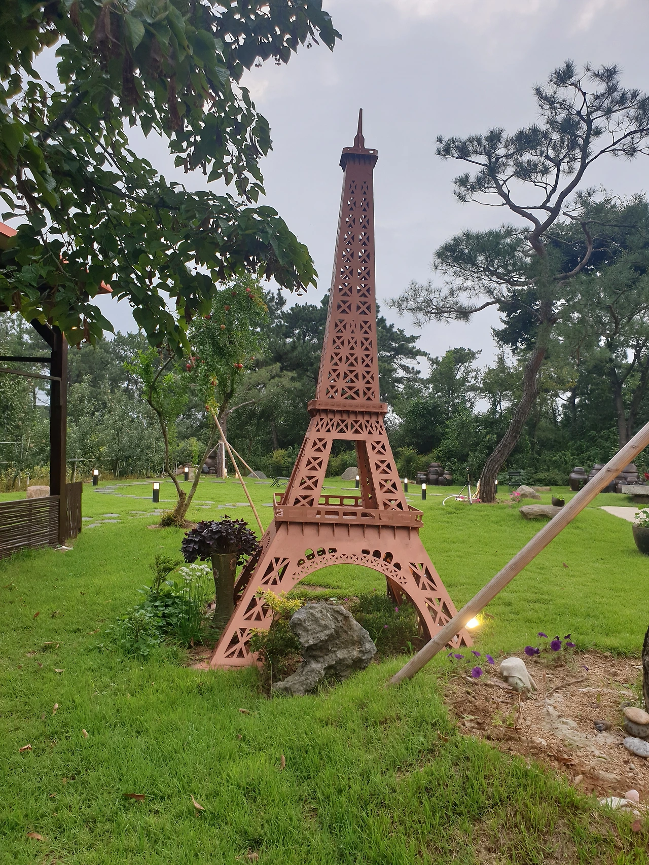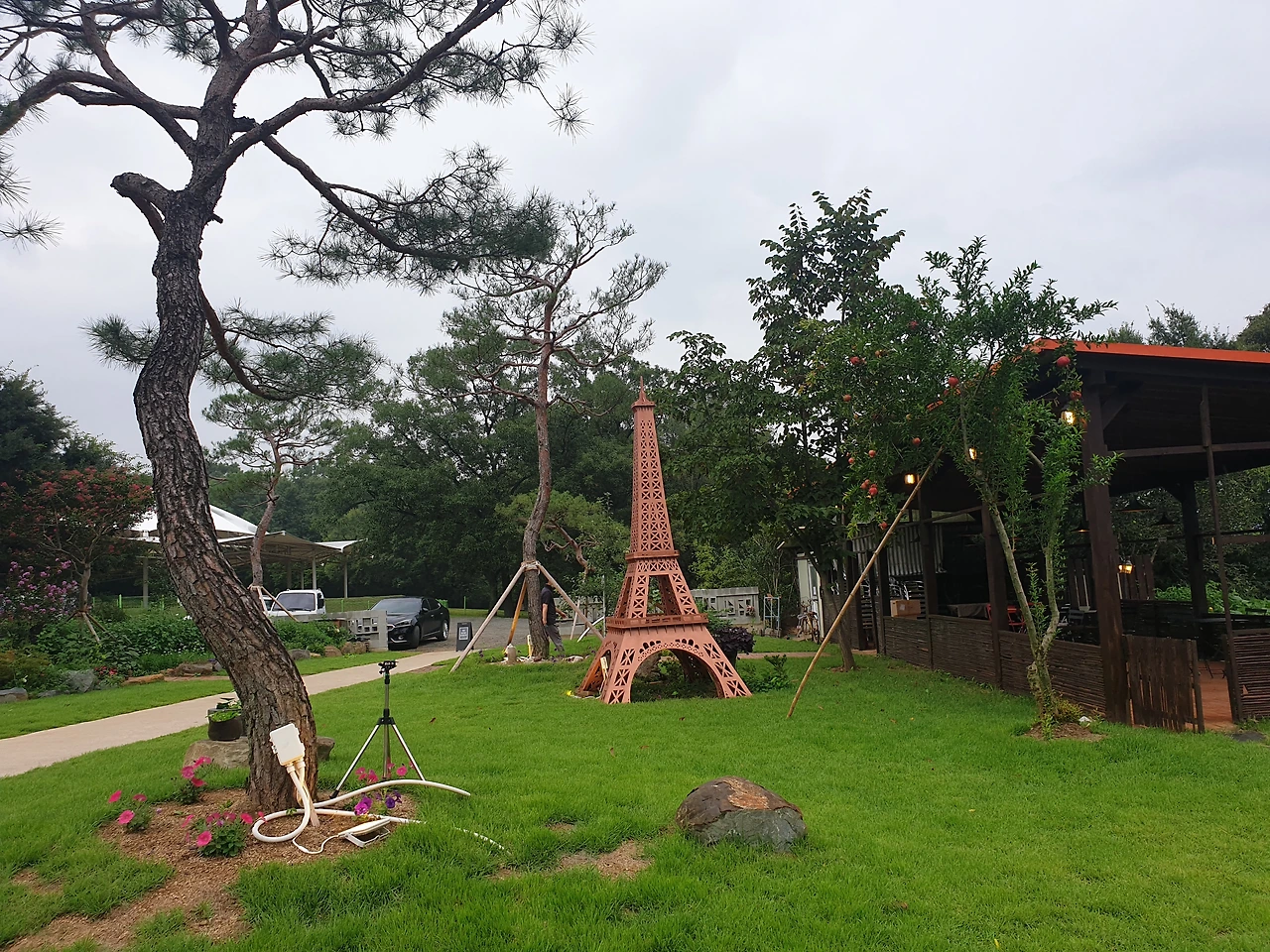 (1) 경산 카페 = 프랑스 에펠탑: 경산의 한 카페에는 귀여운 에펠탑이 있다. 한국의 미를 대표할 소나무와 빨강 열매가 인상적인 석류나무가 함께 어우러진 쓰리샷이 이색적이다. 조화인 줄 알았던 큼지막한 새빨강 꽃은 다가가 만져보니 생화였다.