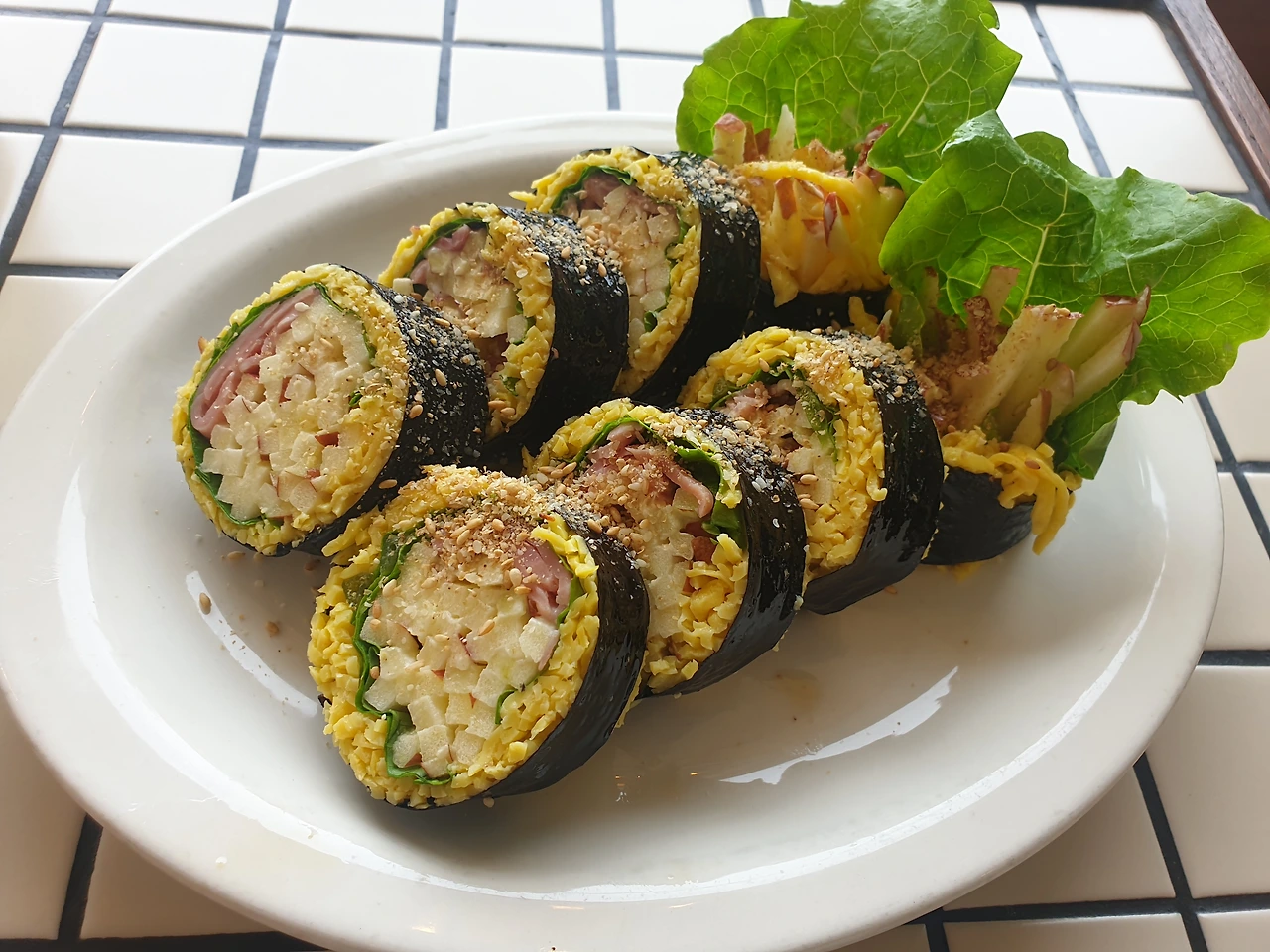 탄수화물이 많은 밥 대신 계란으로 채워진 사과 샐러드가 들어간 키토 김밥. 사과가 들어가 있어 내심 상큼한 맛을 기대했는데, 꽤나 큰 크기에 입이 째질 듯 벌려 구겨 넣은 키토 김밥의 맛은 사실 기대에 못 미쳤다. 그냥 한 끼 건강해진 것에 만족하는 걸로...