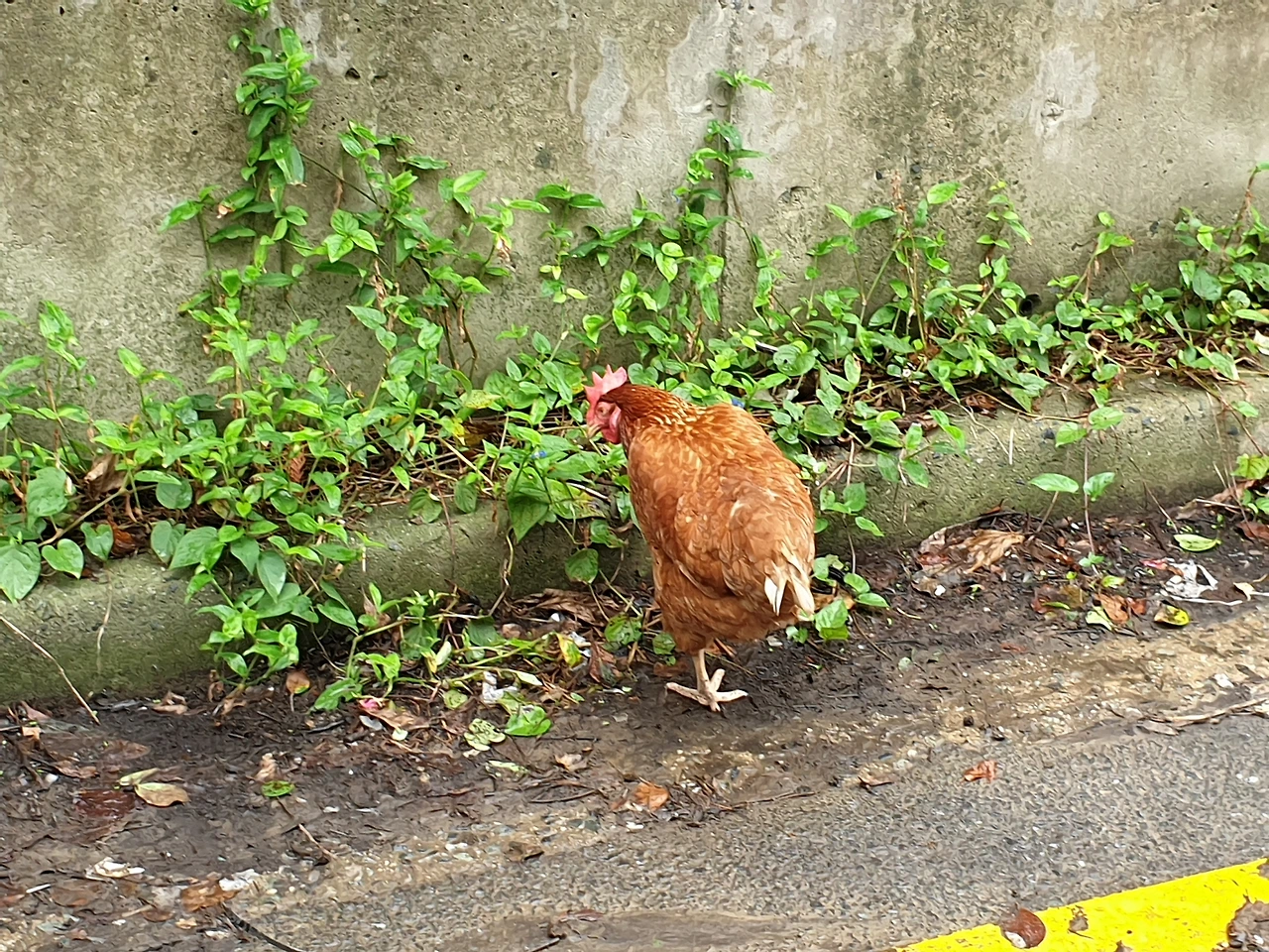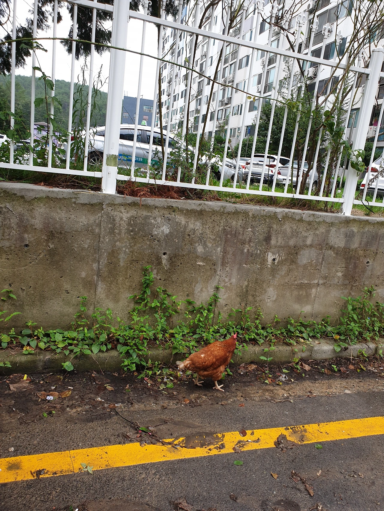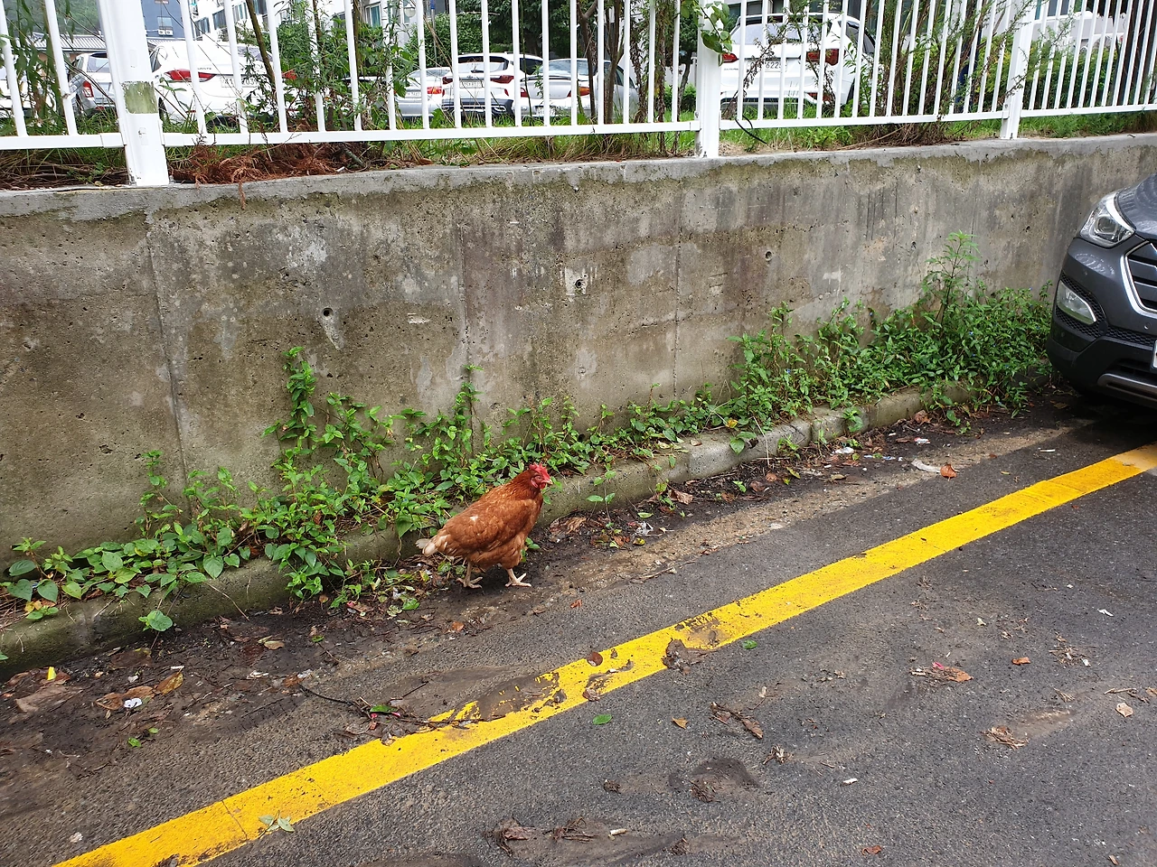 이 닭의 출처를 아시는 분 있으실까 혹시 한번 사진 올려봅니다. 어느 닭장에서 도망친 건지... 근처에 농가도 보이지 않았는데, 우리 집이 아무리 시골마을이라지만 그래도 나름 아파트 단지인데, 참 미스터리다. 동네에 개도 고양이도 아닌 닭이 돌아다니는 클래쓰....