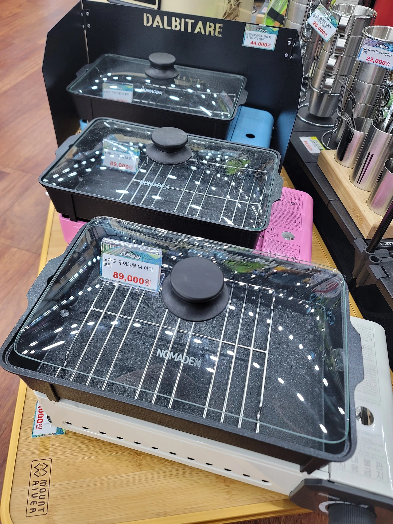 캠핑 용품 점에서 탐이 났던 다양한 조명, 구이 그릴과 마지막까지 접전을 펼쳤던 비주얼이 다한 예쁜 노란 부탄가스 버너, 생각에도 없던 불멍을 살짝 고민하게 만든 미니화로대
