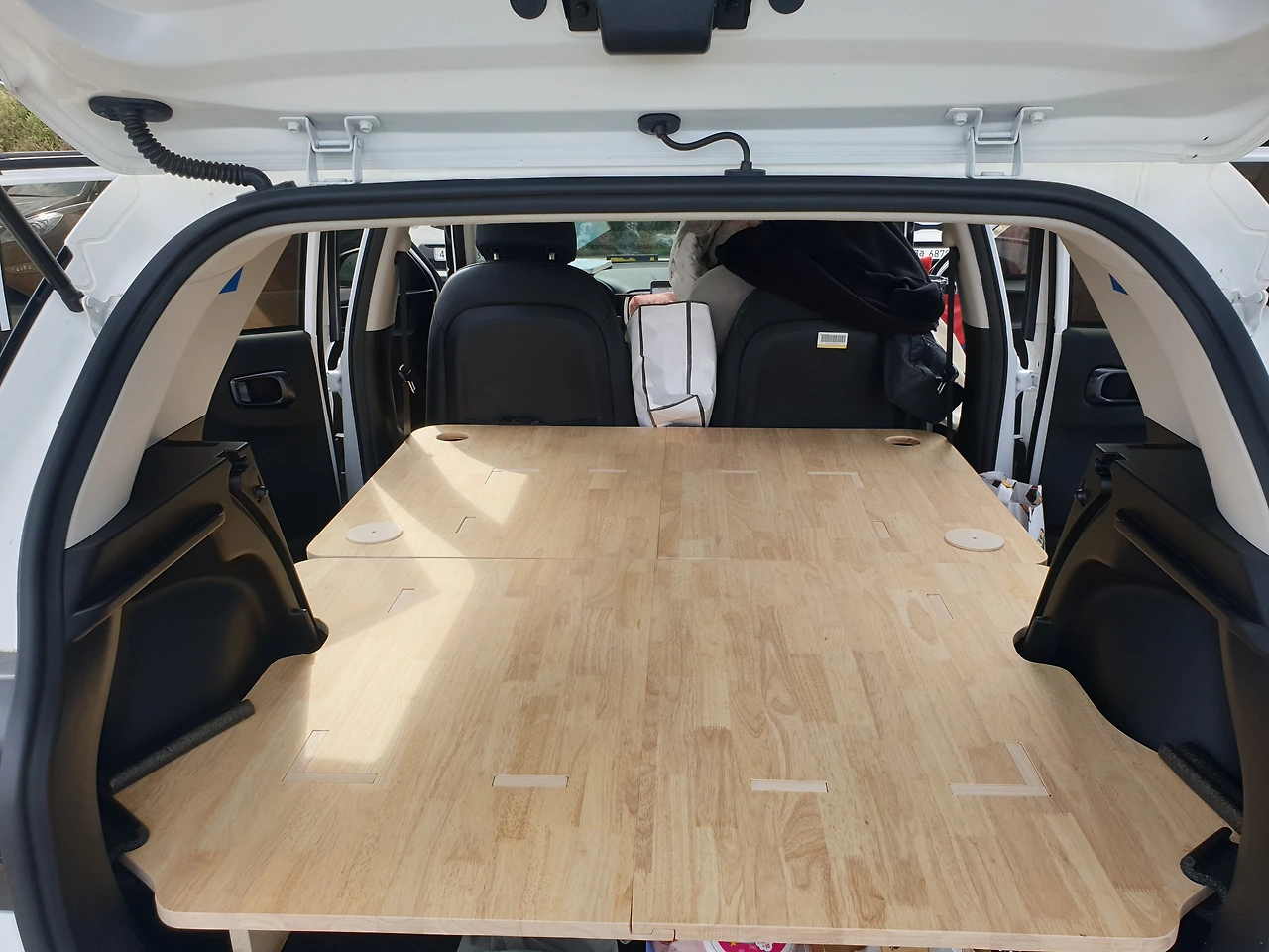 평탄화 키트는 원목이다 보니 그냥 깔아만 놔도 나름 감성과 누웠을 때 느낌이 괜찮다. 매트리스가 없어 대신 집에 있던 가장 두꺼운 덮는 겨울 이불을 그냥 깔아만 놨는데, 바닥이 평평하다 보니 누웠을 때 편안했다. 차량에 설치하는 도킹 텐트도 비교적 설치가 용이한 편.