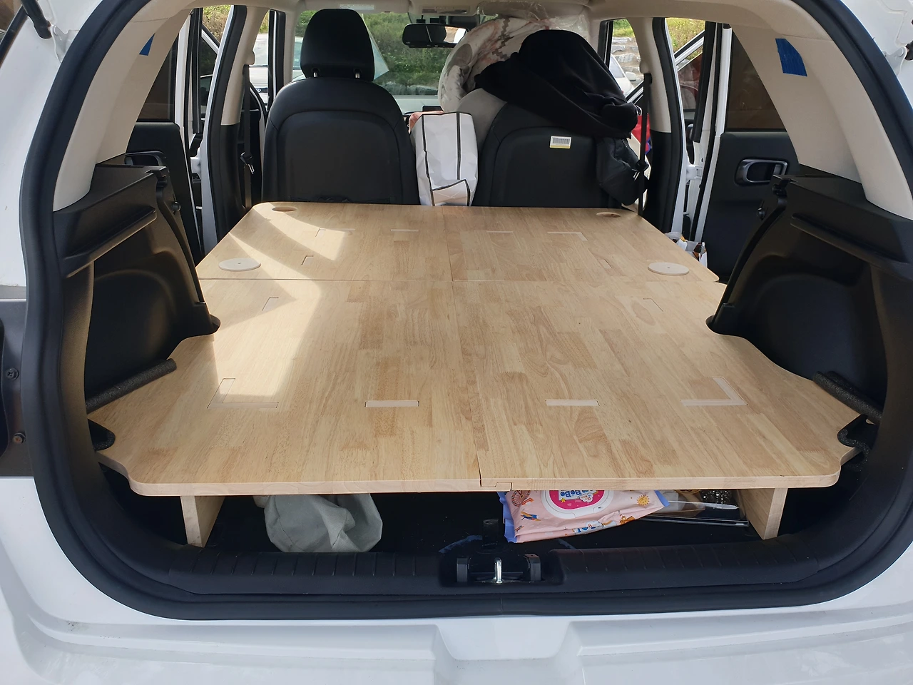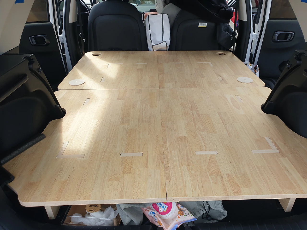 '(주)만만한 녀석들'의 원목 차박 평탄화 키트 설치 샷. 설치가 홈대로 맞추기만 해서 어렵지 않다. 아래 남는 공간에 신발이나 간단한 물품을 나둘 수 있고, 물컵 홀더도 있다.