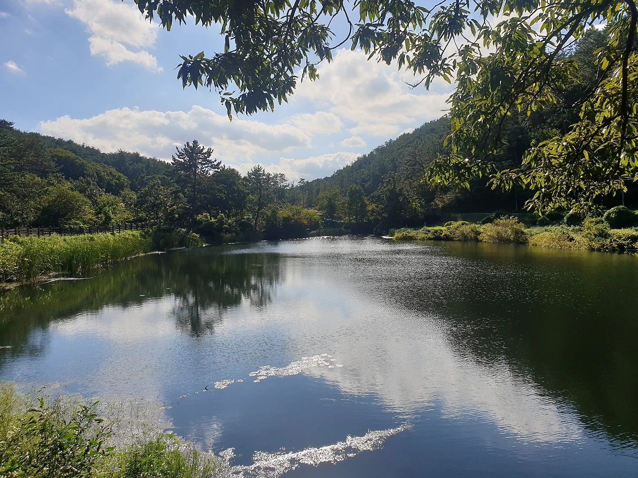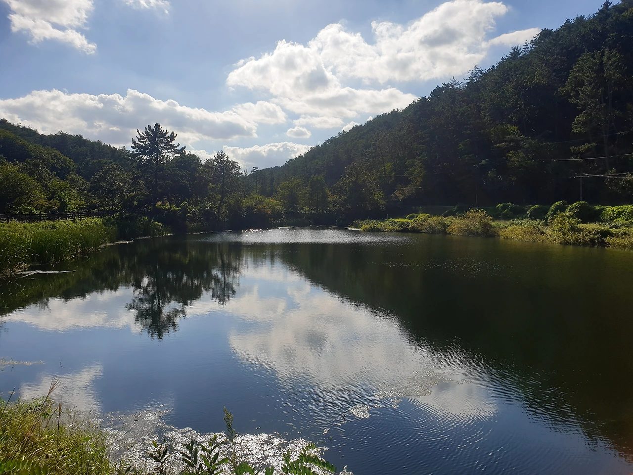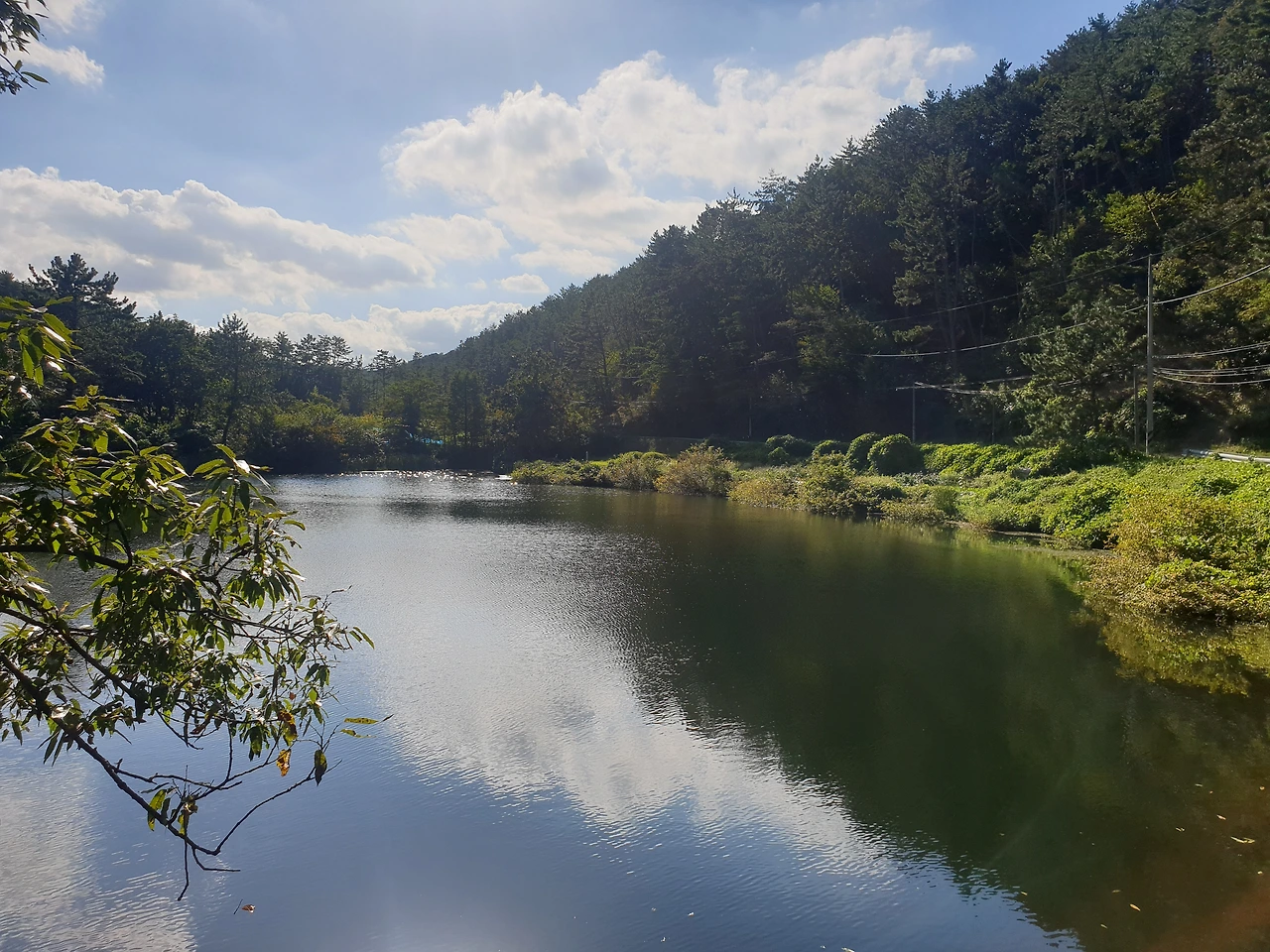 경산 반곡지가 여기 있었나 싶은 하늘을 거울삼아 비춰주는 예쁜 저수지가 있다. 이보다 고운 스케치북이 있을까 싶을 정도로 자연의 물감을 곱게 풀어 산과 하늘을 데칼코마니처럼 그려 넣은 듯한 저수지다. 여기까지 닿는데 느린 내 걸음으로 10~15분 정도 소요된다. 한창 아프던 겨울의 끝자락에는 이 짧은 거리의 저수지까지 걸어오려다 그만 오른쪽 다리가 아파와 이내 저수지 구경도 못한 채 포기하고 돌아간 적도 많았다. 겨우내 밖에만 나가도 추위에 어깨가 움츠려 들어 그런지 목, 어깨가 아려와 한참 아픔으로 고생한 기억에 나는 지금도 겨울이 다가오고 있음이 두렵다. 그래서 였을까. 나는 항상 이 저수지까지만 돌고 정자가 보이면 다시 발길을 되돌려 집으로 향한다.
