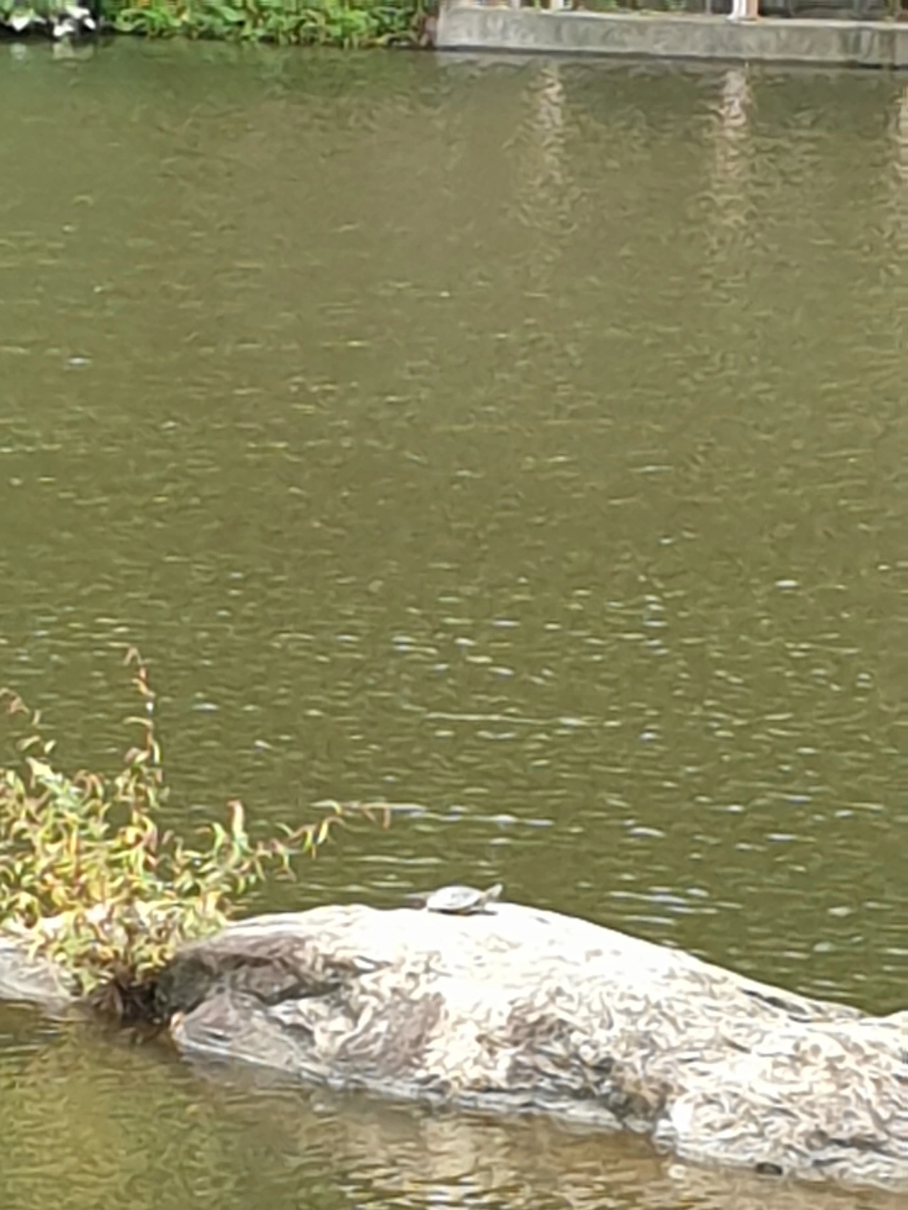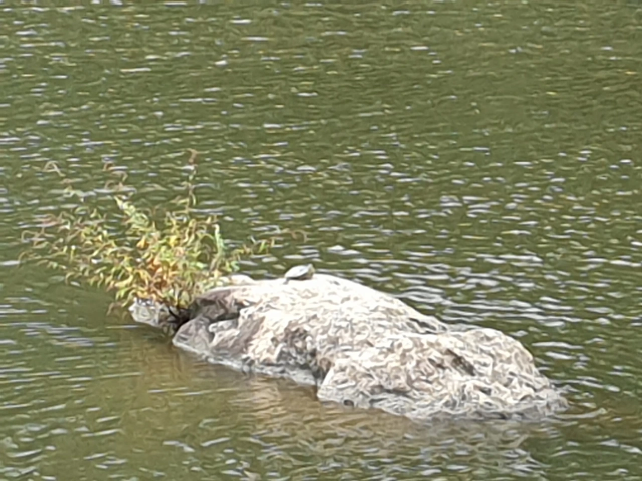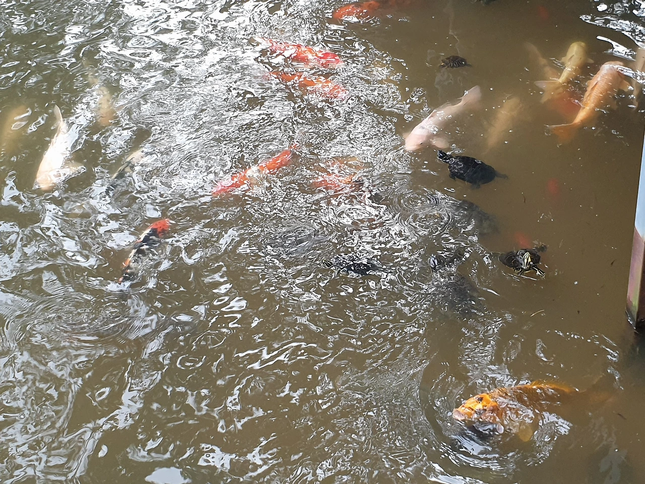 벤치도 앉아보았다가, 처음 보는 풍경들을 찬찬히 훑어가며 천천히 걷다 보니 큰 저수지는 생각보다 가까이 있었다. 저수지는 아이들 놀이터나 어르신들 운동기구 화장실 테이블과 벤치, 테니스, 배드민턴 네트 등 편의시설이 꽤 잘 되어있다. 자라의 태닝 포인트는 볼 때마다 항상 같은 바위다. 좋은 햇살을 알아보는 건 사람이나 동물이나 매한가진가보다. 놀이터 부근에서 한 아이가 잉어와 자라에게 먹이를 주고 있자니 물에 숨어 있는 줄도 몰랐던 잉어 떼와 자라 떼들이 얼굴을 빼꼼히 내밀어 존재감을 부각한다.