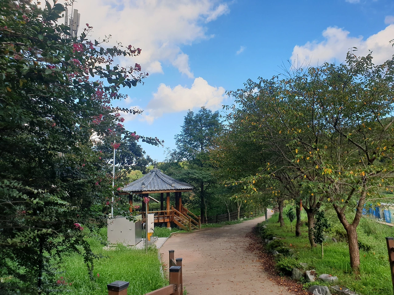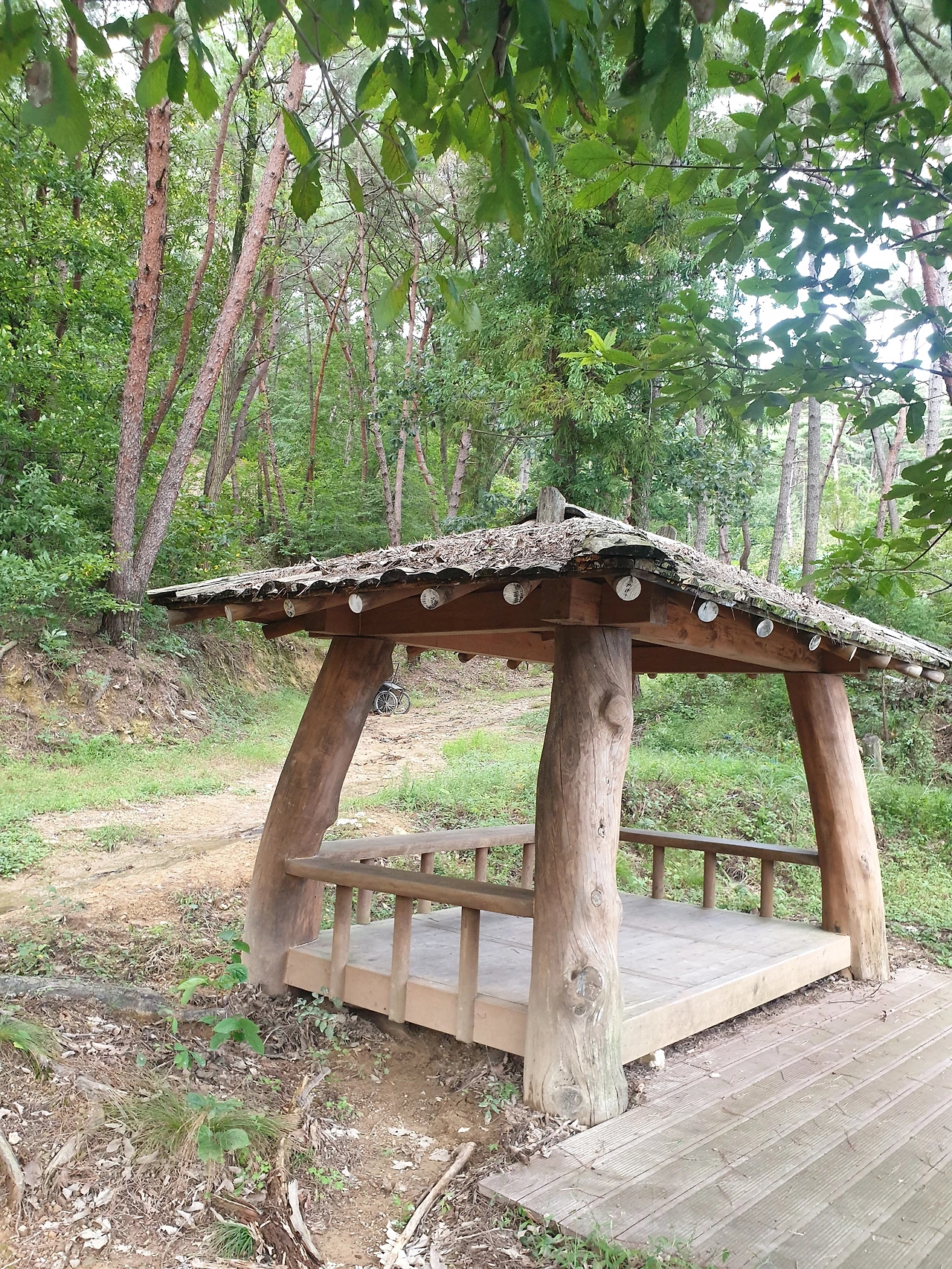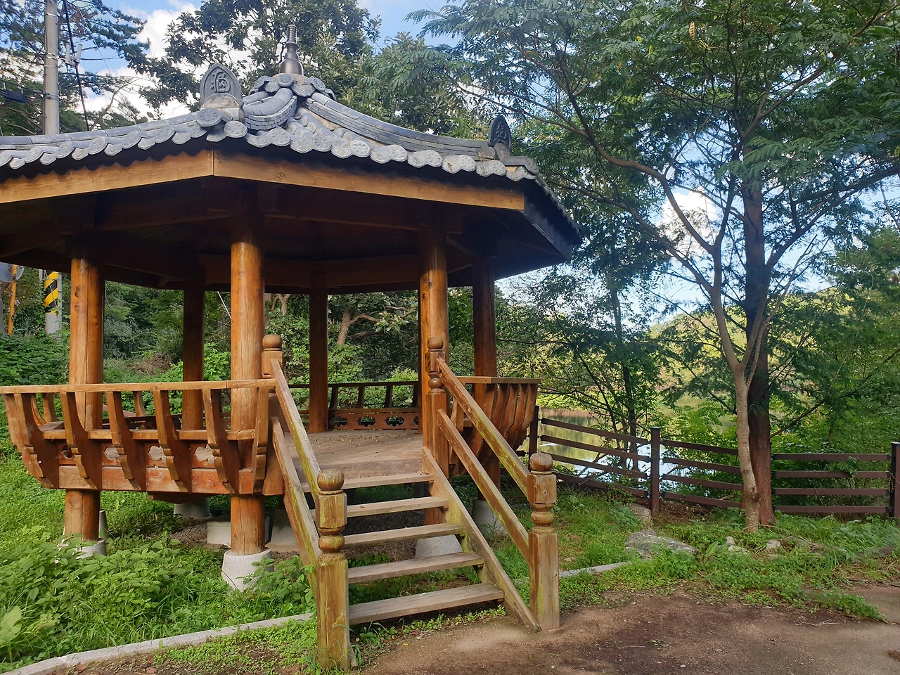 나의 노선의 변곡점이 된 저수지 정자. 여기에서 기계로 신발에 묻은 흙을 한번 털어주고 턴해서 다시 왔던 길을 되돌아 간다.