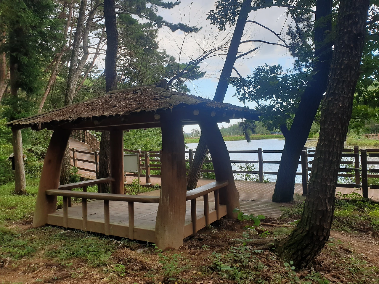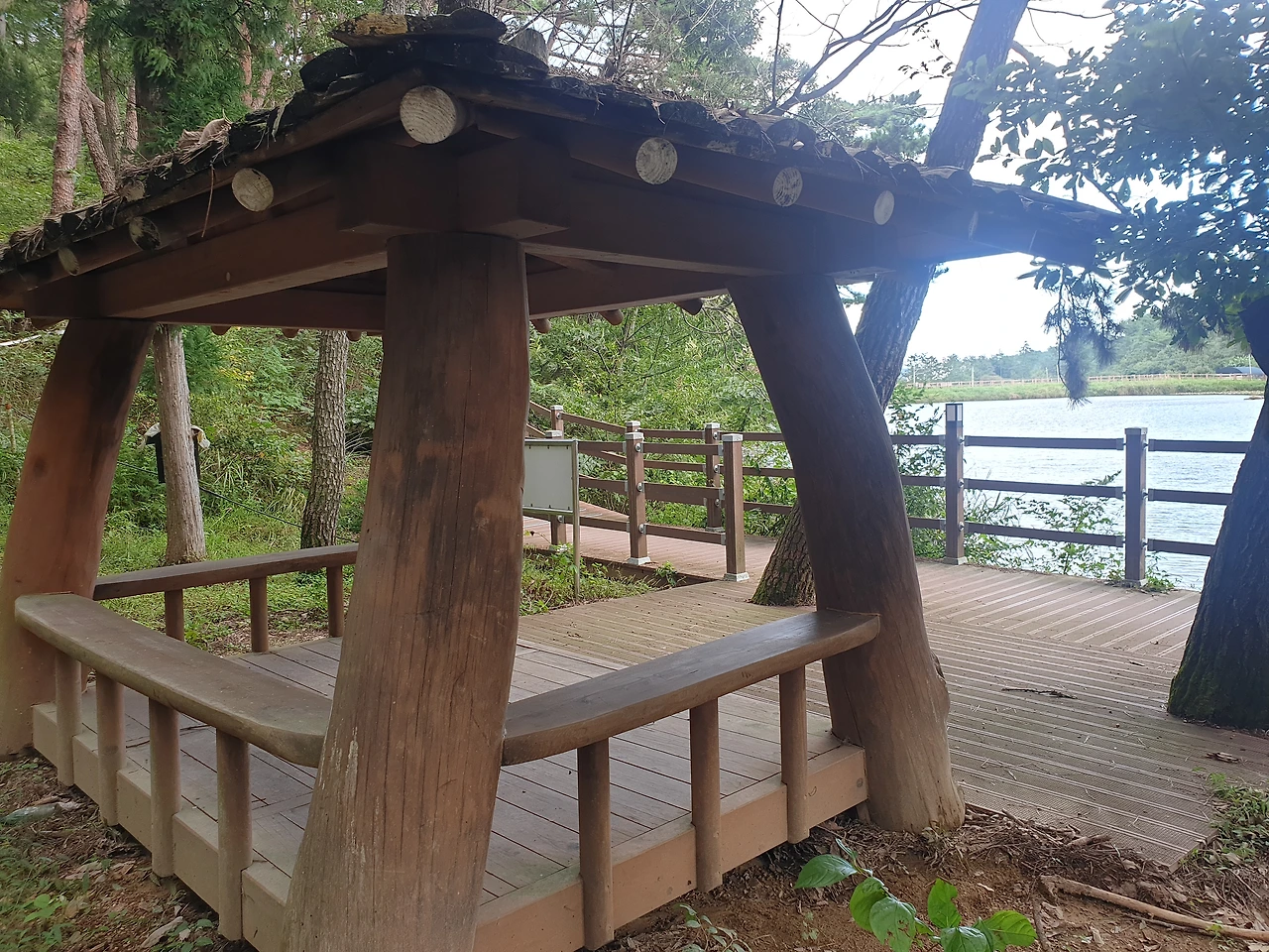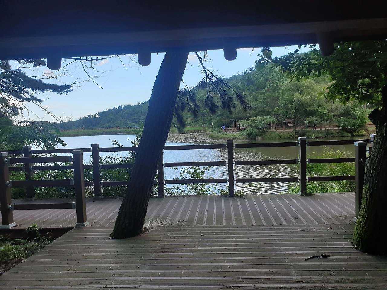나의 노선의 변곡점이 된 저수지 정자. 여기에서 기계로 신발에 묻은 흙을 한번 털어주고 턴해서 다시 왔던 길을 되돌아 간다.