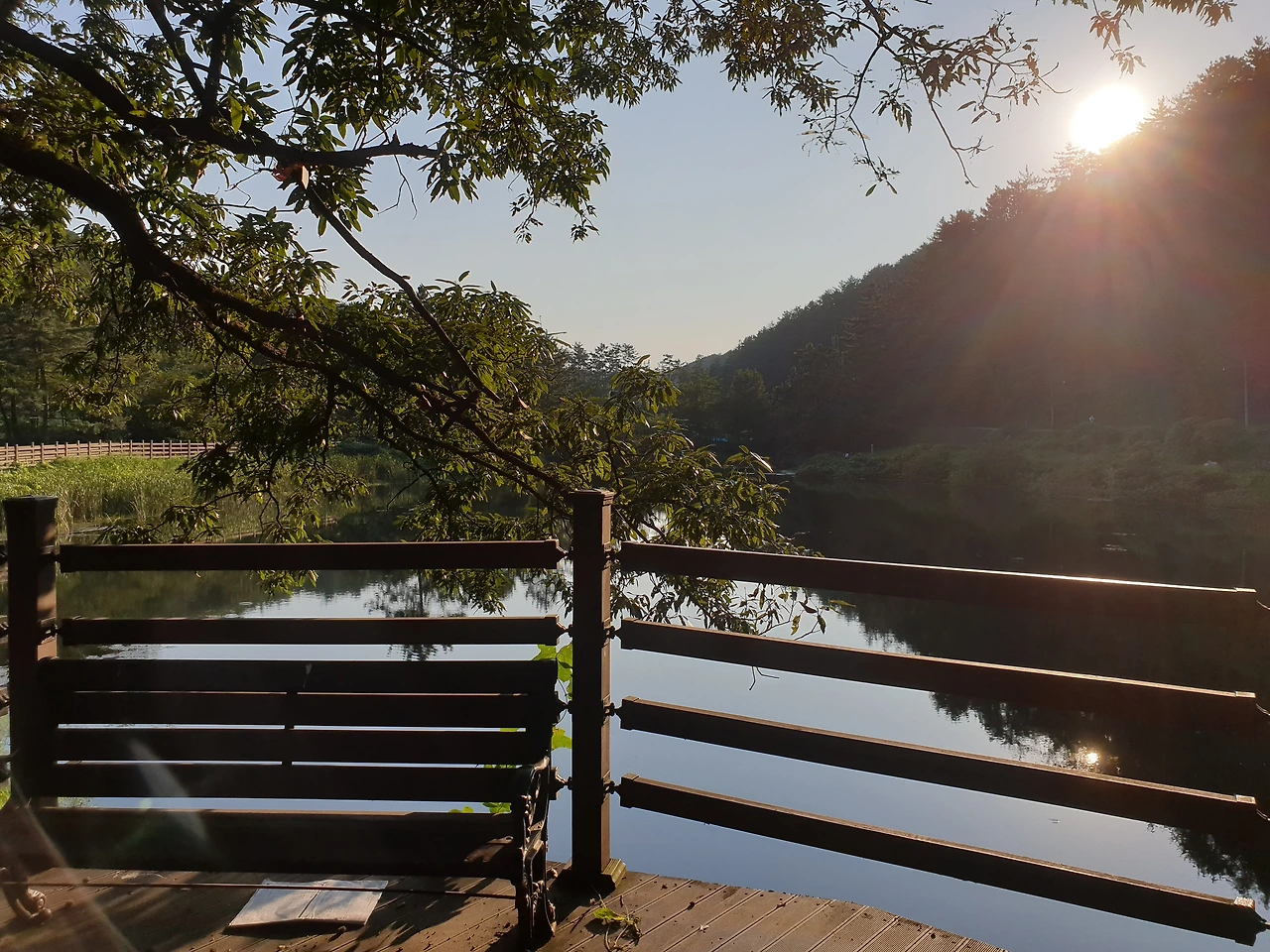 저수지를 한 바퀴를 돌고 햇빛에 따스하게 데워진 벤치에 앉아 있으니, 살랑이는 바람결이 만들어낸 잔물결이 그려내는 저수지를 바라보며 덩달아 춤추는 눈과 벤치의 온기로 따스한 등, 벤치에 앉아 잠시나마 편안해진 다리와 감미로운 음악으로 호강 중인 귀와 맑은 공기에 이따금 바람에 실려오는 풀향과 꽃향으로 코까지 모두가 만족하며 힐링 중이다.