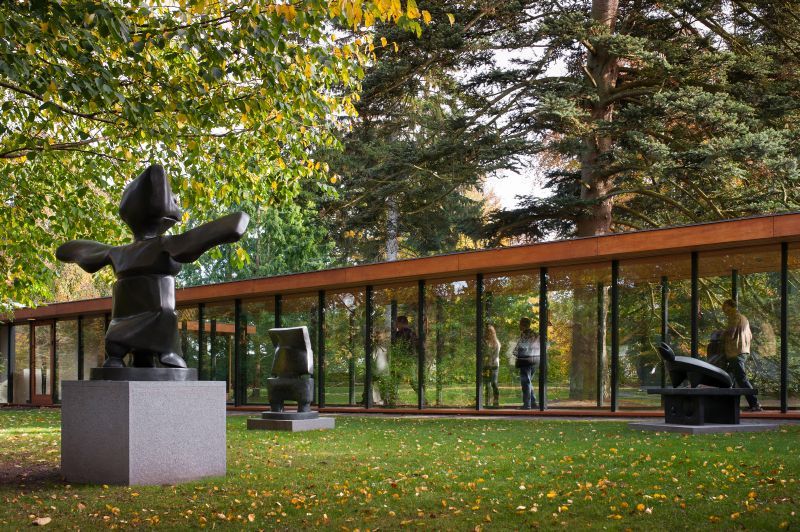 깊숙히 쏟아지는 빛, 우직한 고목과 흩날리는 나뭇잎, 푸른 풀밭. 유리 너머 펼쳐진 풍경은 검은 프레임 속 하나의 그림과 같다. 길이 꺾어지는 모퉁이 사이로 배치된 조형들은 저마다의 작은 전시회를 연다. 해의 움직임과 날씨의 변화, 계절의 흐름 속에서 단 하루도 같은 모습이 없는 작품들이다.