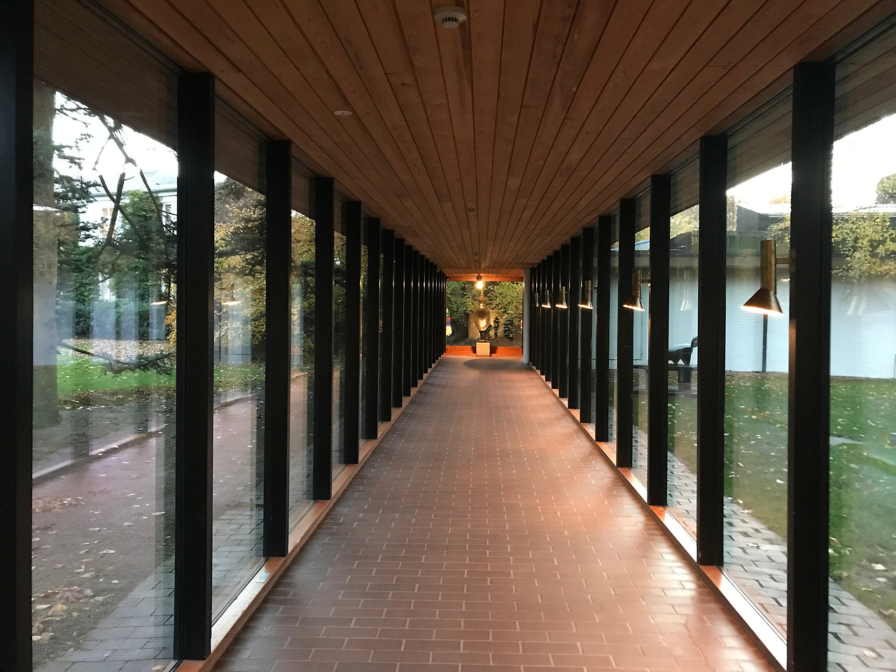 창립자 Jensen은 갤러리 중 하나는 이 풍경을 바라볼 수 있도록 건축가들에게 요청했다고 한다. 그리 넓지 않은 호수는 그 일부만 미술관 부지와 맞닿아 있어, 조망을 만들기 위해서는 건물이 향하는 방향을 제한해야 했다. 동시에 저택으로 이어지는 통로와의 연결, 바다를 조망하는 다른 공간과의 연결도 고민해야 했다. 또한 갤러리를 세울 부지는 둑처럼 솟아 있어, 아래 호수와의 단차도 고민이 되었을 것이다. 지면과 나란한 단층 건물을 쭉 이어 지었어도 호수는 멀찍이 내려다 보였을 테지만, 이들은 보다 적극적으로 풍경을 끌어들이고 그 속에 사람들이 머무르길 원했던 것 같다.