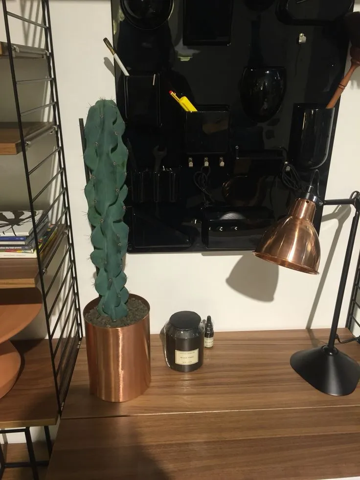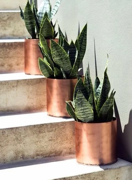 쿠퍼 소재의 화분은 금속이라는 물성이 가진 깔끔한 느낌과 함께 은은한 빛으로 식물을 돋보이게 한다. 쿠퍼가 수분에 매우 약하기 때문에 관엽식물보다는 한참동안 물을 주지 않아도 되는 선인장, 산세베리아 등 다육식물이 적합하다. 시각적으로도 모양 자체가 딱 잡혀있는 다육식물들이 쿠퍼의 모던함과 잘어울린다고 생각한다. 게다가 화학처리를 하지 않은 쿠퍼는 세균 증식을 억제하기 때문에 식물이 더 건강하게 자란다는 소소한 이점도 있다.