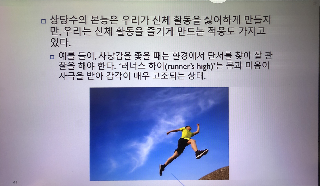 수렵 채집 생활에서 먹이를 찾아 이동하고 먹잇감을 발견하면 ‘지구력 달리기 (endurance running)’을 통해 사냥을 했던 인류.