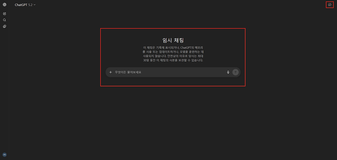 ChatGPT에는 "임시 채팅"이라는 기능이 존재합니다. 이는 휘발 세션으로써 사용자의 장기기억 메모리를 사용하거나 저장하지 않을 뿐만 아니라, 모델을 훈련하는데 사용되지 않는다고 명시되어 있습니다. ChatGPT 메인 화면에서 오른쪽 상단에 위에 있는 버튼을 통해 임시 채팅을 활성화할 수 있으며 다음과 같은 화면으로 활성 여부를 판단할 수 있습니다.
