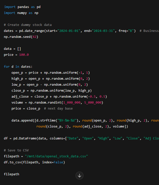 코드 인터프리터가 파이썬 코드를 생성하고 실행하여 가상의 주가 데이터가 담긴 openai_stock_data.csv를 생성했습니다. 여기서 ChatGPT가 생성한 코드의 내용자체는 중요하지 않습니다. 중요한 것은 ChatGPT가 가상 데이터를 생성하기 위해 내부적으로 코드를 생성하고, 실제로 해당 코드를 실행하여 데이터를 작성했다는 것입니다.