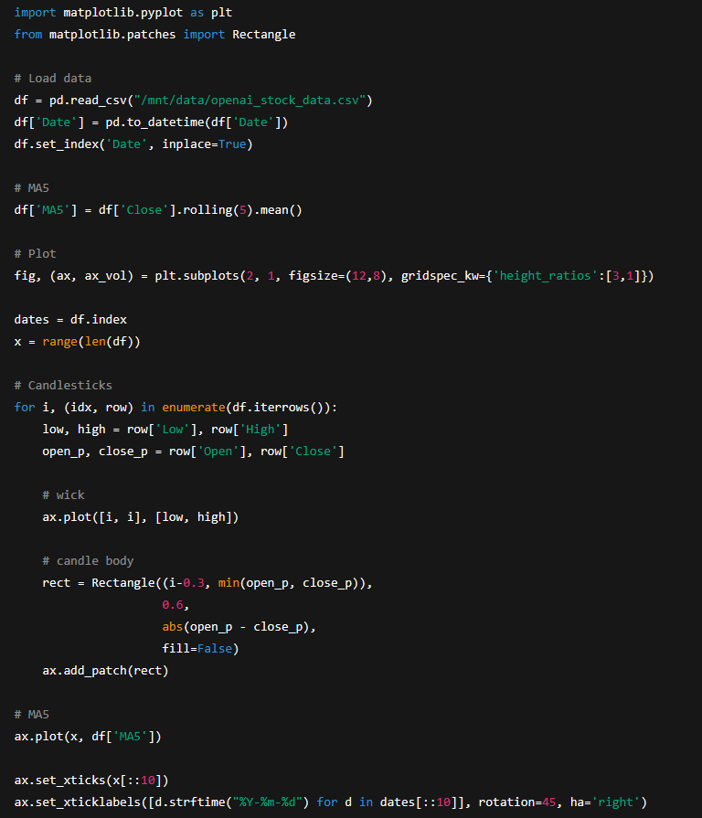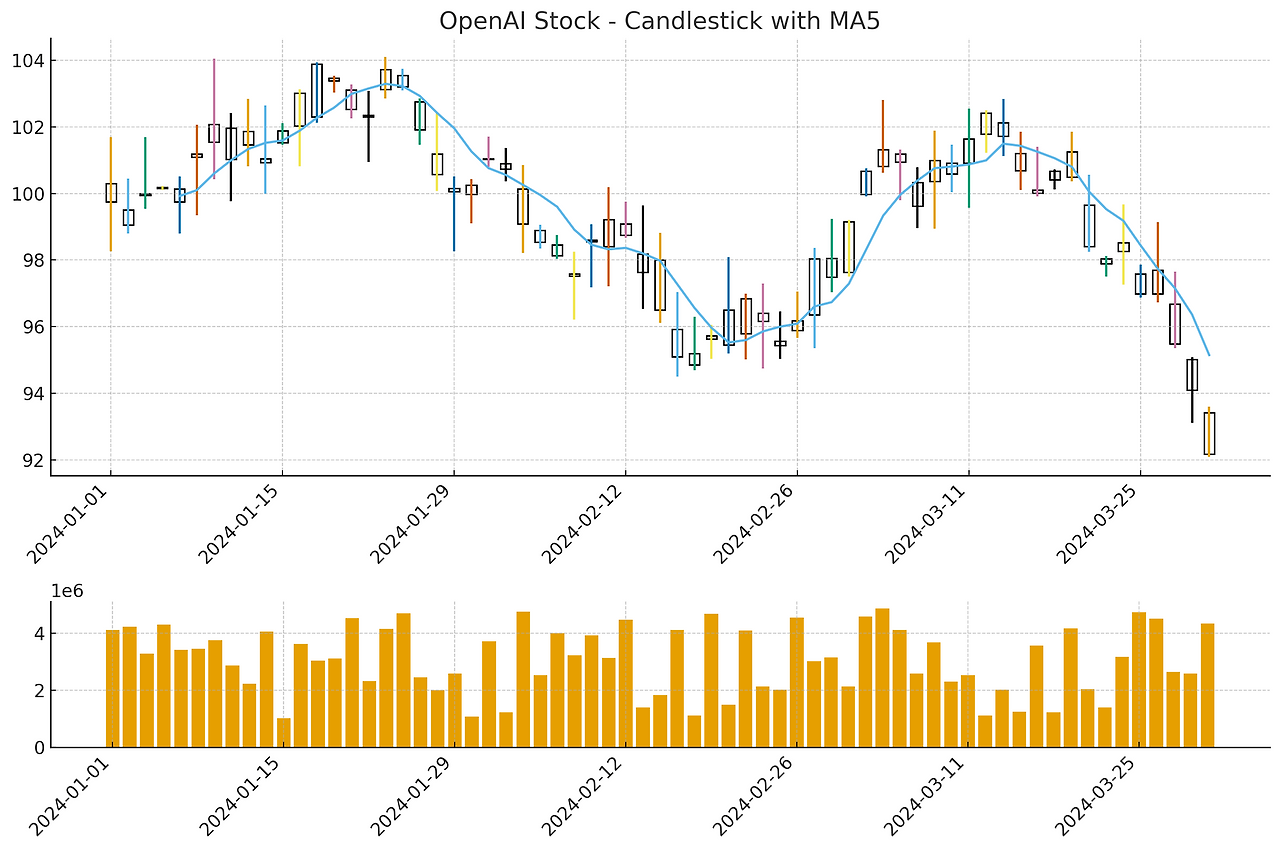 첨부된 openai_stock_data.csv는 OpenAI가 상장되었다는 가정하에 작성된 가짜 주가 데이터입니다. 이를 토대로 일봉과 MA5 지표를 포함하여 캔들 차트로 나타내세요.