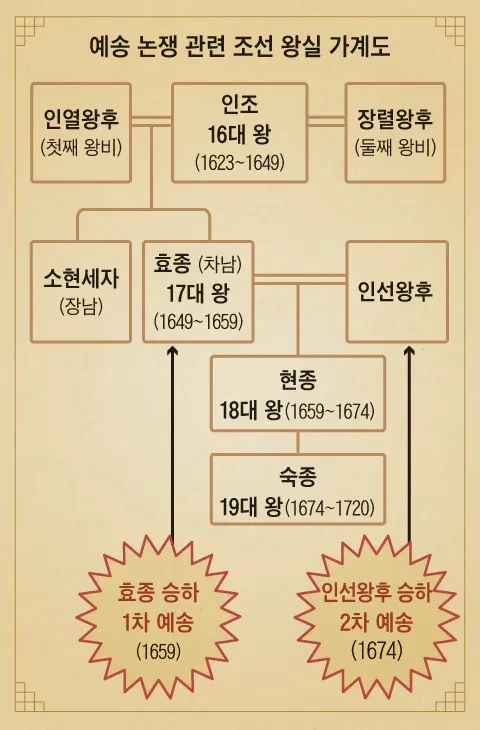 당시 여당이었던 서인은 효종은 장남이 아니라 차남이었으니까 1년을, 야당이었던 남인은 그래도 적통이니까 3년을 주장했다. 장렬왕후 입장에서는 효종이 "내 배 아파" 낳은 자식도 아닌데 아무려면 어떻냐 싶겠지만, 그게 아니다. 효종의 정통성을 건드린다는 걸 잘 알고 있었다. 이기는 쪽이 내편이다. 1년으로 결론 났고, 여당은 야당을 KO패 시켰다.